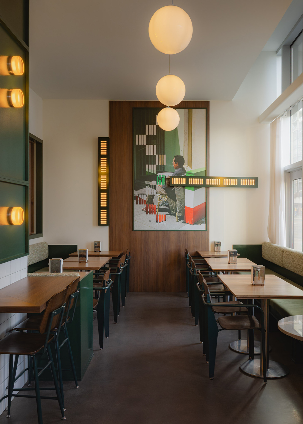 Va!, named for the Italian word “go,” draws from the tradition of Roman fornos and caffès. The design balances practical durability with visual familiarity: stainless steel surfaces, natural walnut, green-and-white ceramic tiles, and high-gloss painted finishes. The art programme, featuring custom in-house made collages, integrating Chef Daniel’s photography introduces a personal reference within the space. Curated shelving displays vinyl records, Italian pantry staples, and curated merchandise while the menu featuring familiar Italian flavors without formality and a distinct coLee program. The layout invites pause or pace, whether grabbing a slice after work, browsing records while a caffè is poured, or meeting a friend before the day begins.