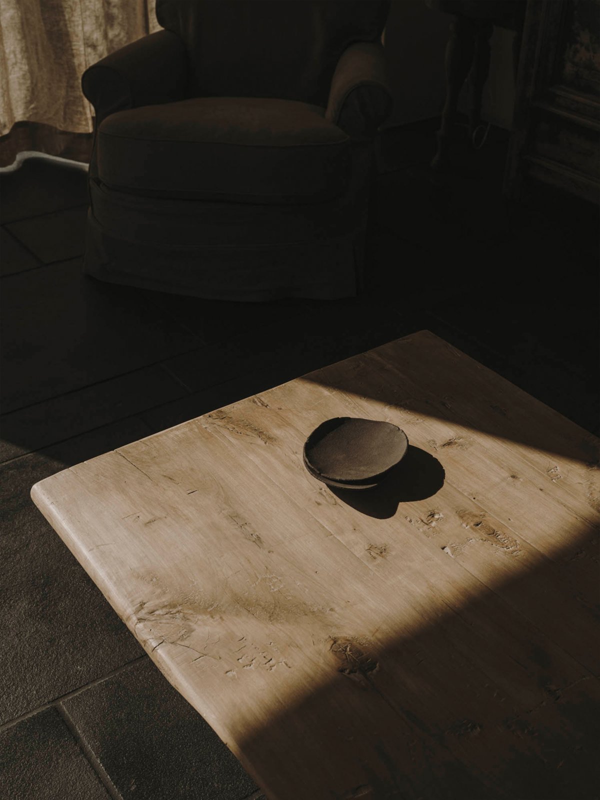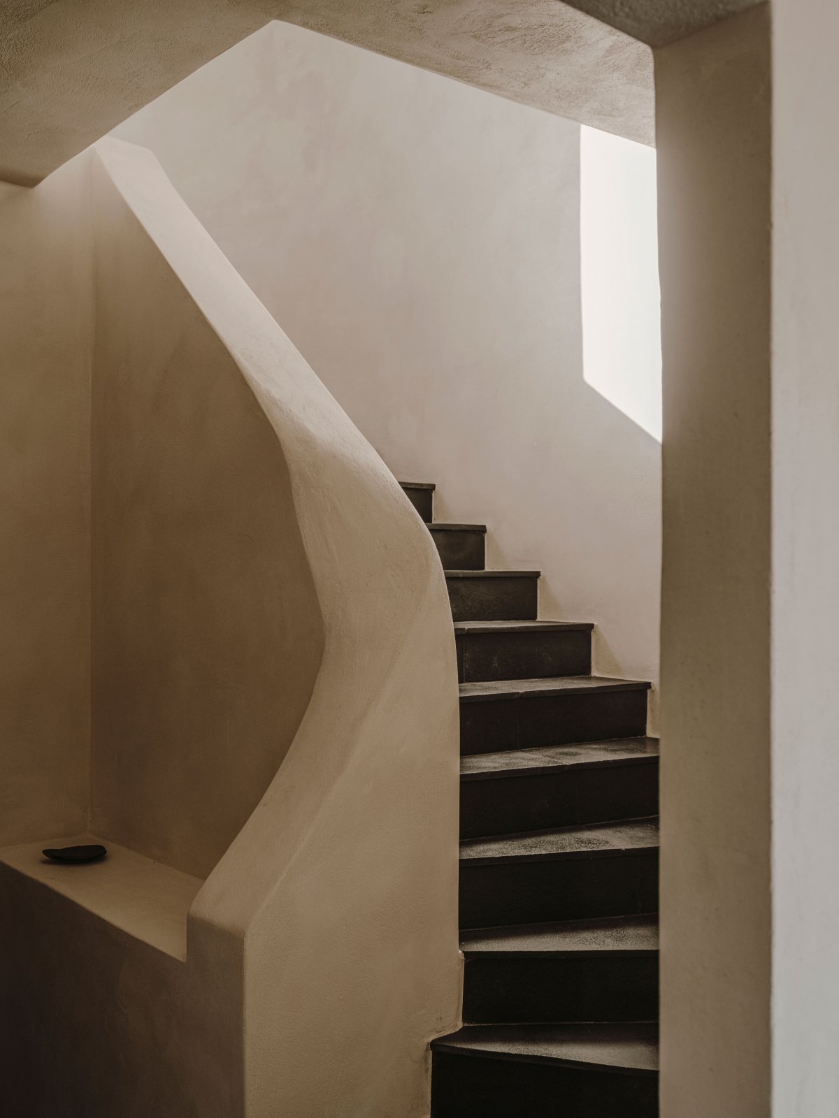 Guests must descend a twisted weathering steel staircase to reach the basement, where the mood is decidedly more somber. Apart from a small amount of light provided by a chandelier, light only trickles into the space through a narrow opening left in the ceiling. Vintage furniture is sprinkled throughout to soften the space's harsh industrial feel. Heavy sand-colored linen curtains give a warm feeling to the natural light streaming through the Windows.