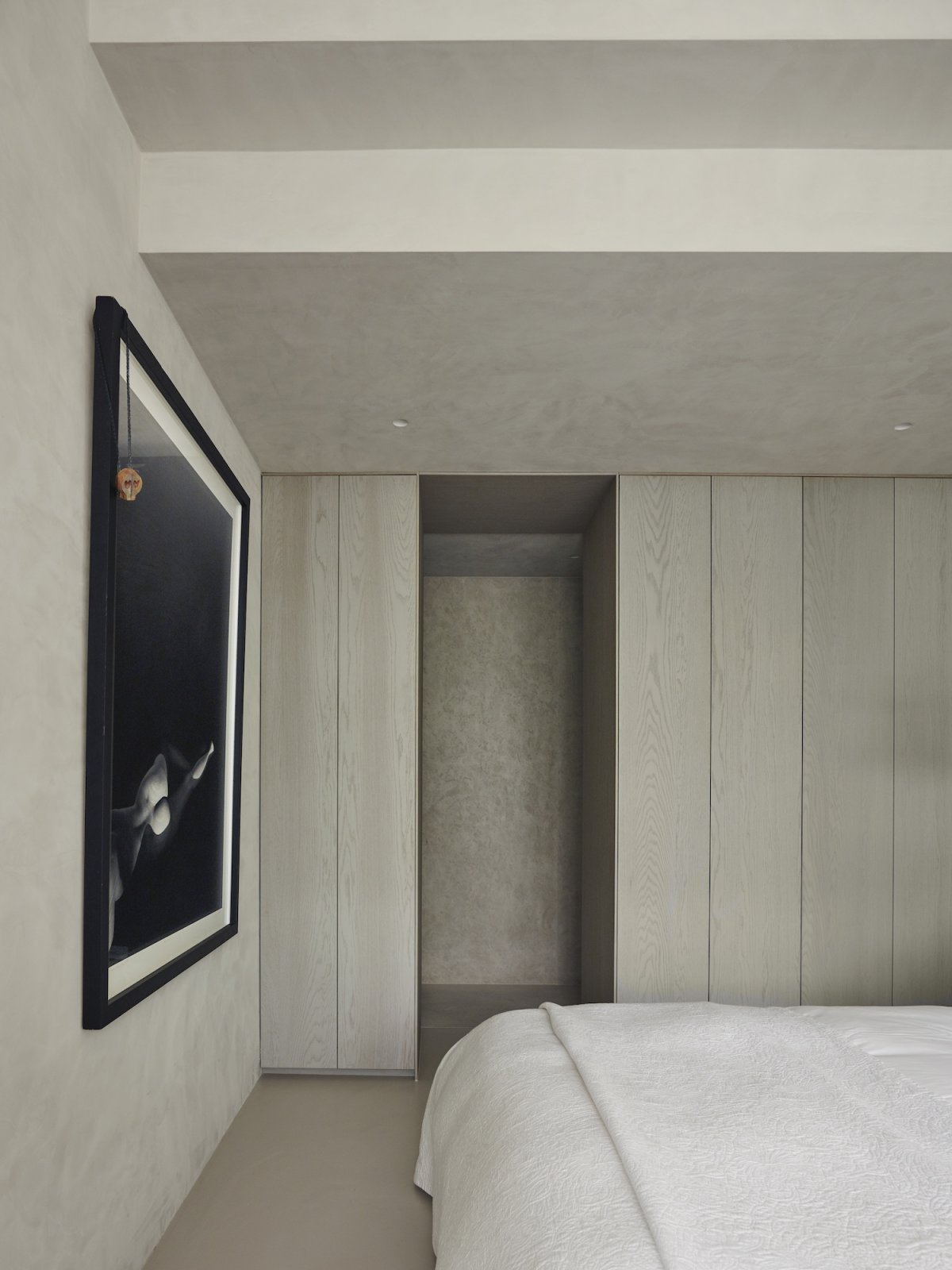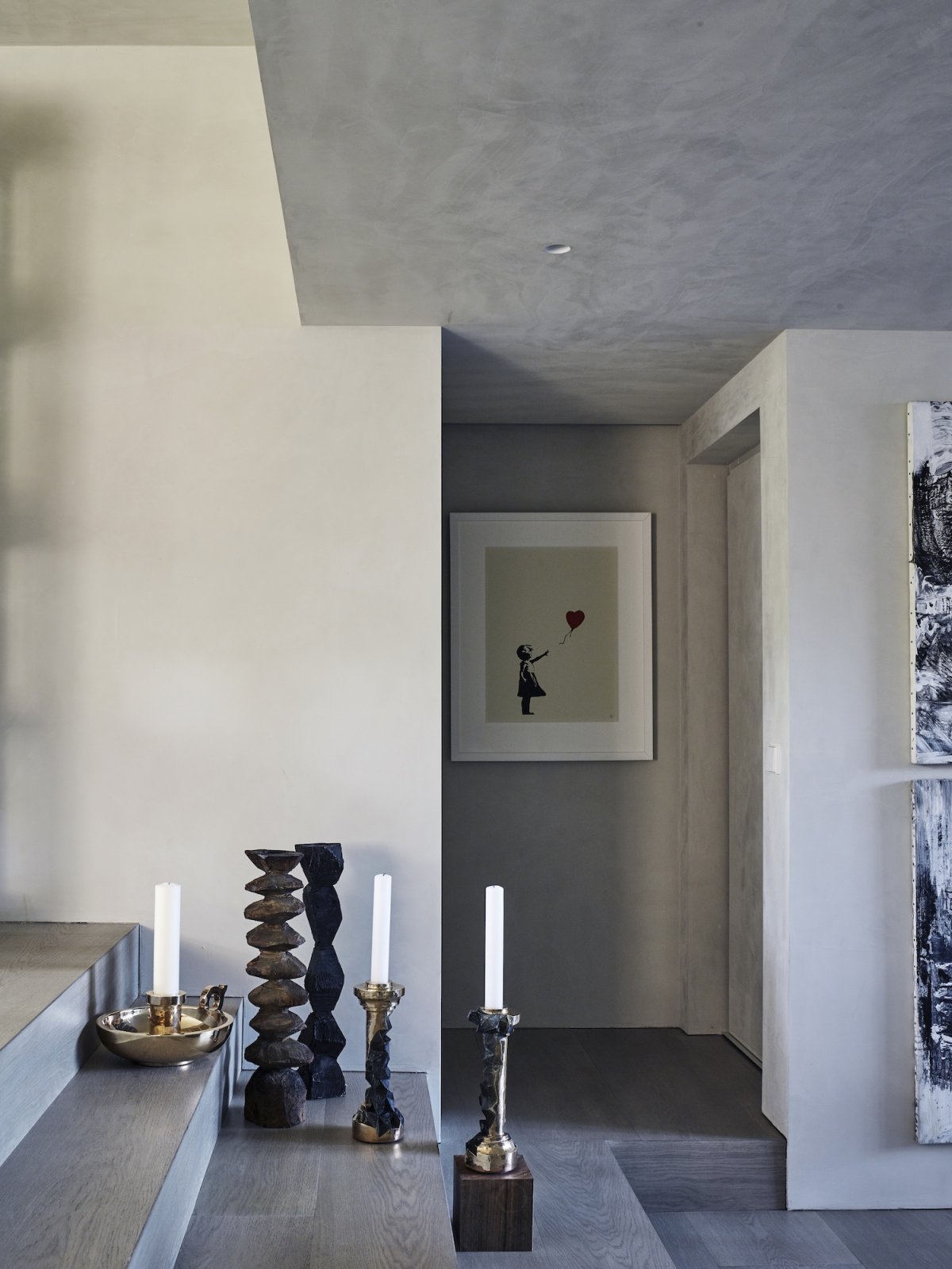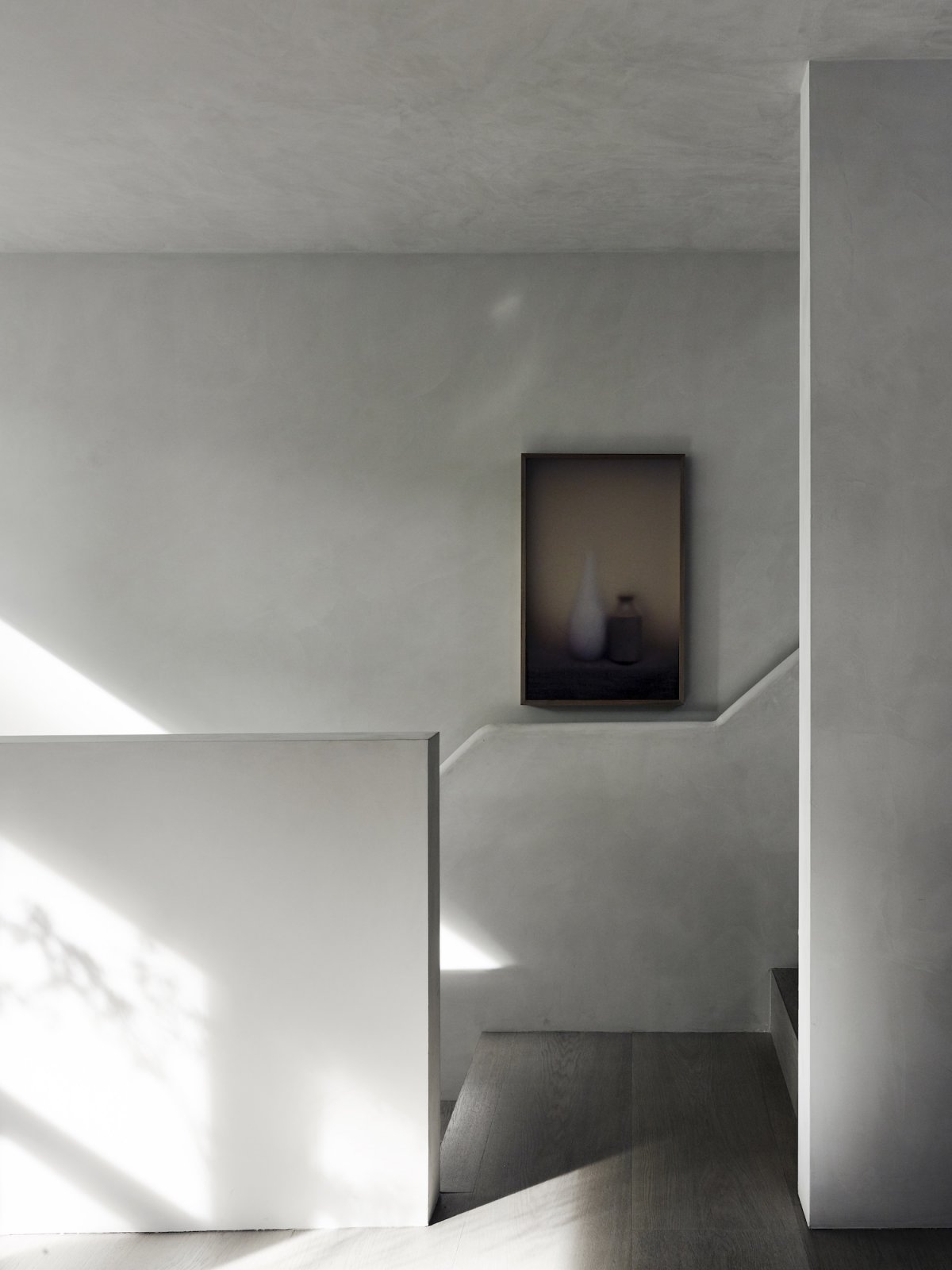The building’s quirky characteristics created opportunity to reinvent the entire design of the home, reflecting the owner’s admiration for curated artwork and objects. Hidden among the trees, the home is filled with bespoke items and mementos from the client’s travels. With a focus on the beauty behind these unconventional pieces, Studio Piet Boon have implemented a subdued colour scheme, consistent throughout the home; acting as a perfect backdrop for the client’s collection. With this target in mind, integrated and wall-mounted storage frames various rooms throughout, playing home to an assortment of books, dinnerware and sculptures.