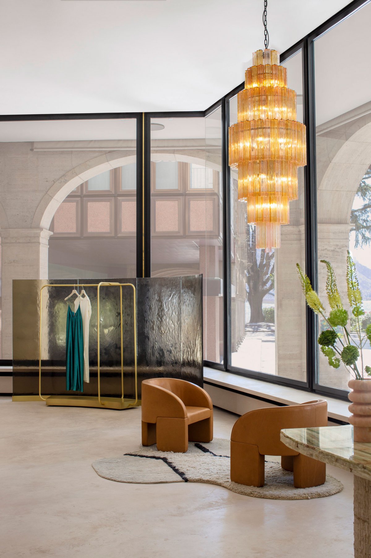 Cosmo-grey fused glass screens divide the space into different functional zones. Glass is also used in decorative elements such as the large chandelier by Barovier & Toso, and the Venini appliques that embellish the fitting area.