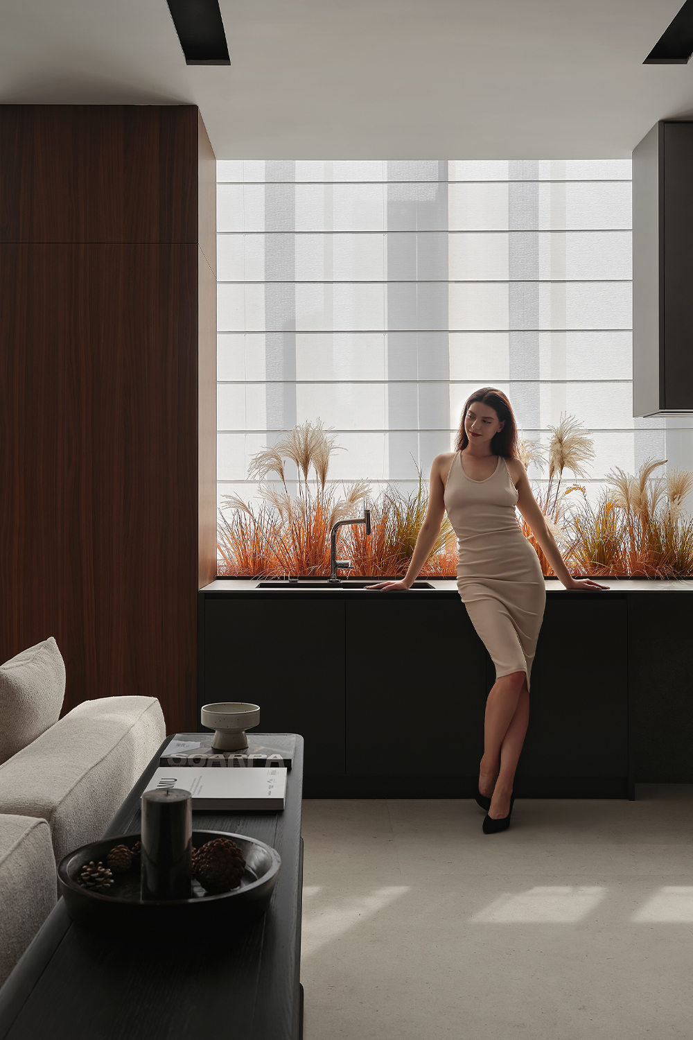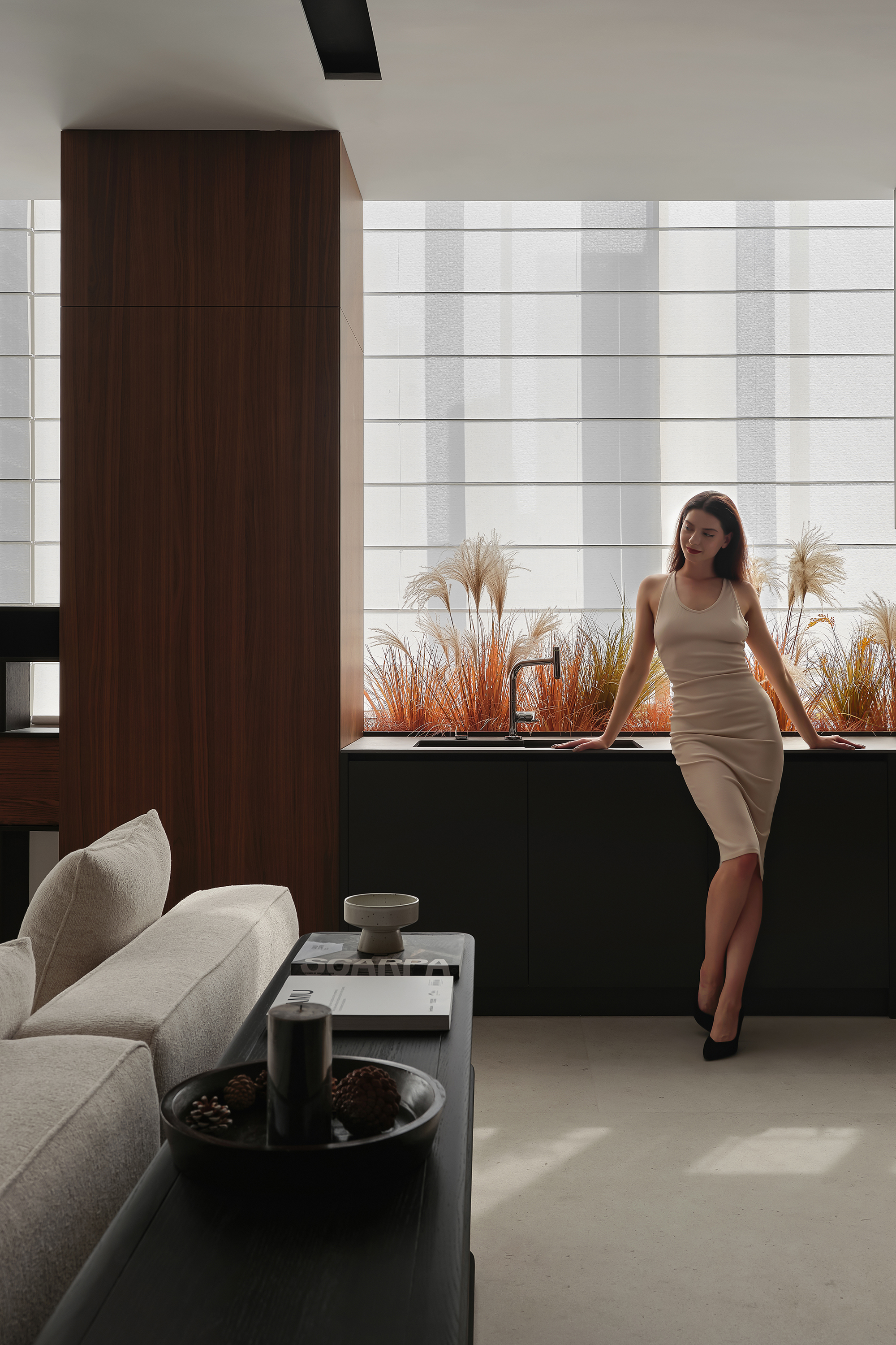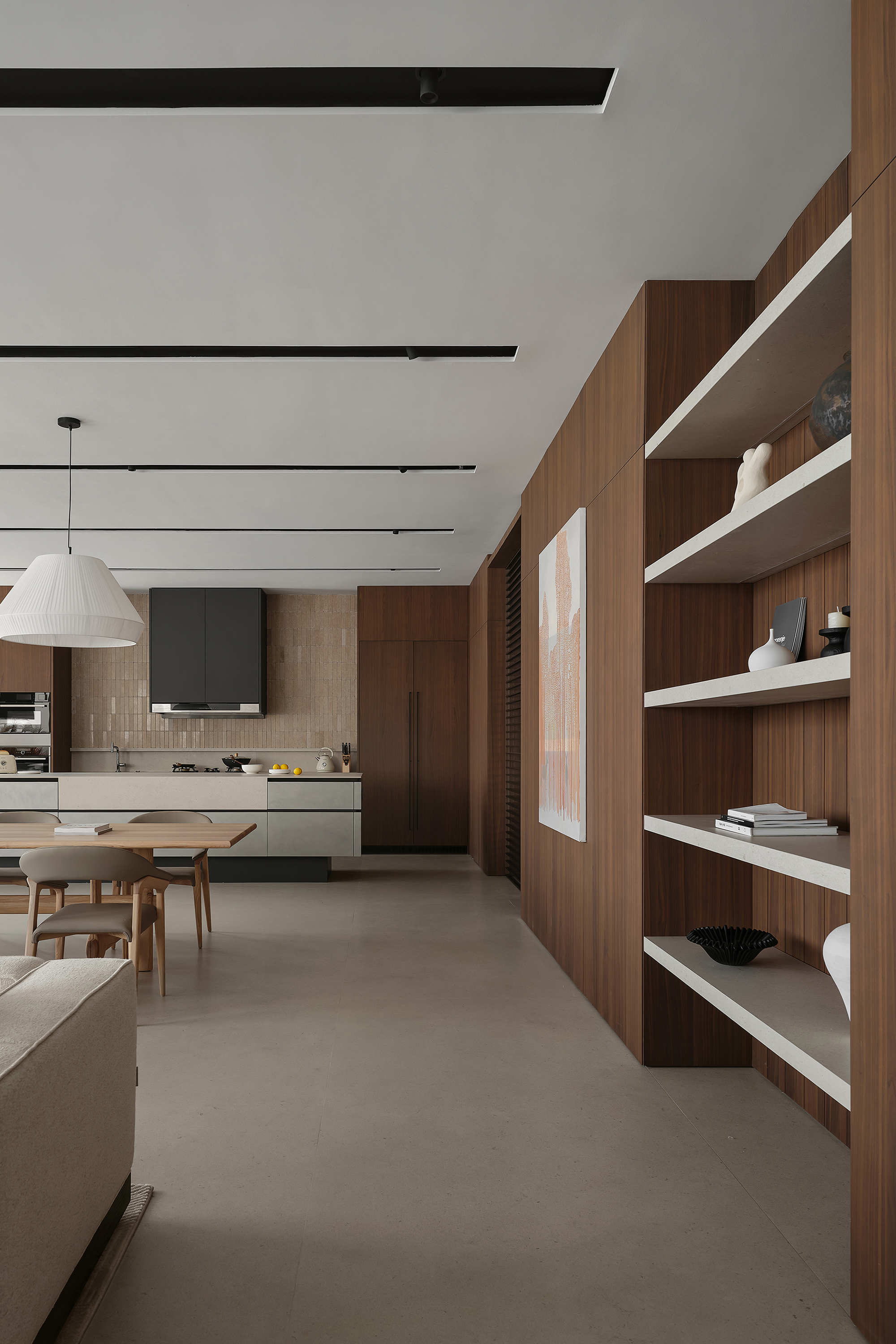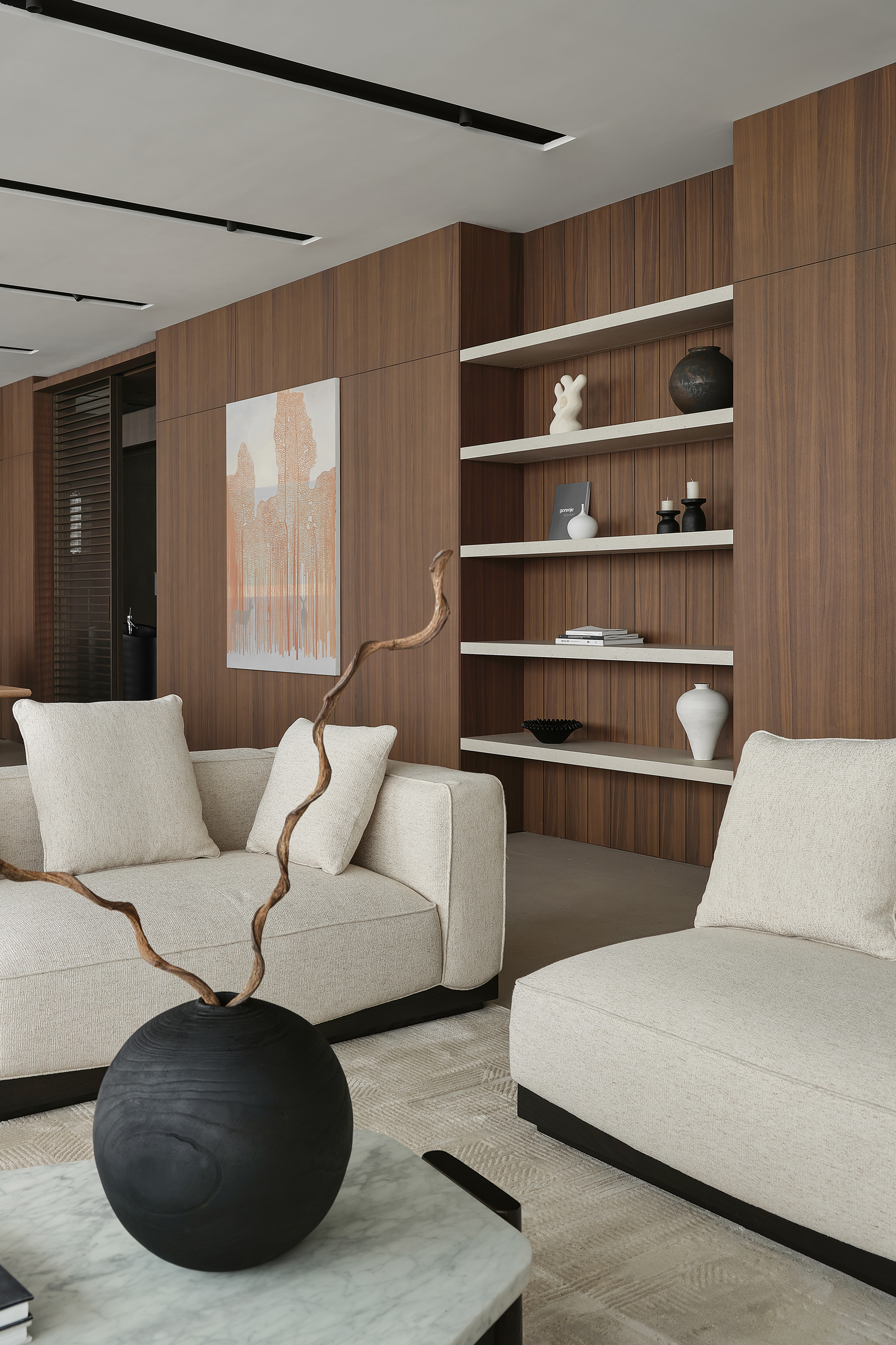 On one side of the wall, the context of the entrance stone is continued, while on the other side, brown wooden grids are laid out in a delicate rhythm, and the brand logo is lightly embedded in it, not ostentatious but clear enough. At the top, a sloping roof is used as a metaphor for architectural intention, casting a slightly divine opening in the halo of golden texture.
