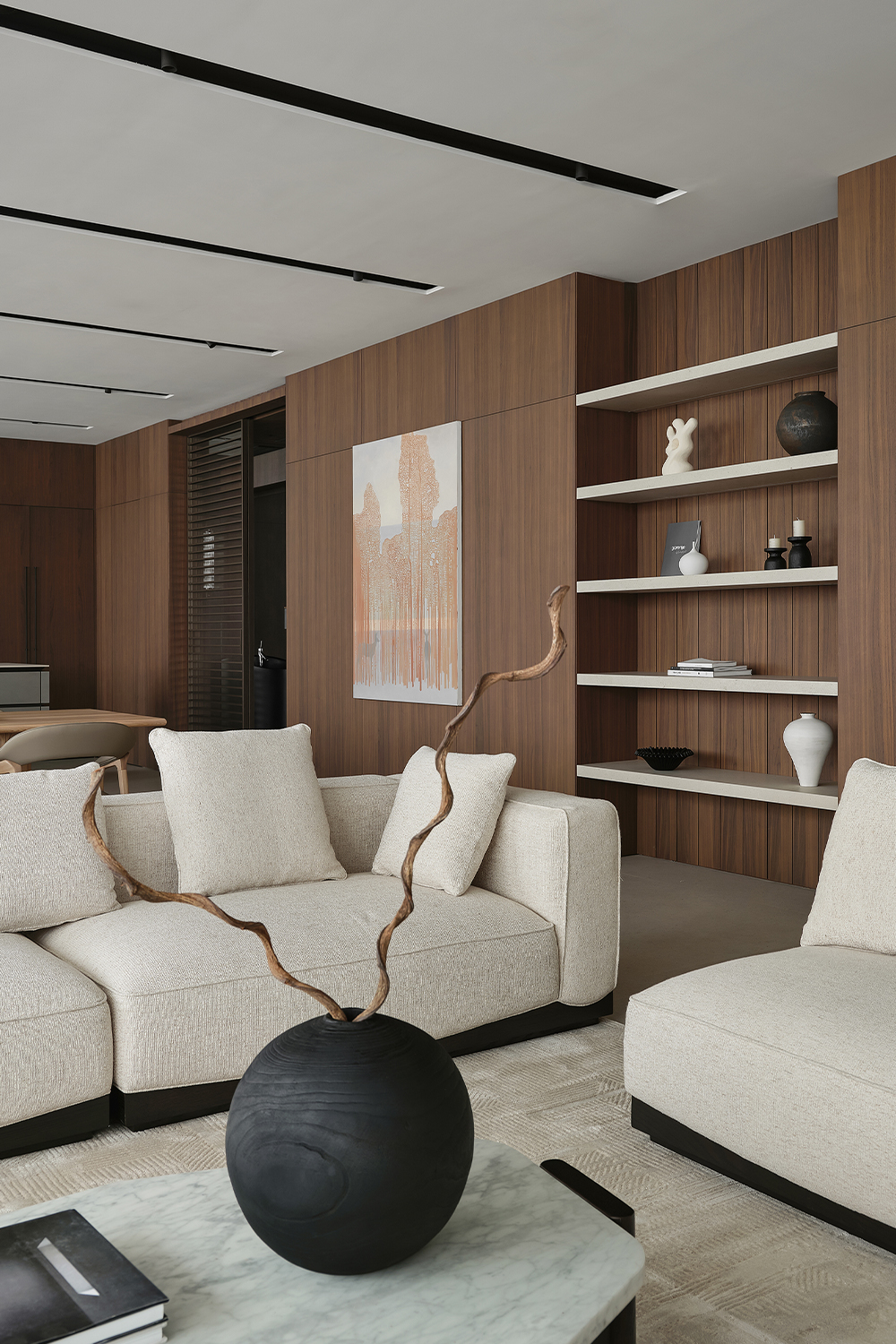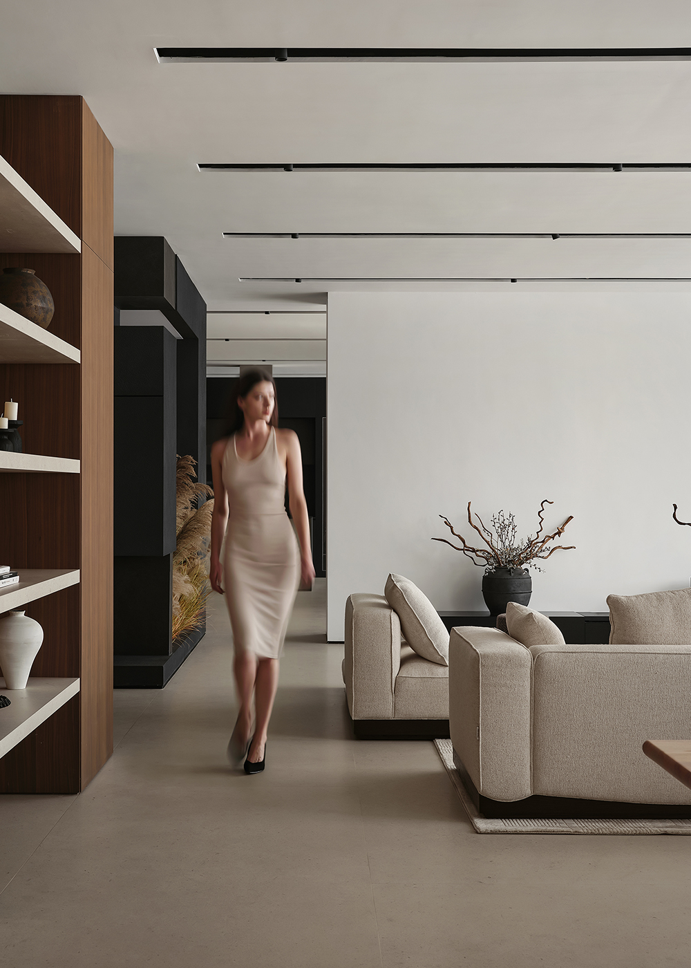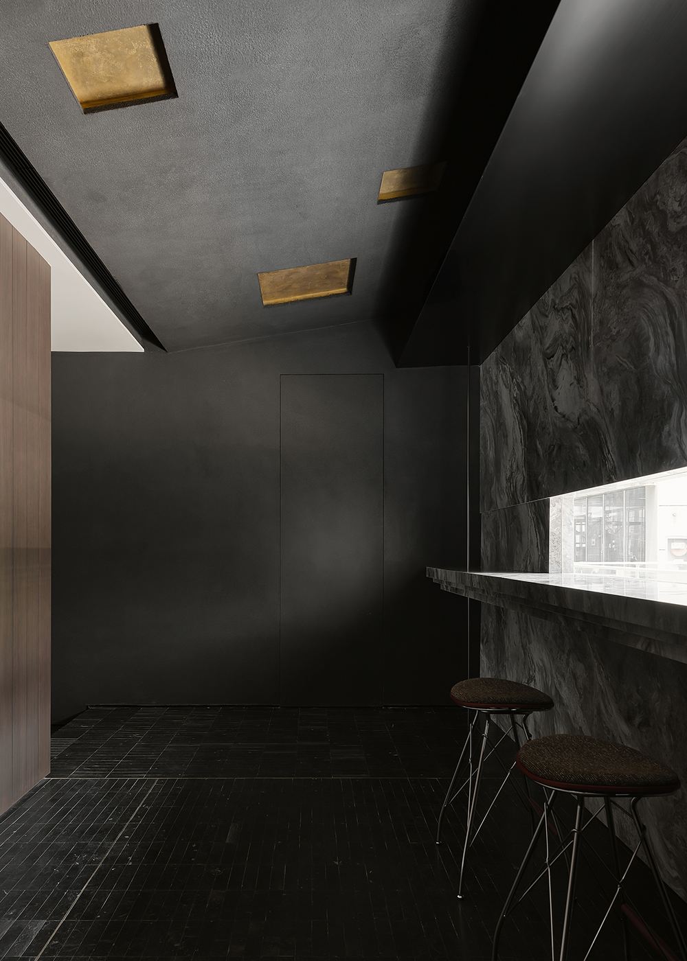 Approaching the exhibition hall, a facade composed of dark metal and water-patterned stone interweaves, silently setting the first psychological boundary. It's not like a solicitation, but more like an invitation, like a slice of some natural landscape, quietly waiting to be entered in the city. The black off-axis door that opens laterally subtly breaks the symmetry, creating a hint of intentional uncertainty, guiding the viewers into a slowly unfolding spatial journey. The subsequent narrow corridor completed the emotional "low rise" with the interweaving of different materials. The raised ground, rough rock bricks, and warm copper wire texture create a tactile experience between nature and artificiality.