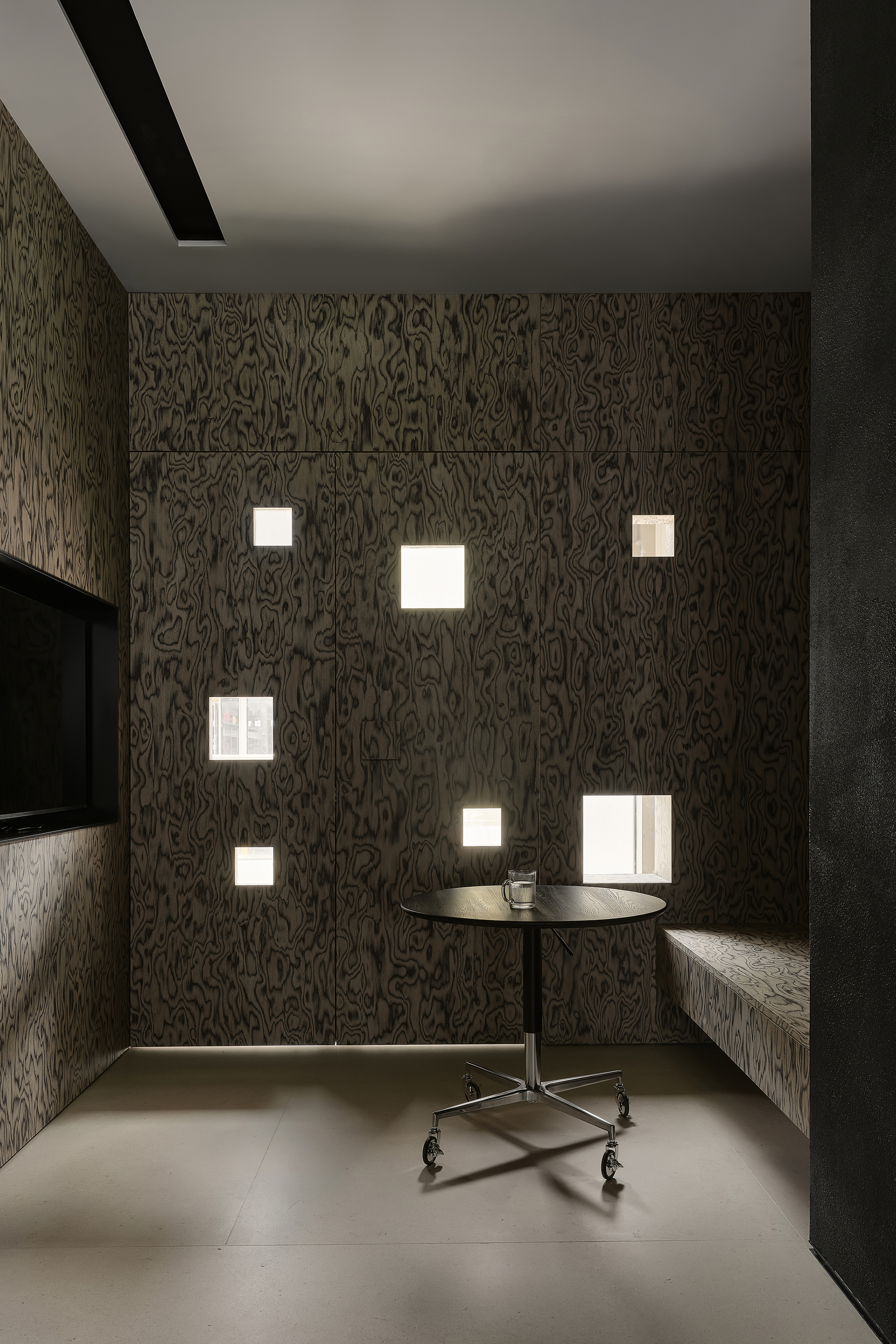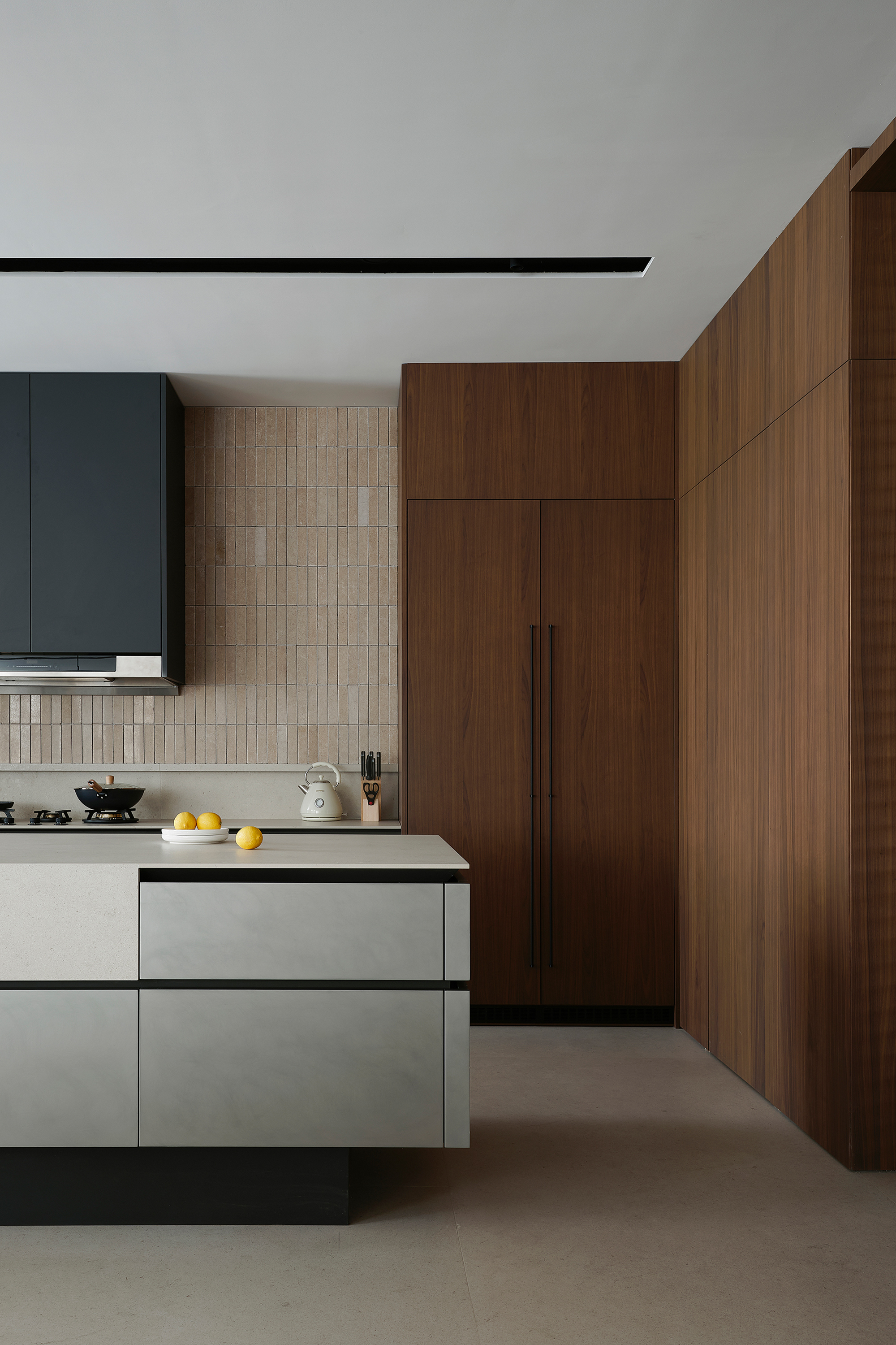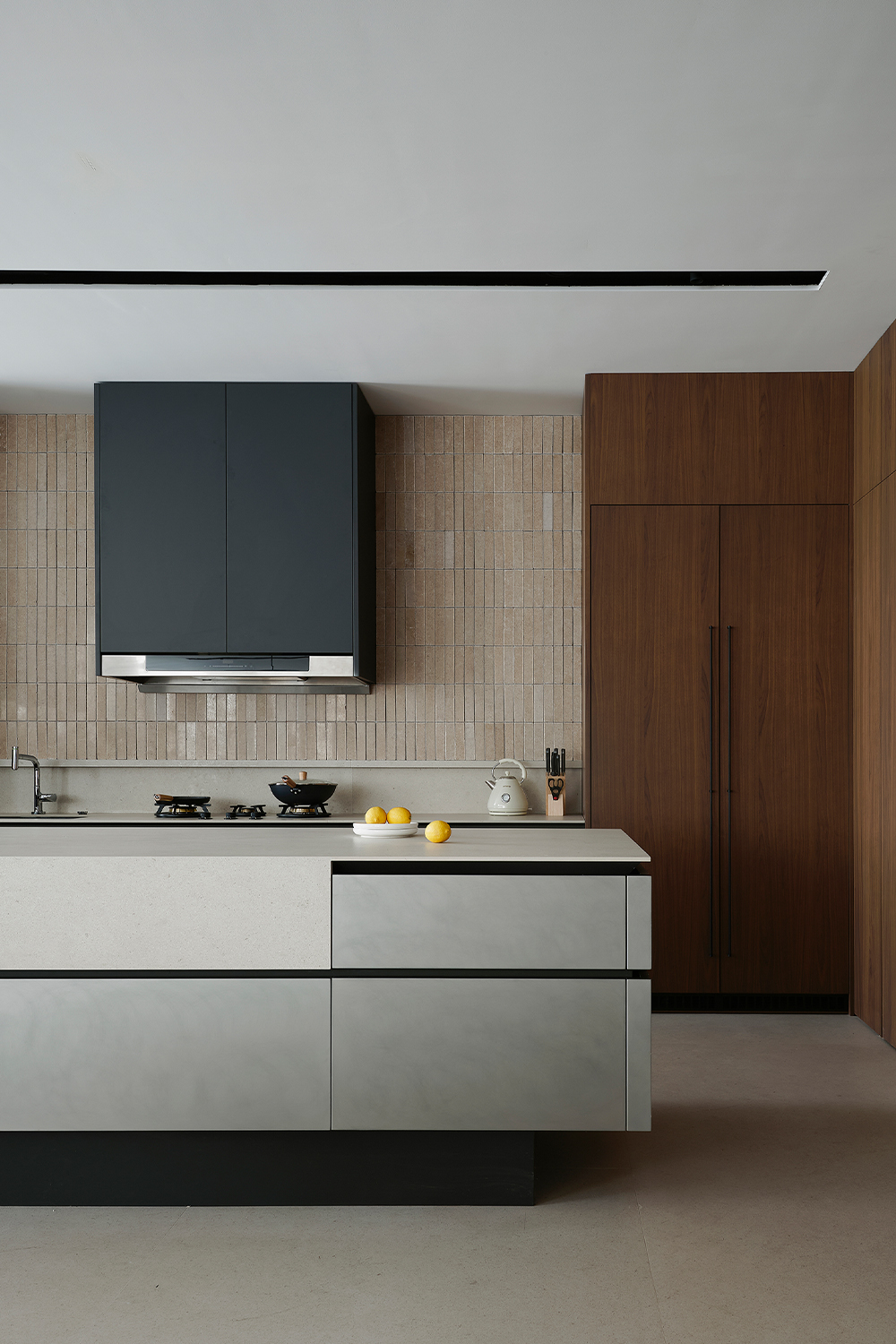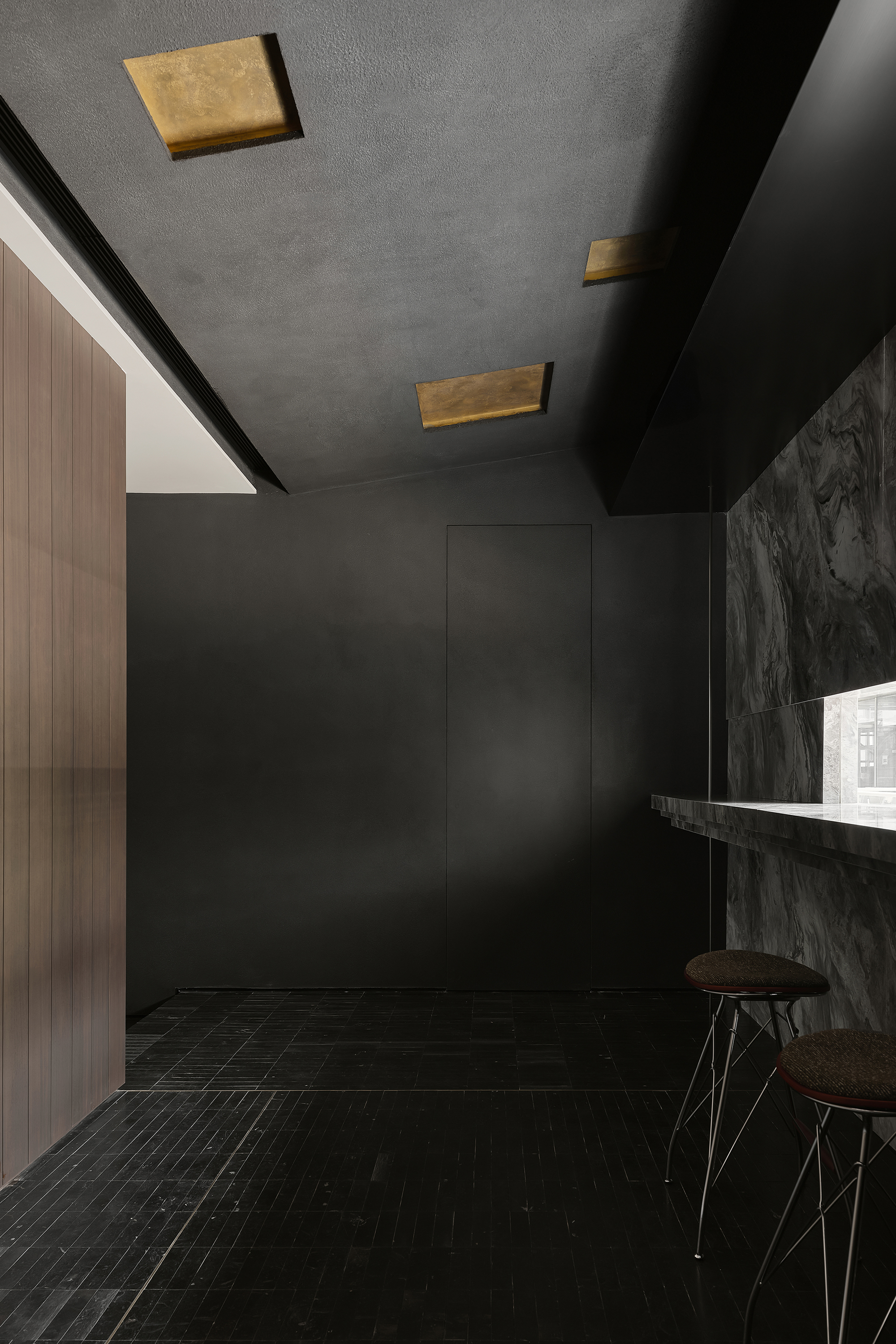 Approaching the exhibition hall, a facade composed of dark metal and water-patterned stone interweaves, silently setting the first psychological boundary. It's not like a solicitation, but more like an invitation, like a slice of some natural landscape, quietly waiting to be entered in the city. The black off-axis door that opens laterally subtly breaks the symmetry, creating a hint of intentional uncertainty, guiding the viewers into a slowly unfolding spatial journey. The subsequent narrow corridor completed the emotional "low rise" with the interweaving of different materials. The raised ground, rough rock bricks, and warm copper wire texture create a tactile experience between nature and artificiality.