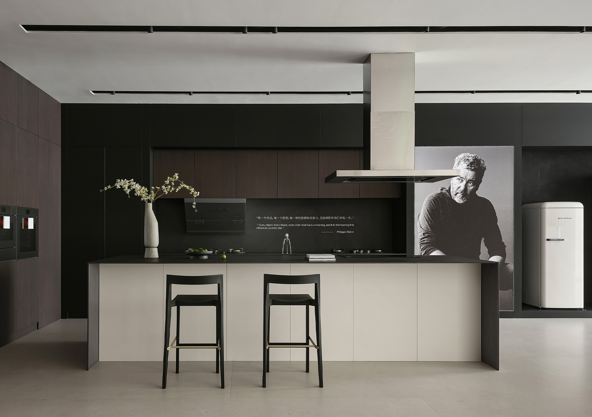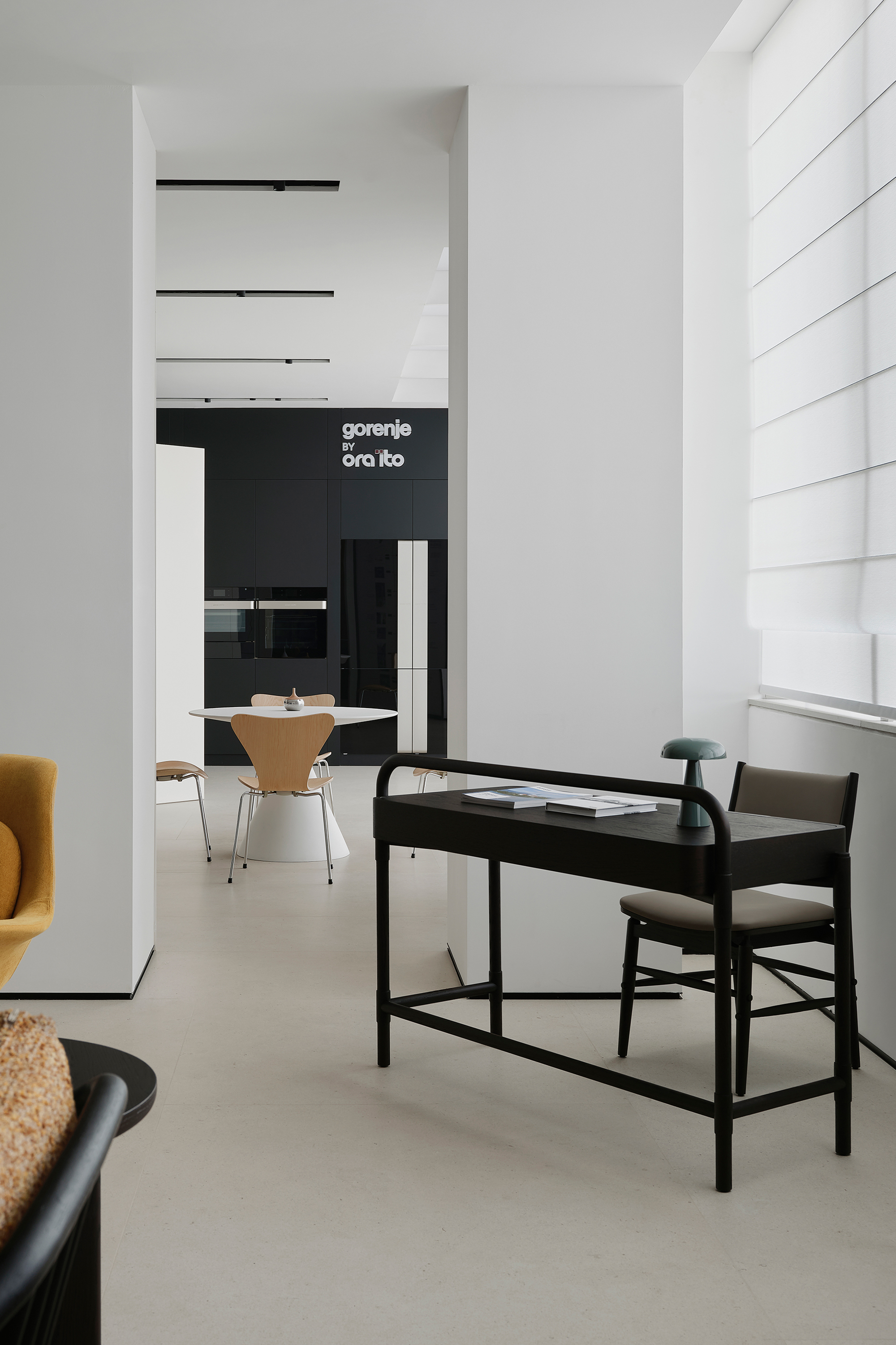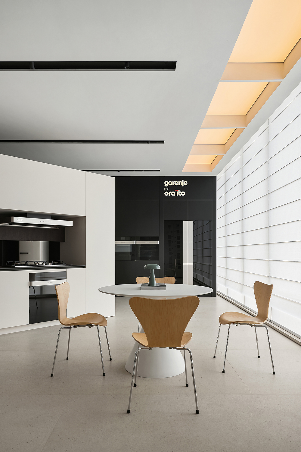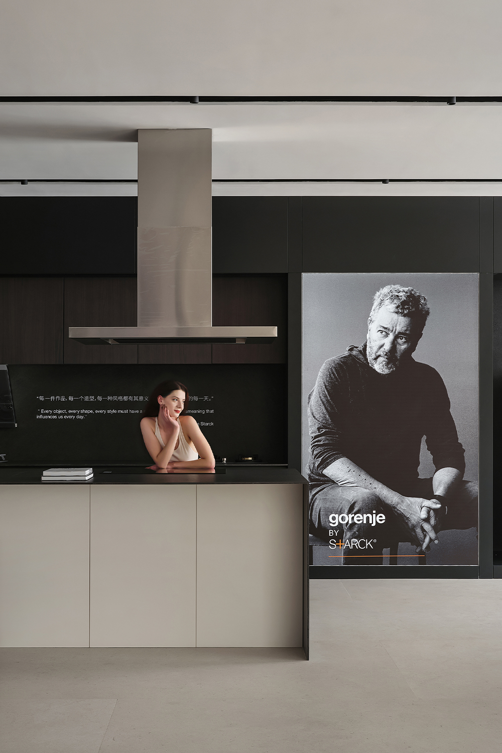 Entering the main space of the exhibition hall, the floor plan is ingeniously divided into two dimensions: Exhibition and Experience. The core product exhibition area adopts a display method of placing 45 ° shaped cabinets to break the static state, creating a sense of deviation in the visual movement and stimulating the desire to observe. Let the Starck series and Ora-Ïto series form a segmented dialogue, with black and white contrast bursting with tension on the facade, releasing the artistic quality of the product in rational composition, and making each household appliance break away from the role of a tool, more like a sculpture in daily life.