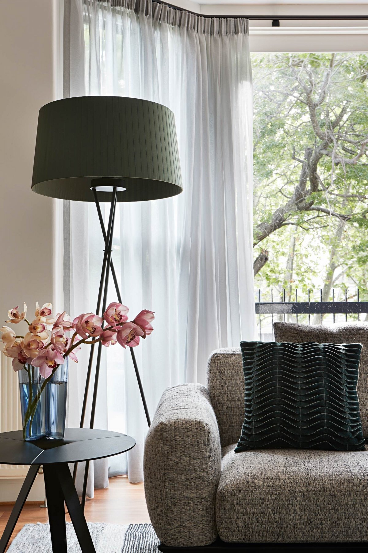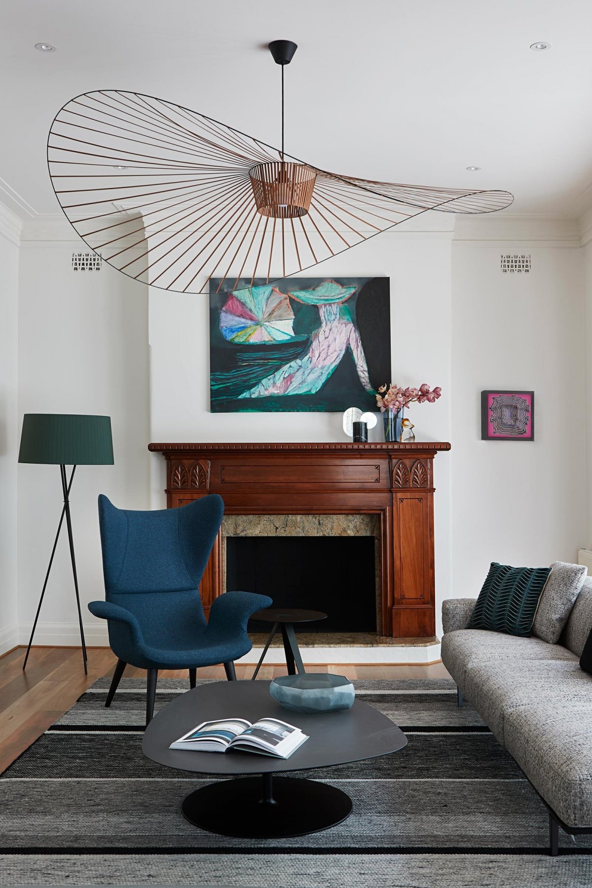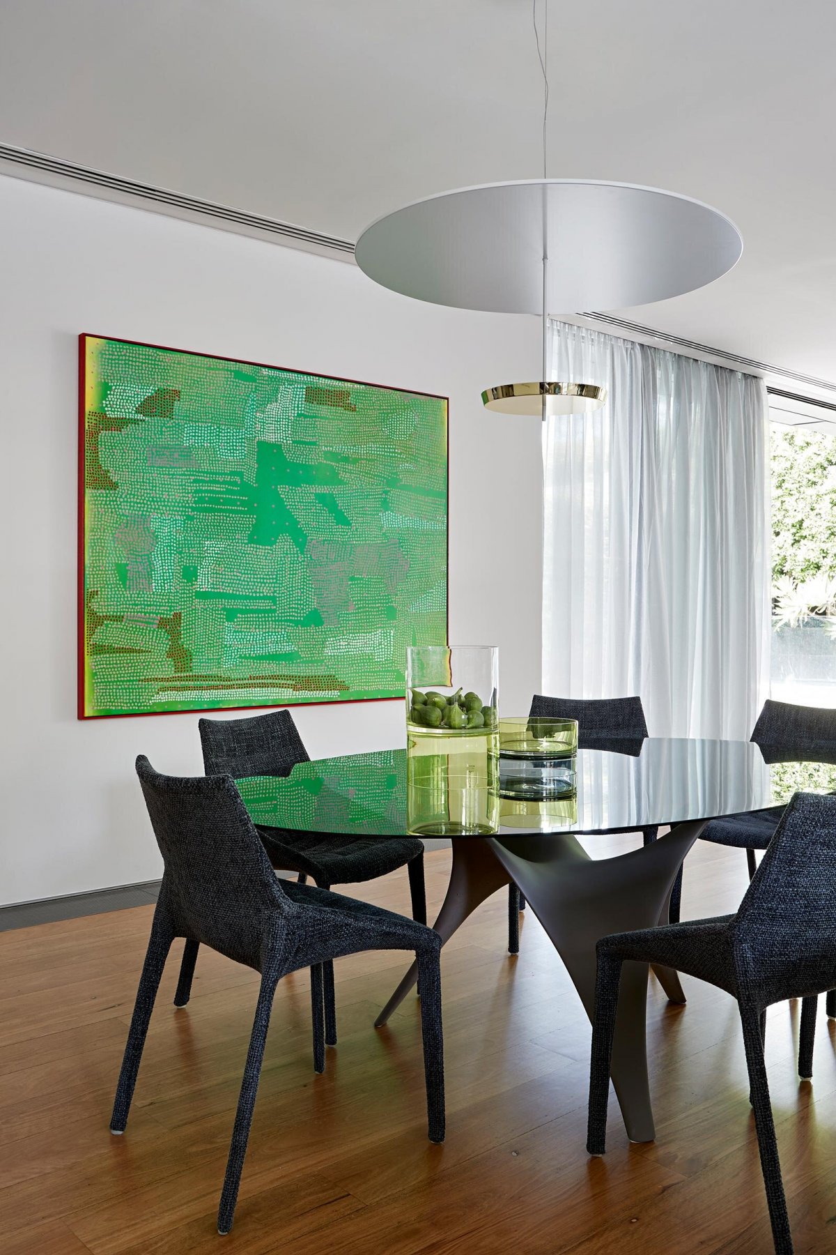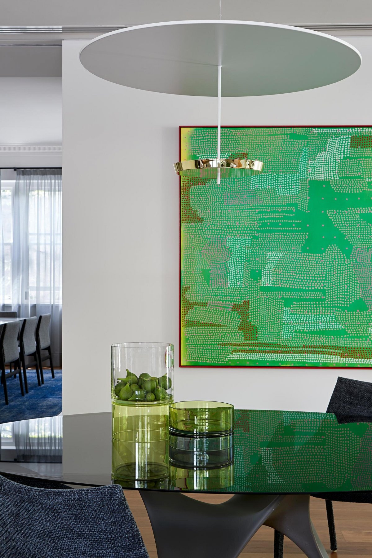 The concept for the complete refit of this home was based around the concept of the precious jade stone. Lighting and key pieces of furniture were selected for their sculptural qualities. Oversized pendant lights, redolent of Chinese lanterns create movement and form in the air; floor lamps play the role of ‘jewellery’ in each room. The house abounds with vibrant commissioned artworks that reflects the owner’s love of contermporary art and design. Emeral greens and blues abound throughout the home, establishing the lush and luxe mood of the interiors. Dark timbers such as smoked oak and wenge are teamed with lustrous furnishings that offer up the irridescent sheen of glass, silk, brass and marble.