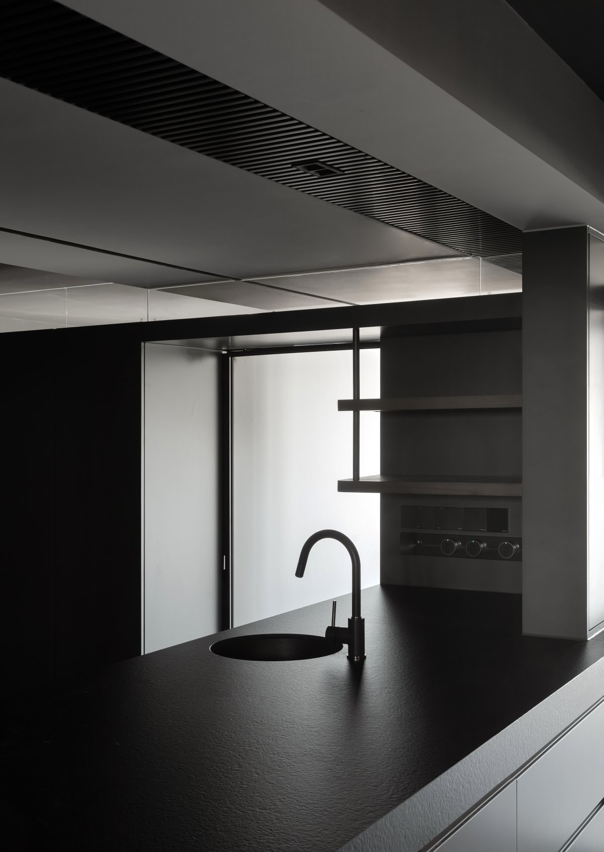After having a general understanding of the house, we rearranged the relationship between the linear plane and the space to avoid the restrictions above. First of all, we made a softening between pipes and access hole by using complementary architectural faces. It turns out that the well arranged black and white colors subtly connect the architectural faces, adding visual interactions to the space. And the crossed lights present a mysterious sense of quiet in the river of time. Second, as regards to wall faces between versatility public area and the bedroom, we set a window in the higher place to introduce light in. When coming home, this will help our client reduce the sense of intensity from work and switch to the sense of relaxation of life. Finally, our main concept in this case is taking the relationship between life demand and space into account and then further dealing with relationship between people and space. Our use of differentiation has blended the old design with the new thought in a harmonious space and realized the clients’ life demand through our designing ideas. We are always committed to creating a sense of congeniality between elements and space, attaching the original life tones to the space. We believe, the harmony between space, material, light and shadow makes the home embedded with a free will of “swimming light”.