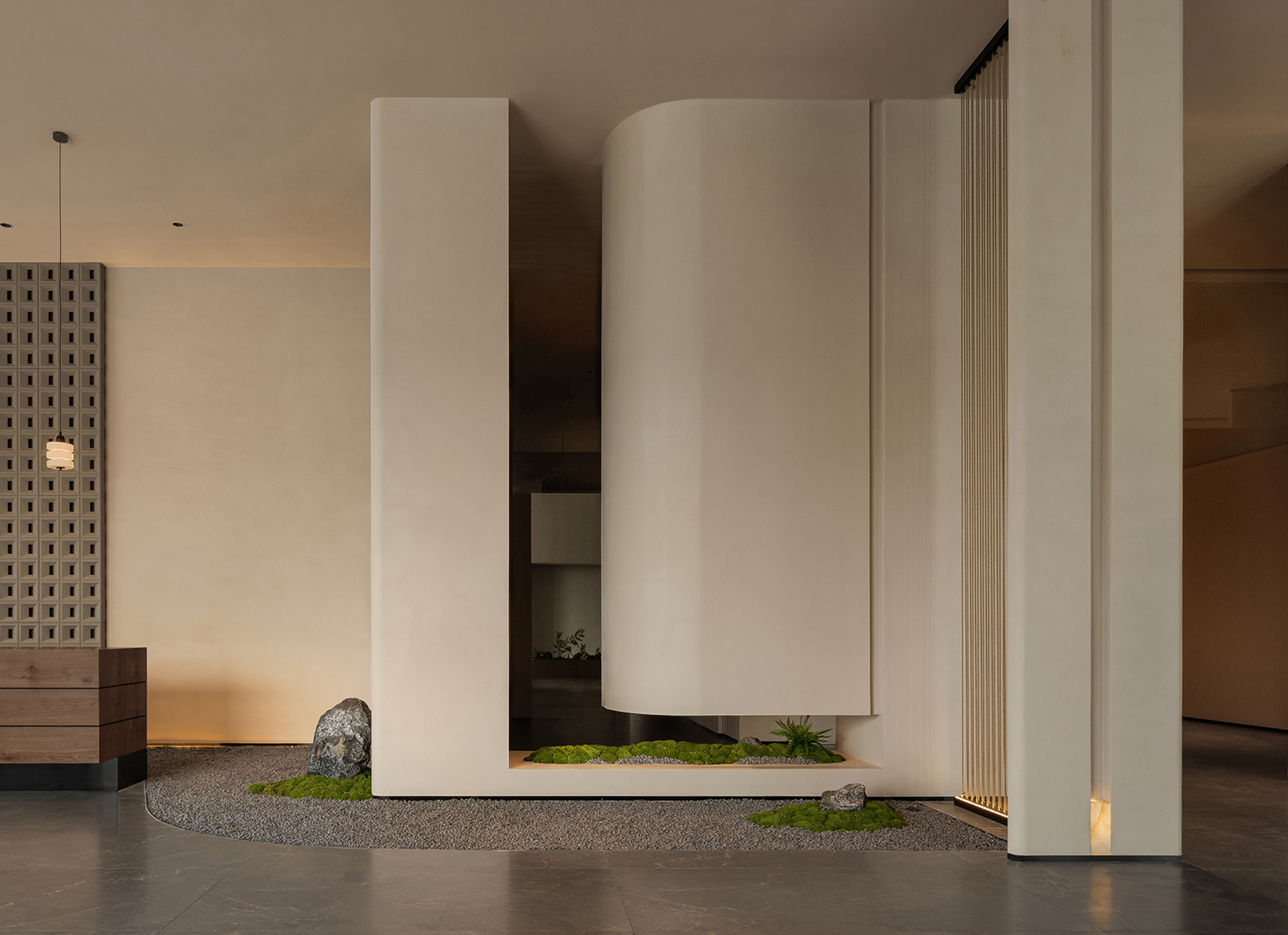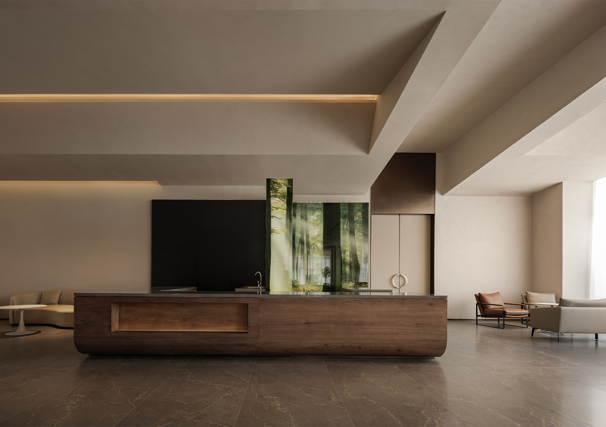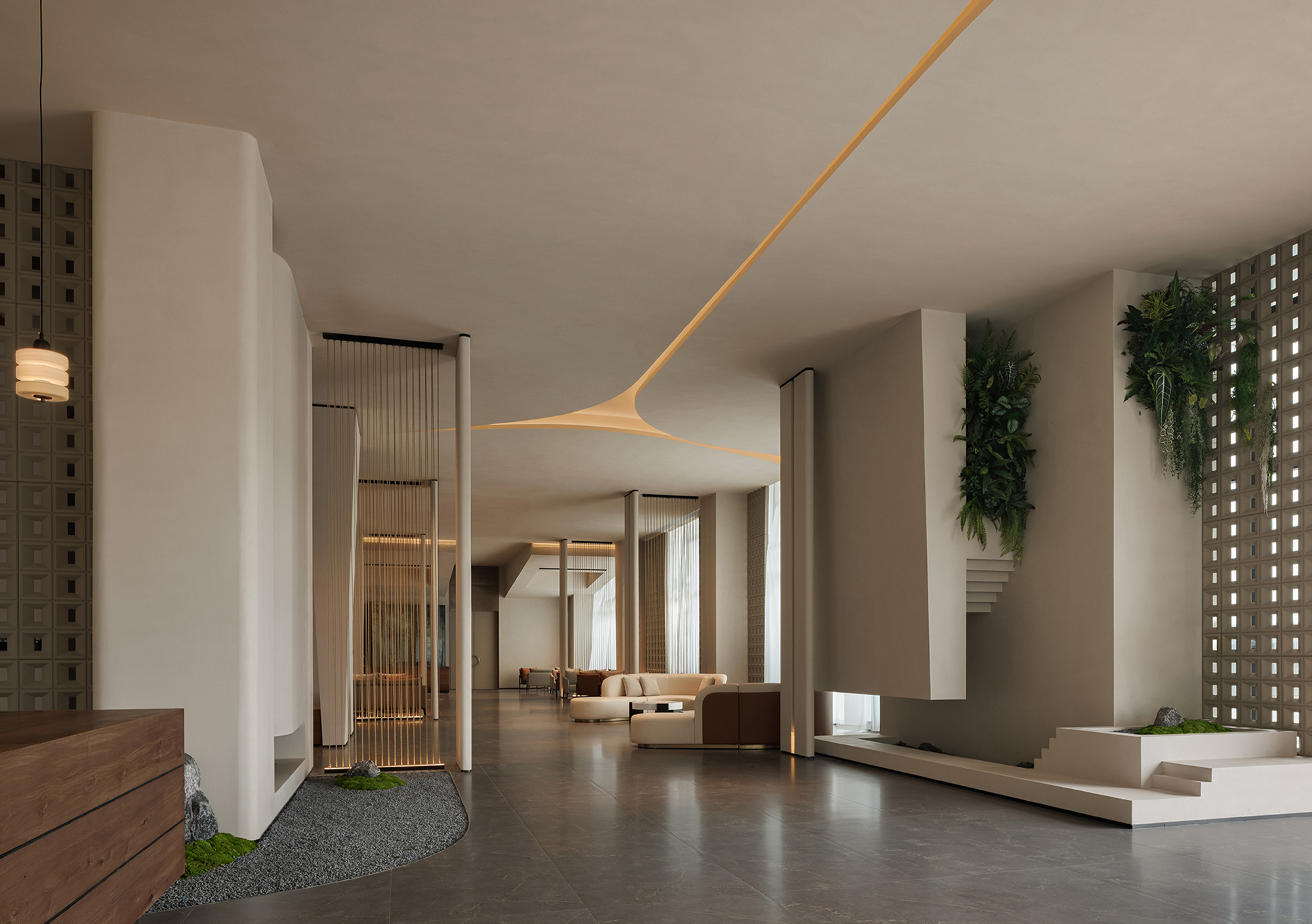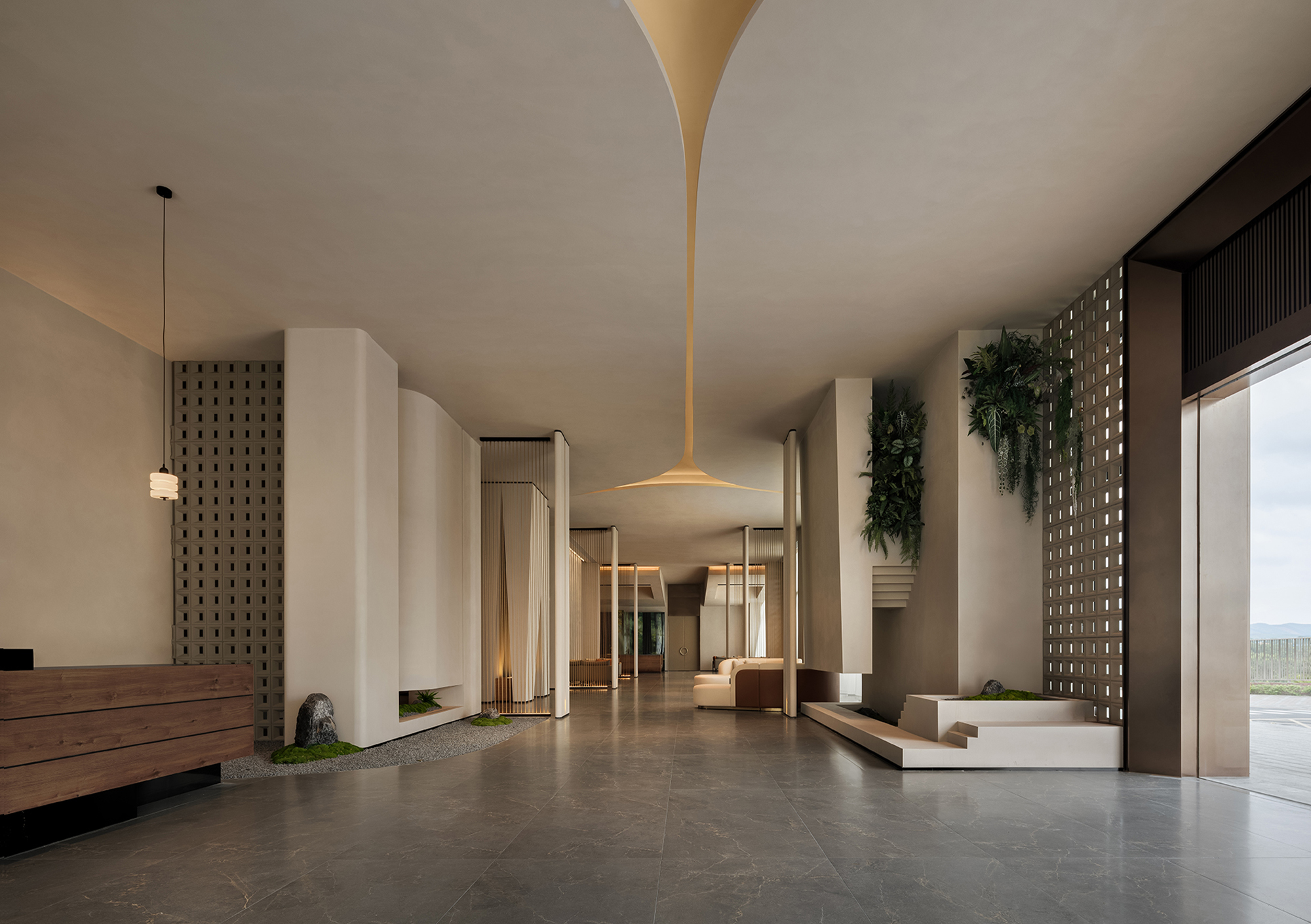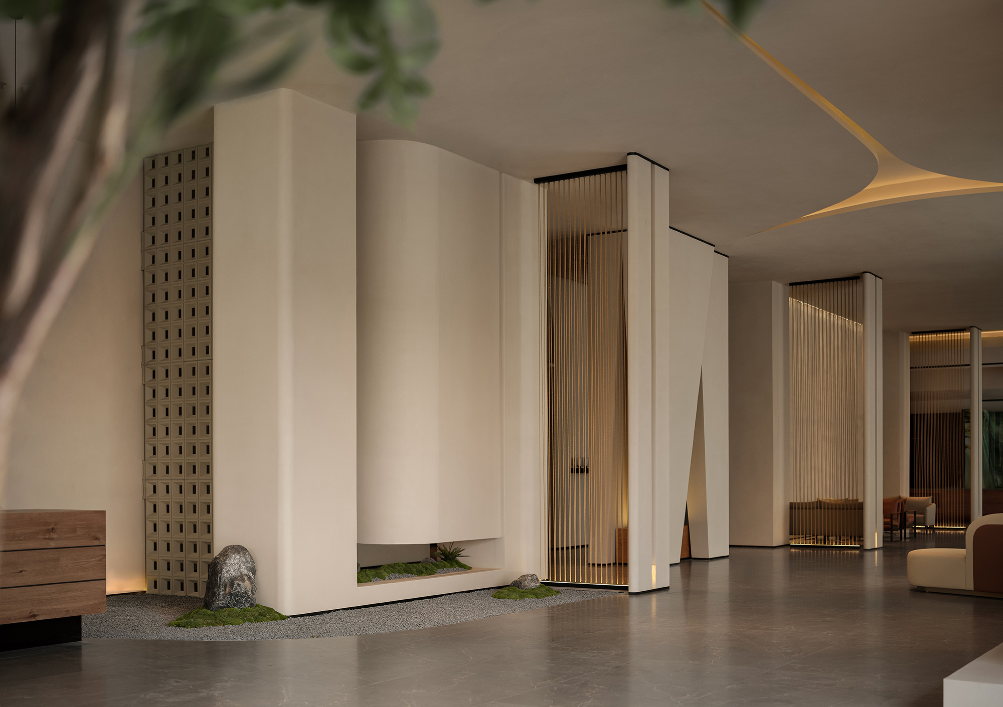 The reception desk conveys a sense of natural simplicity through the texture of raw wood grain and deep brown tones. The curved ceiling design forms the core of the light-and-shadow narrative, where warm light softly diffuses to create flowing bands of illumination, guiding the visitor’s gaze. Small landscape inserts and architectural volumes introduce rhythmic variations, prompting guests to slow down and enter a state of quietude.