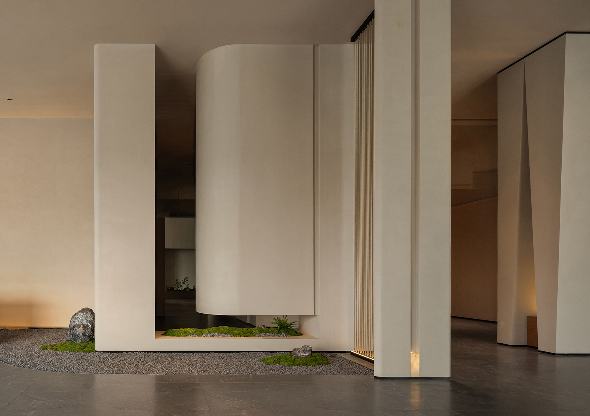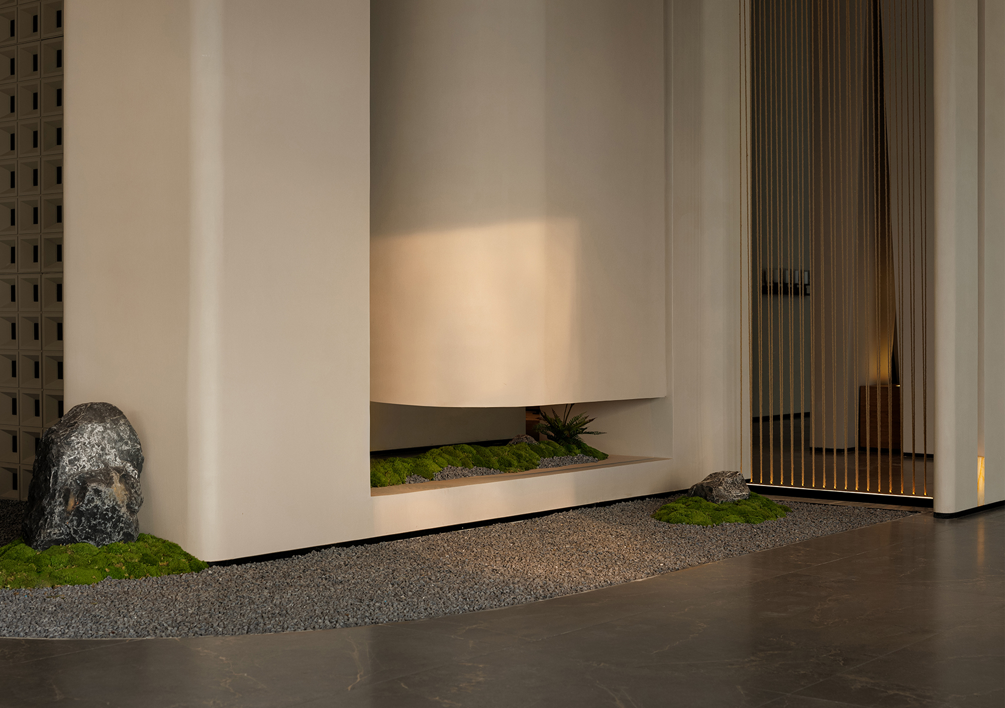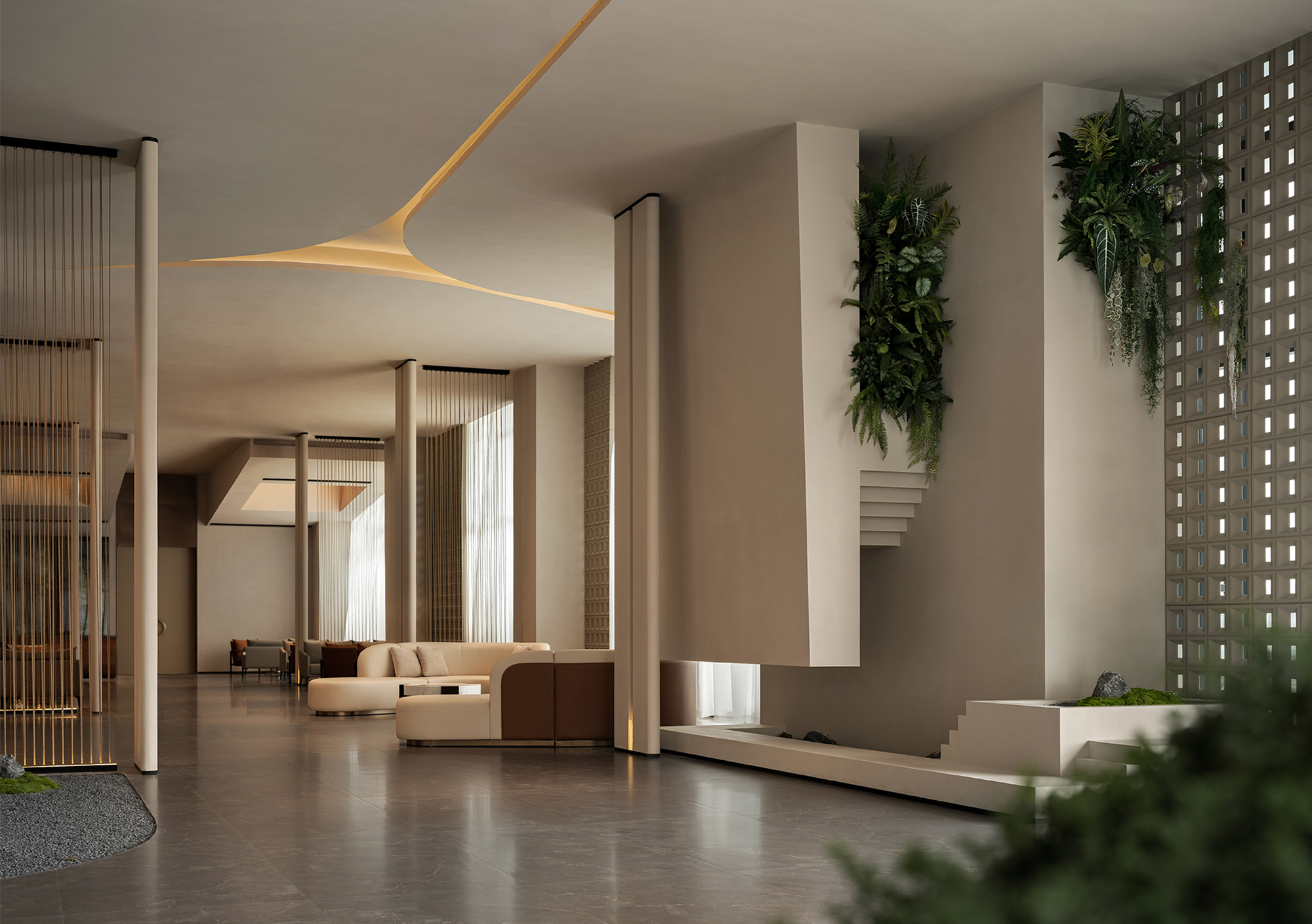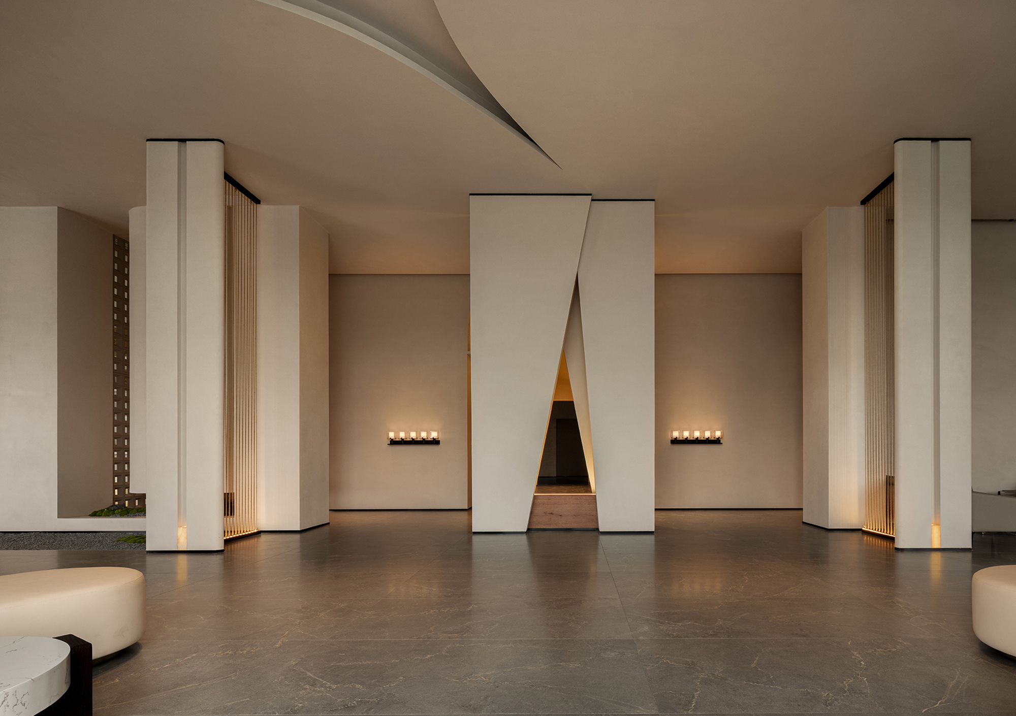 The reception desk conveys a sense of natural simplicity through the texture of raw wood grain and deep brown tones. The curved ceiling design forms the core of the light-and-shadow narrative, where warm light softly diffuses to create flowing bands of illumination, guiding the visitor’s gaze. Small landscape inserts and architectural volumes introduce rhythmic variations, prompting guests to slow down and enter a state of quietude.