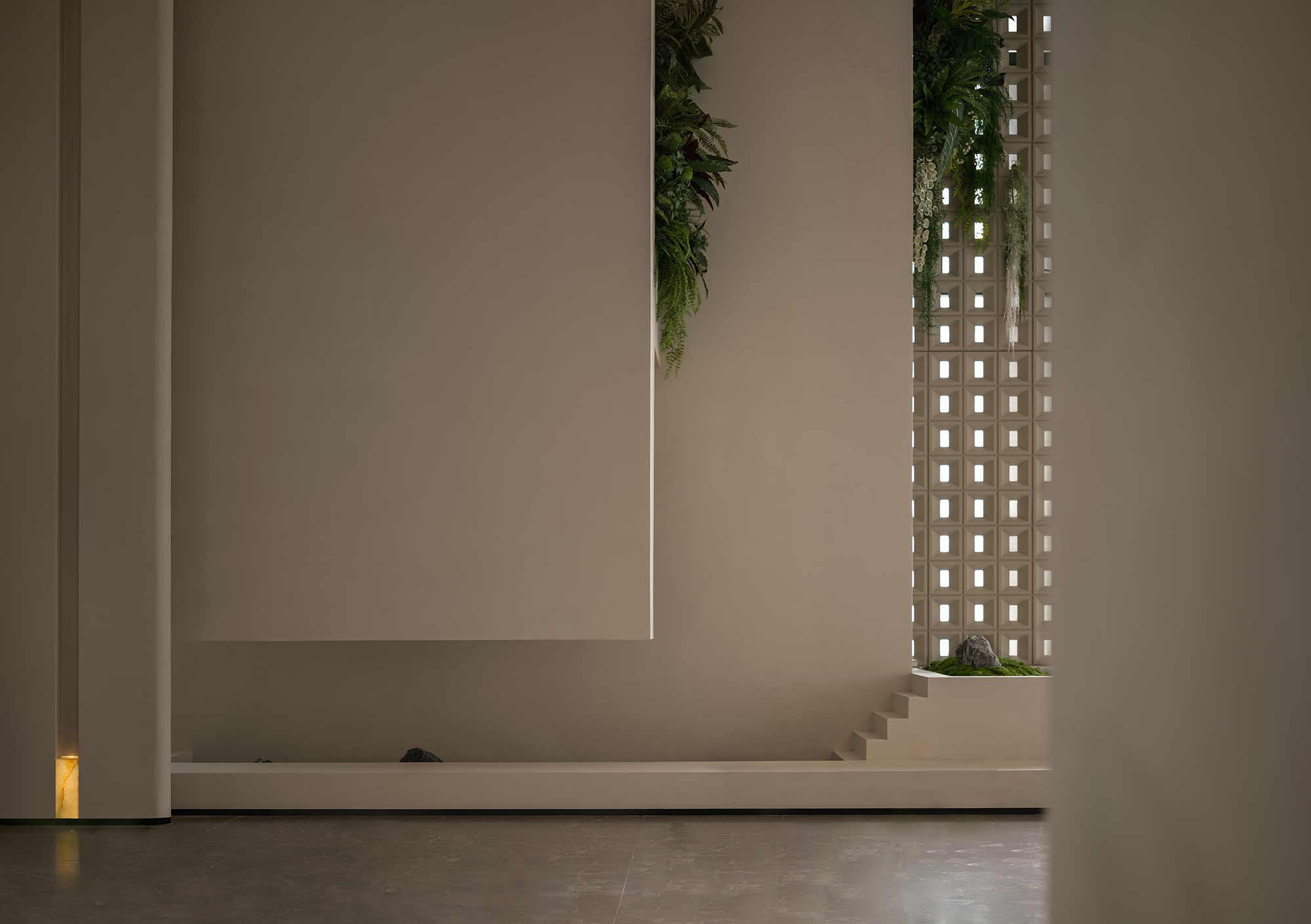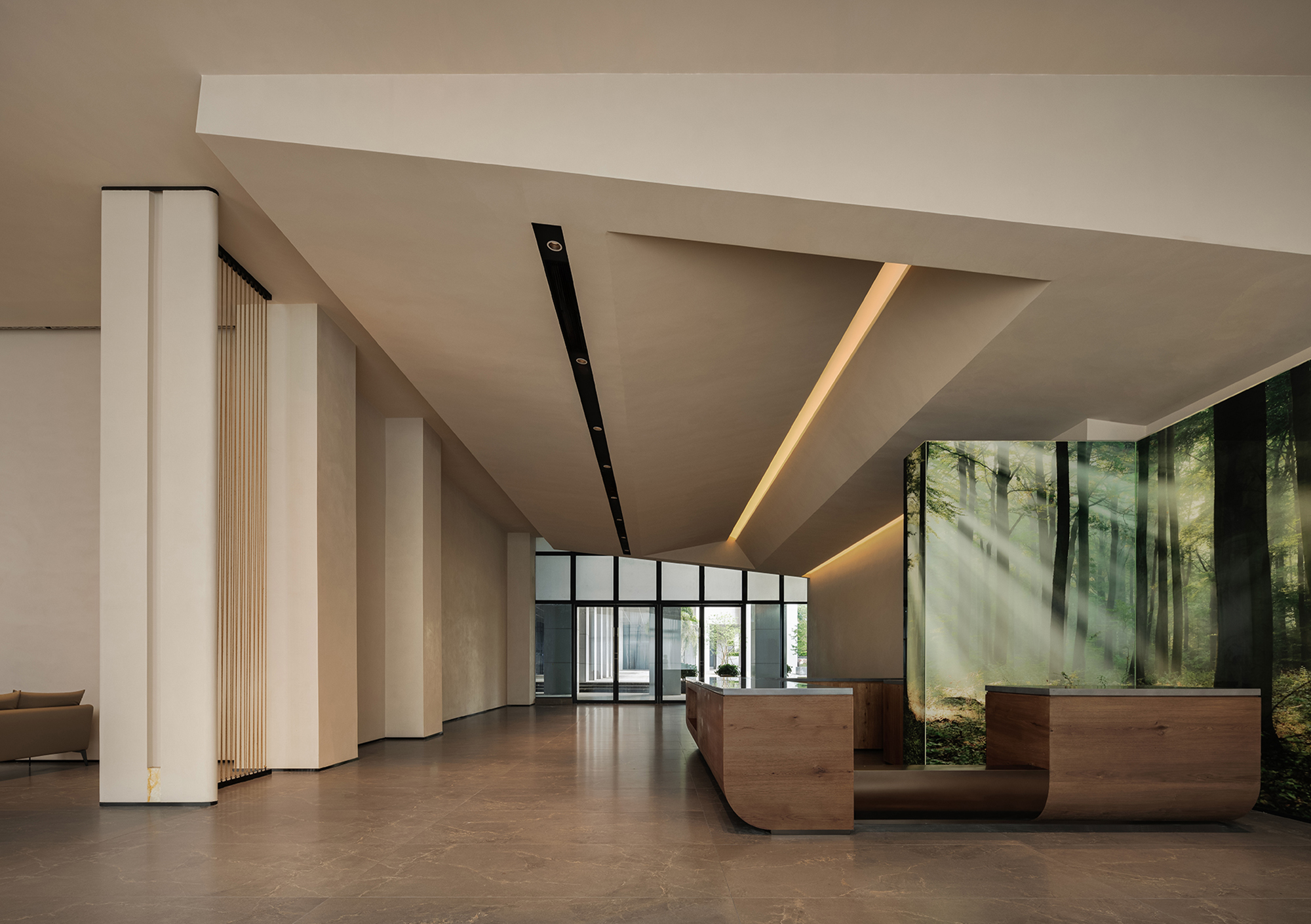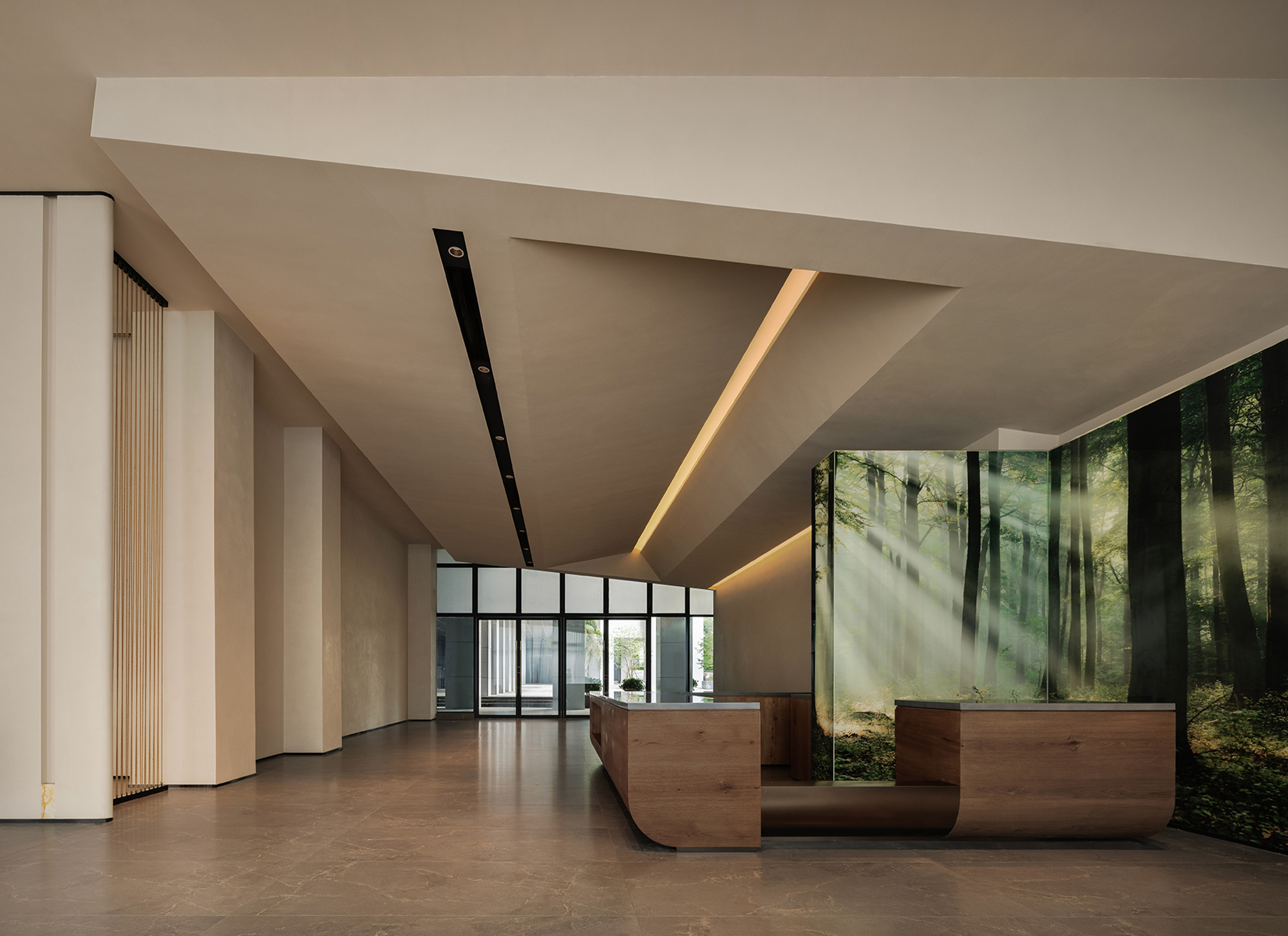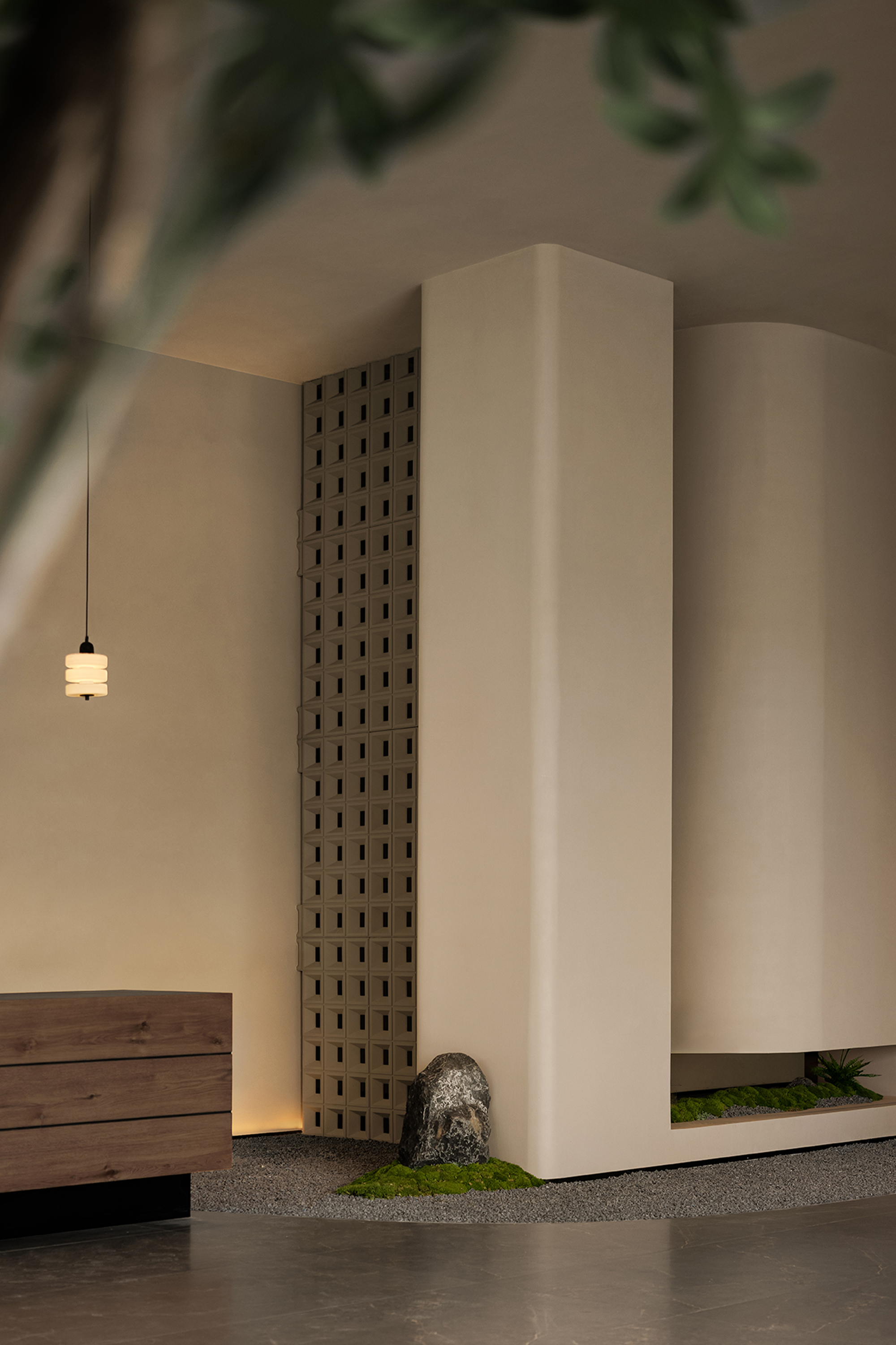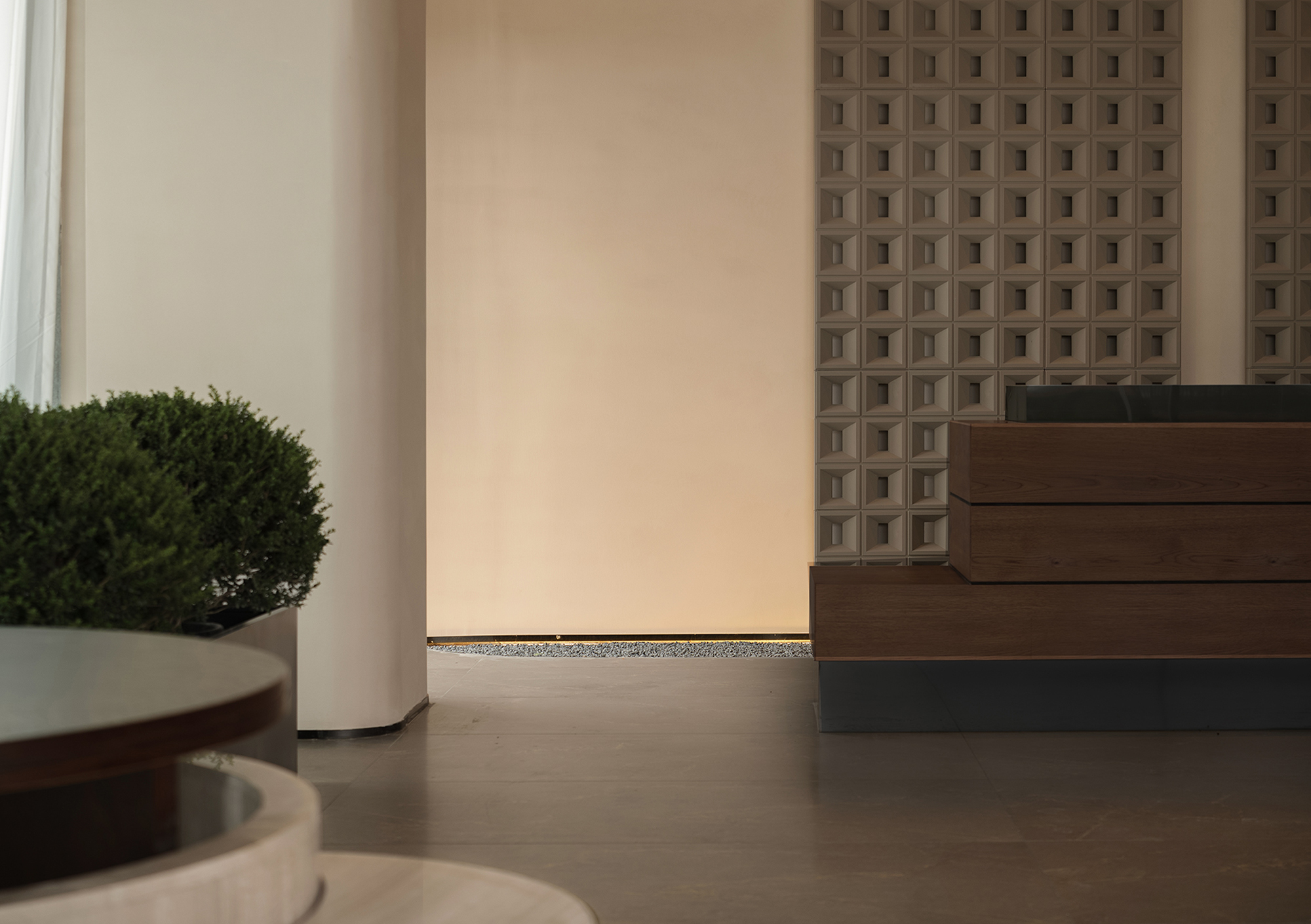 The reception desk conveys a sense of natural simplicity through the texture of raw wood grain and deep brown tones. The curved ceiling design forms the core of the light-and-shadow narrative, where warm light softly diffuses to create flowing bands of illumination, guiding the visitor’s gaze. Small landscape inserts and architectural volumes introduce rhythmic variations, prompting guests to slow down and enter a state of quietude.