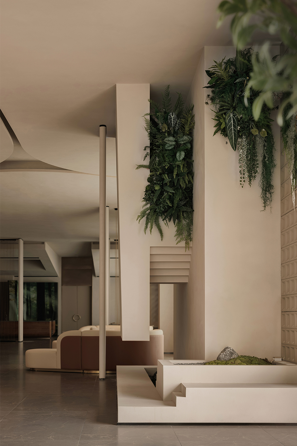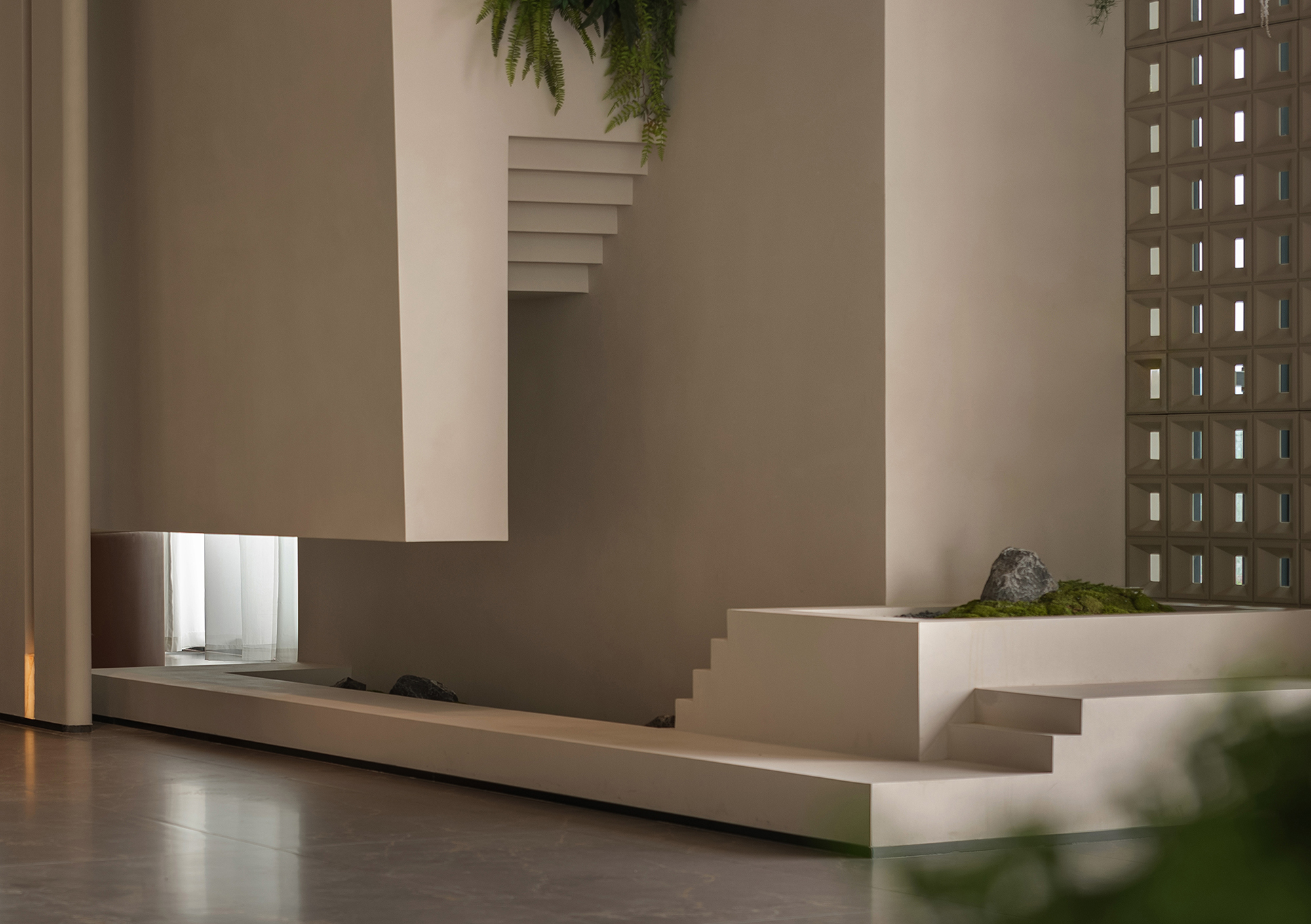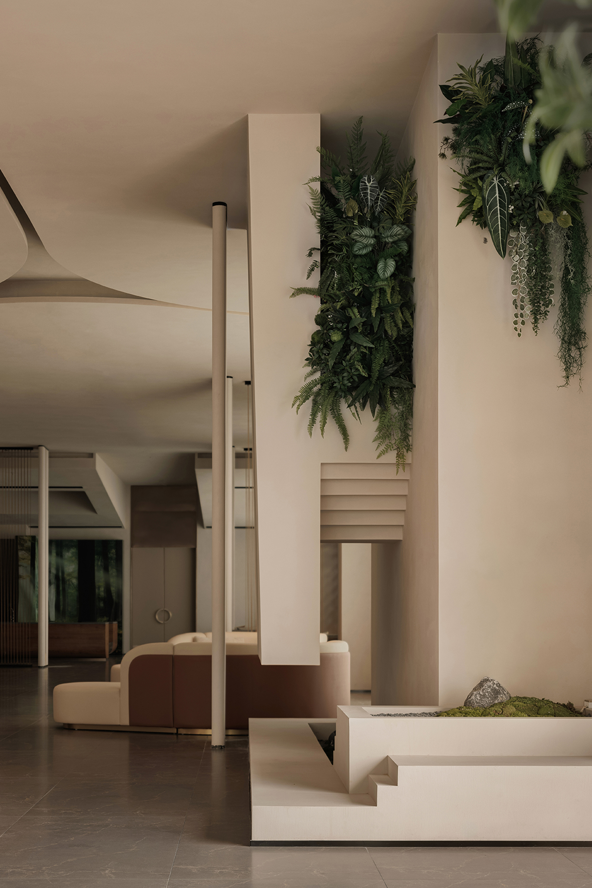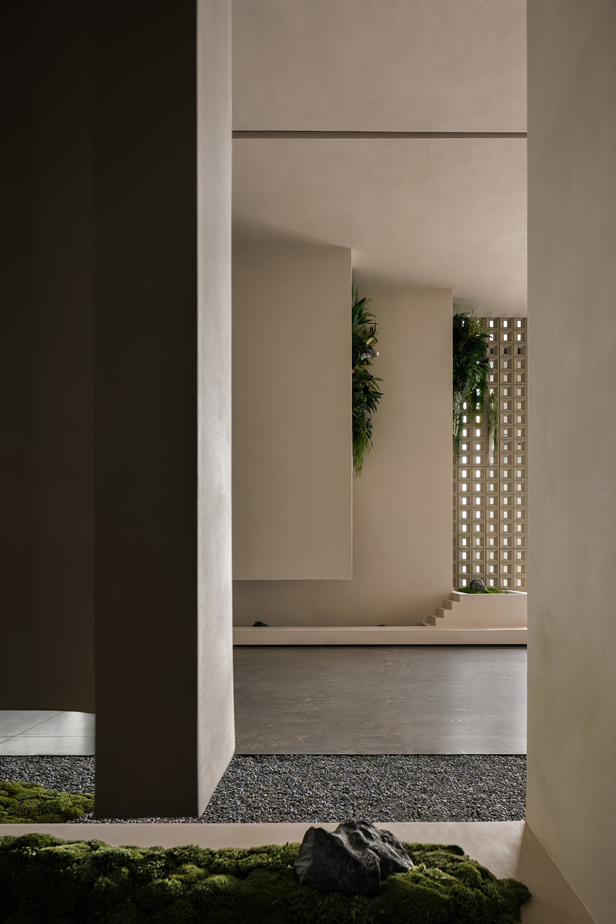 The hotel lobby, as the emotional starting point of the entire space, responds to the order of nature through understated proportions and minimalist composition. The space takes “light” as its main narrative thread, allowing the structure itself to become a storytelling medium. The circulation unfolds in a gentle rhythm, with greenery and small-scale landscapes interspersed throughout, bringing vitality into the quiet atmosphere—like strolling through a hidden natural sanctuary where each step reveals a new scene.