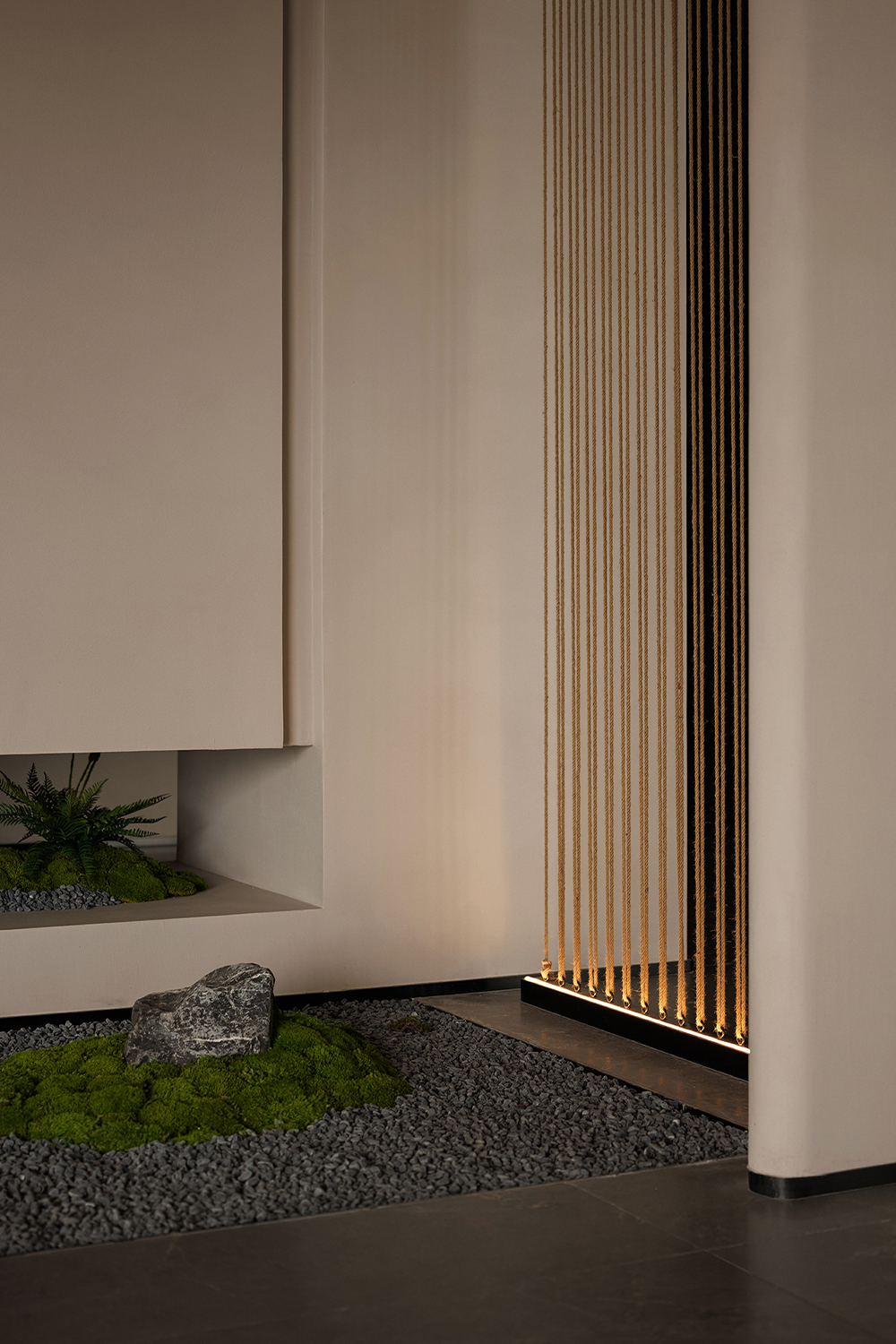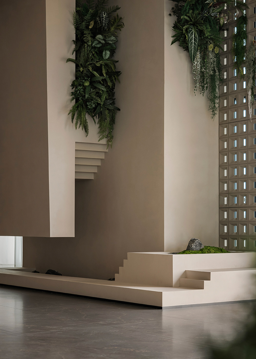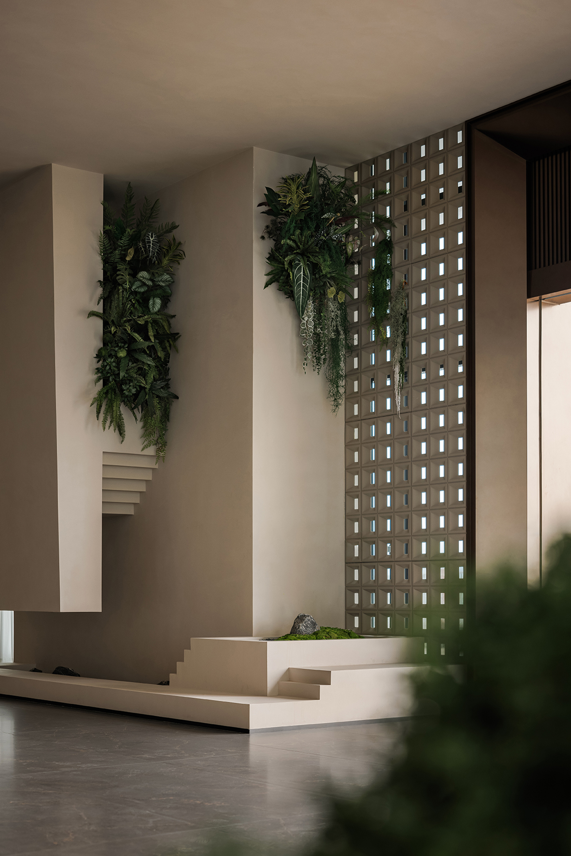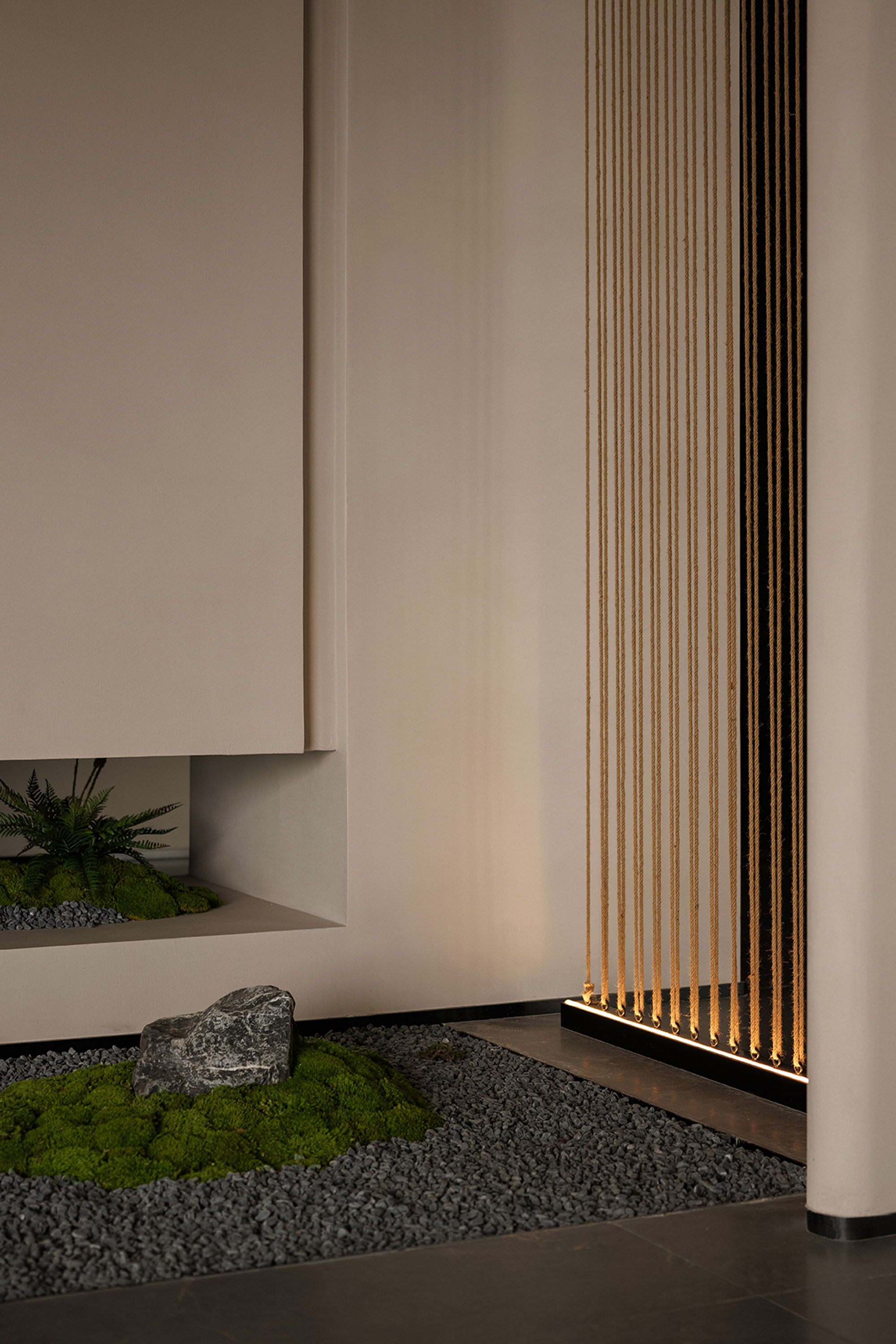 The hotel lobby, as the emotional starting point of the entire space, responds to the order of nature through understated proportions and minimalist composition. The space takes “light” as its main narrative thread, allowing the structure itself to become a storytelling medium. The circulation unfolds in a gentle rhythm, with greenery and small-scale landscapes interspersed throughout, bringing vitality into the quiet atmosphere—like strolling through a hidden natural sanctuary where each step reveals a new scene.