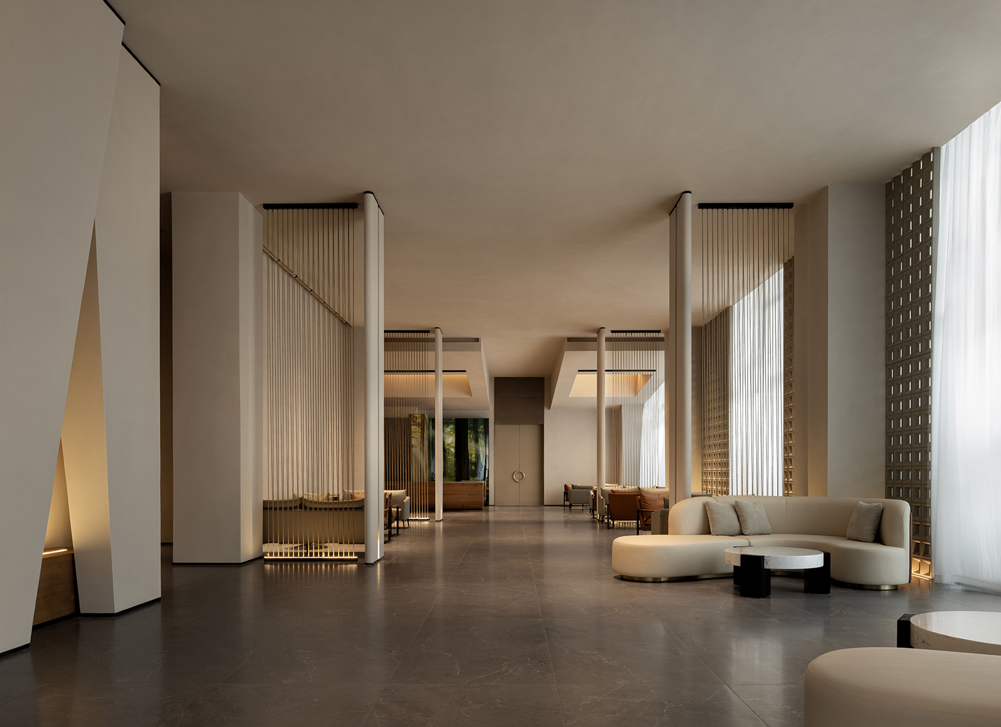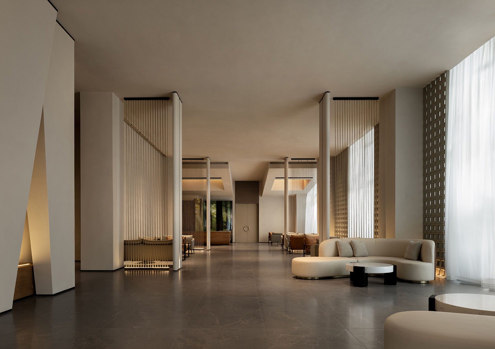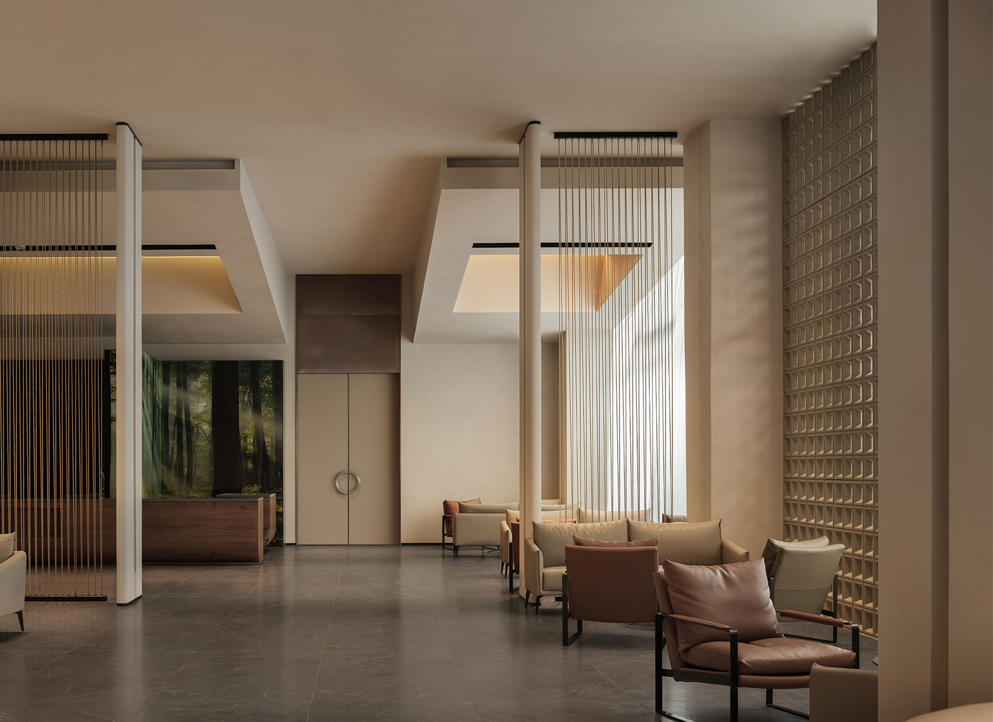 A semi-transparent partition formed by metal chain curtains and light creates a curtain of illumination that falls like raindrops. Both sight and light pass through freely, forming a gentle emotional transition and allowing the spatial sequence to breathe. The lounge area is furnished with low-saturation pieces in soft contours, adding a sense of ease to the seating arrangements.