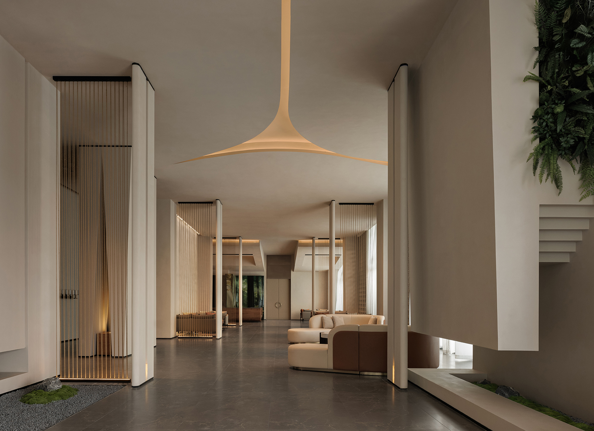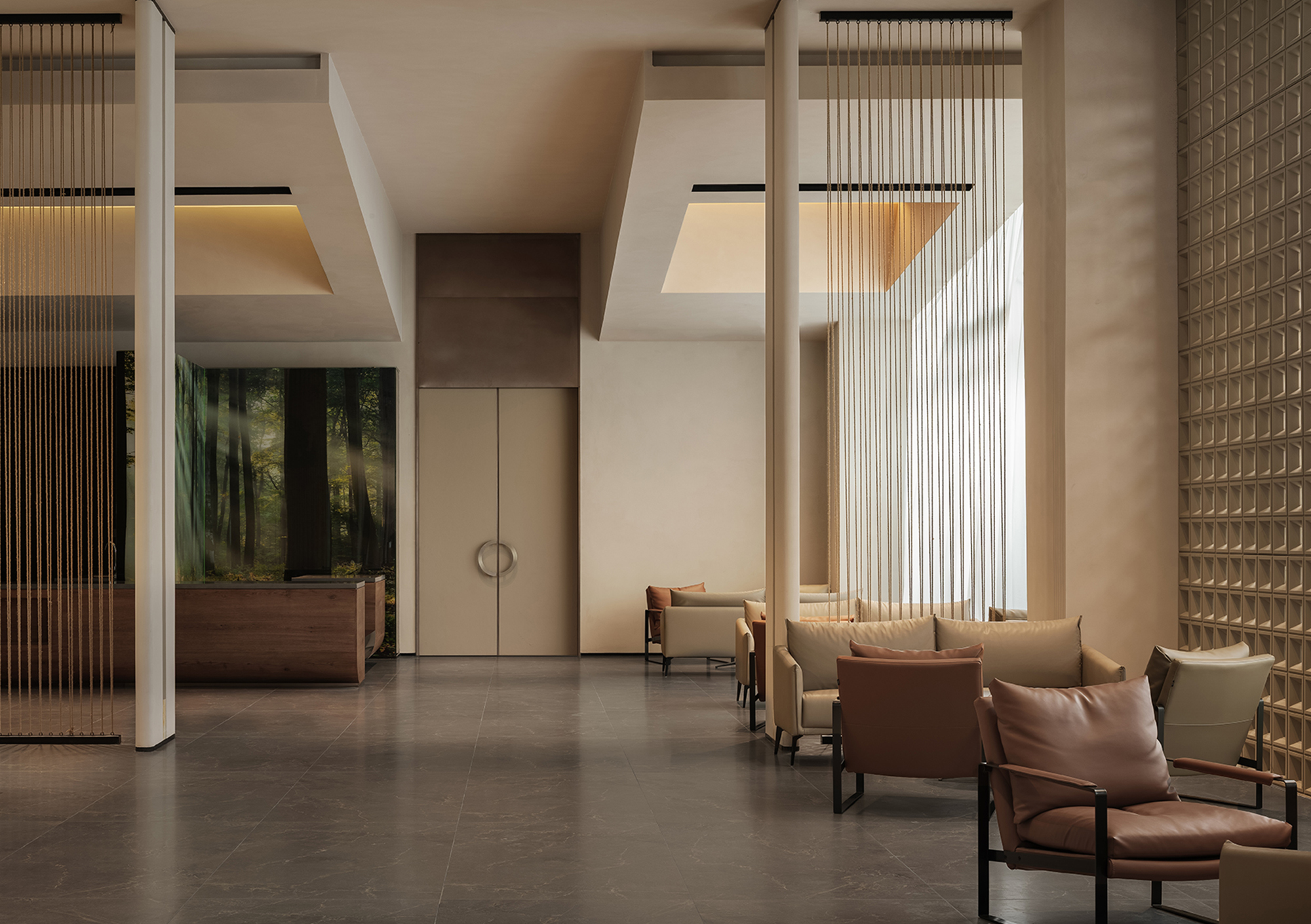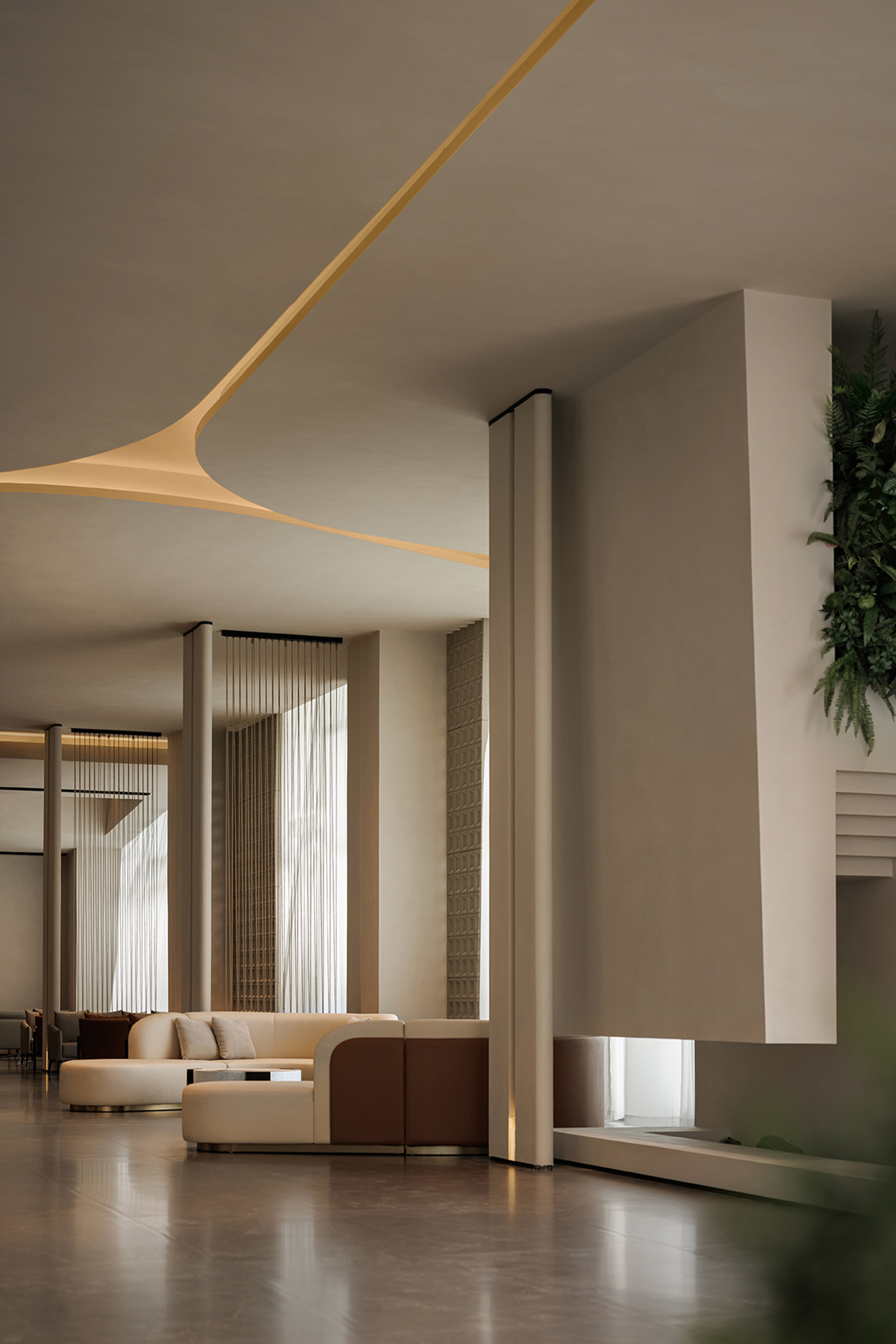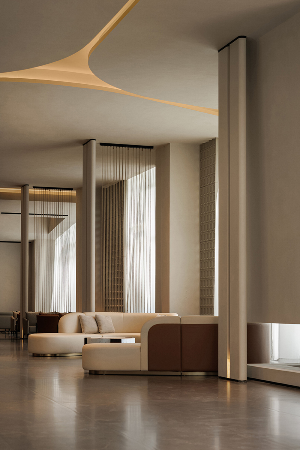 A semi-transparent partition formed by metal chain curtains and light creates a curtain of illumination that falls like raindrops. Both sight and light pass through freely, forming a gentle emotional transition and allowing the spatial sequence to breathe. The lounge area is furnished with low-saturation pieces in soft contours, adding a sense of ease to the seating arrangements.