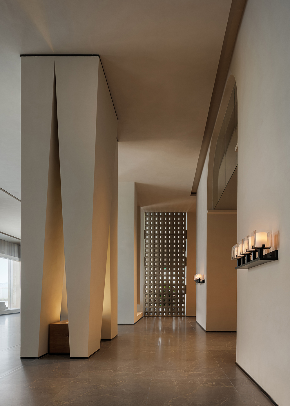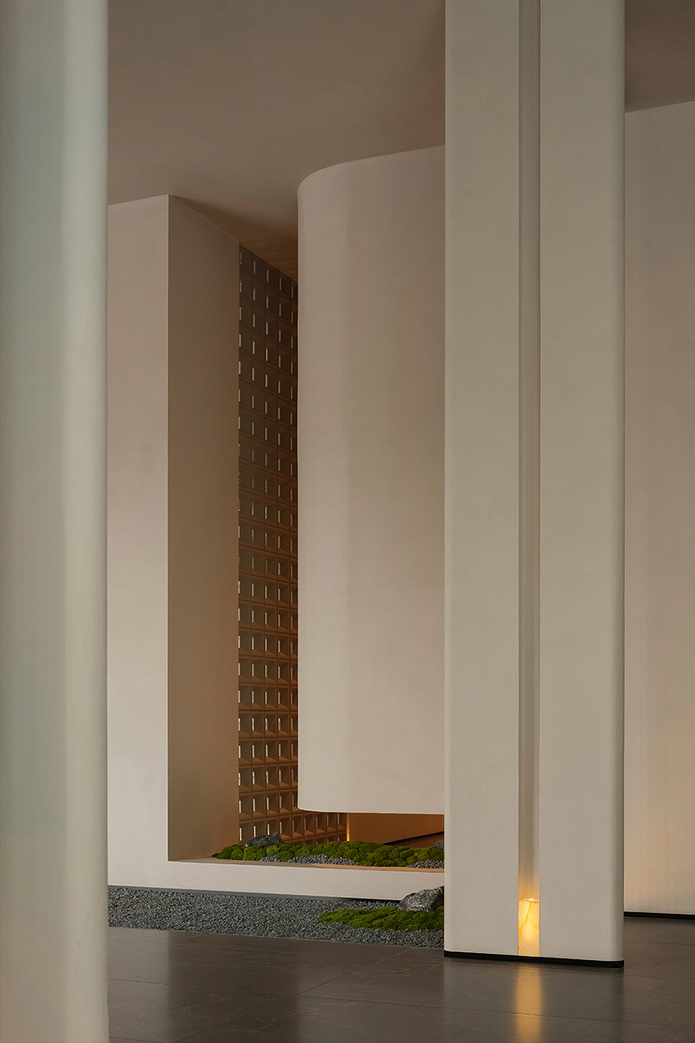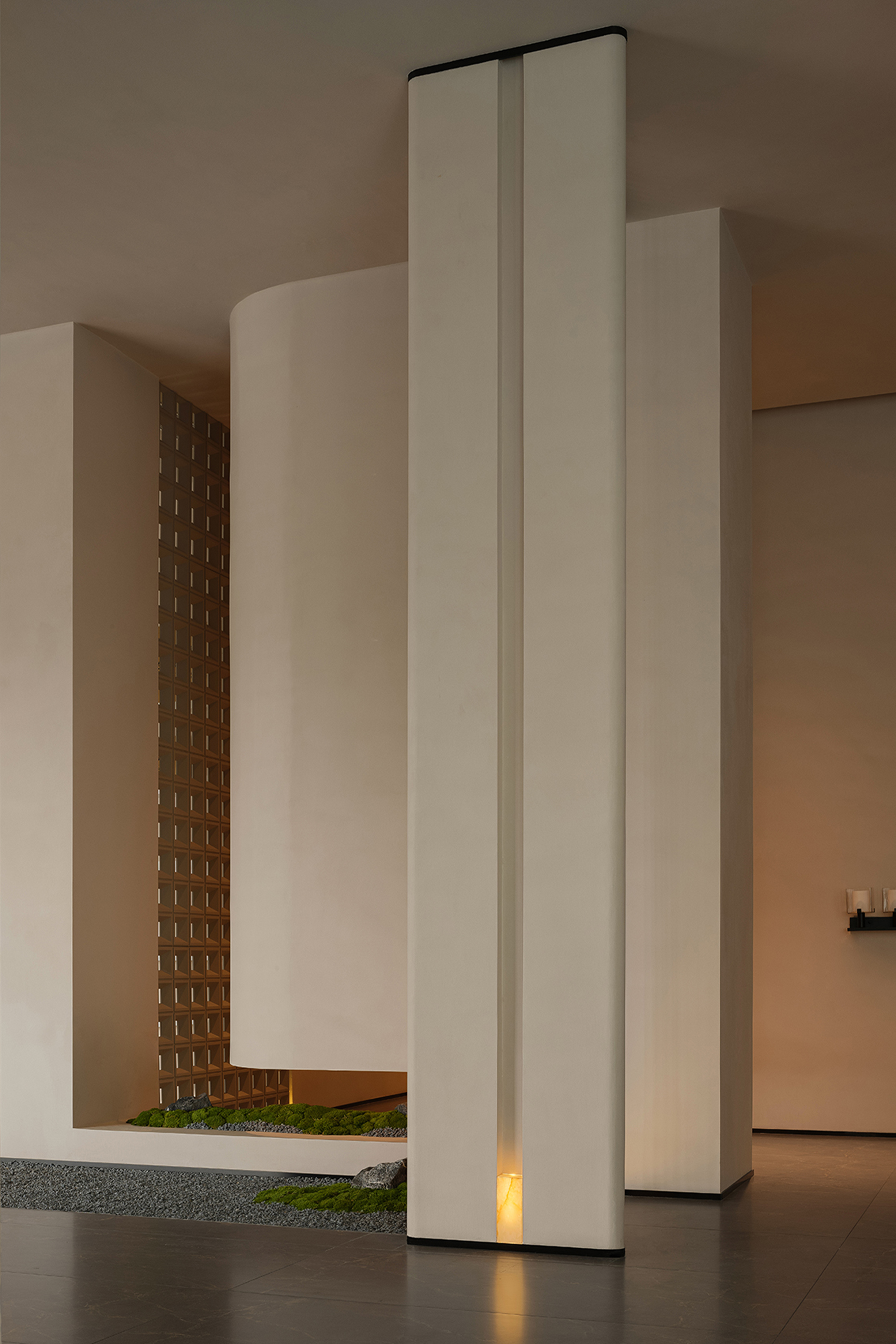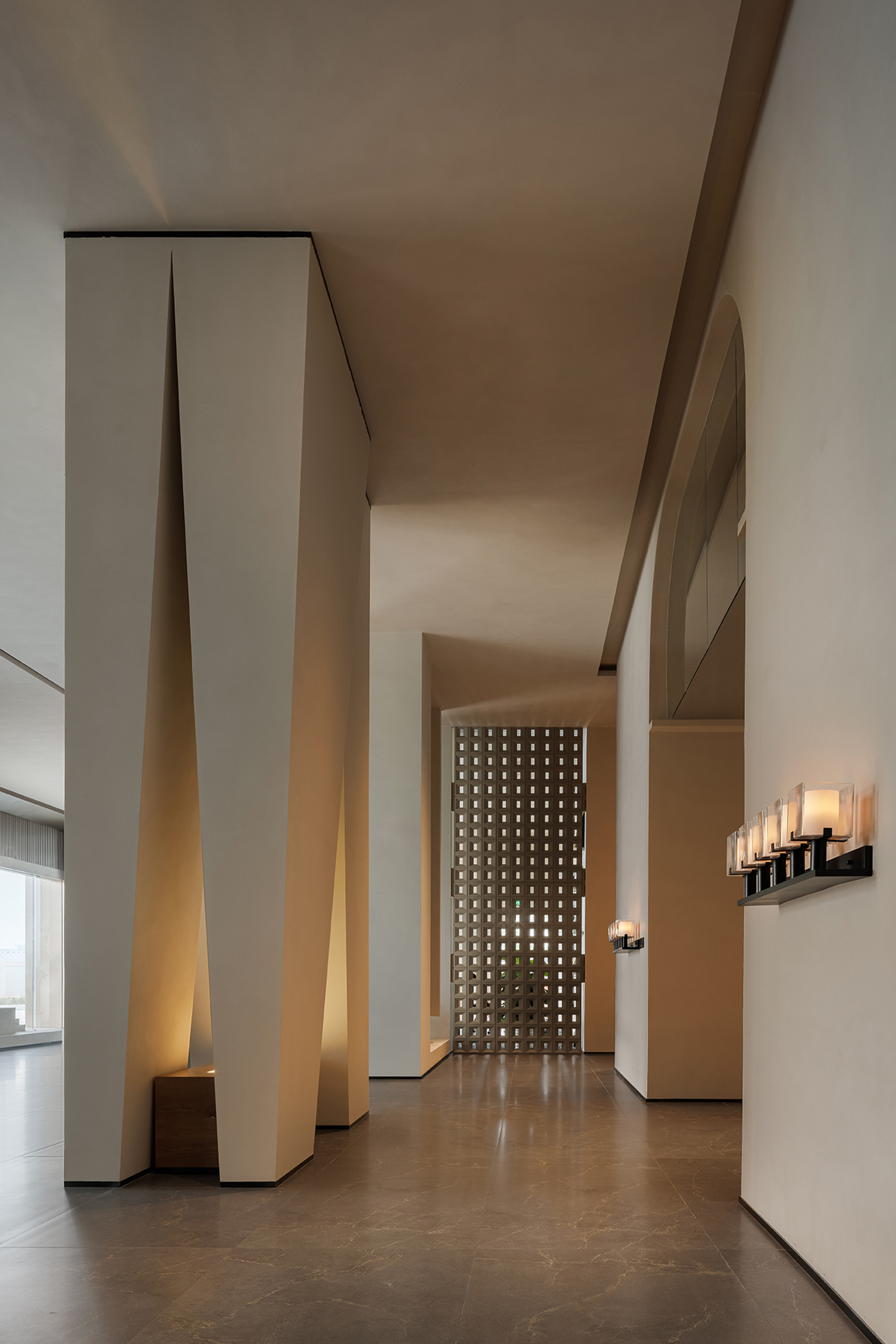 In its overall conception, the lobby embodies a chapel-like sense of spiritual calmness, using a strong sense of ritual to guide guests into an immersive setting detached from the city’s bustle. Light and shadow become the most essential design medium, shaping spatial volumes while reinforcing the spiritual character of the space. Through the interplay of light and shadow and the tactile quality of materials, the design awakens sensory perception. Grounded in natural materials and warm tones, and enhanced by sequential spatial rhythms and controlled detailing, it conveys a quiet, gentle, yet powerful spatial atmosphere.