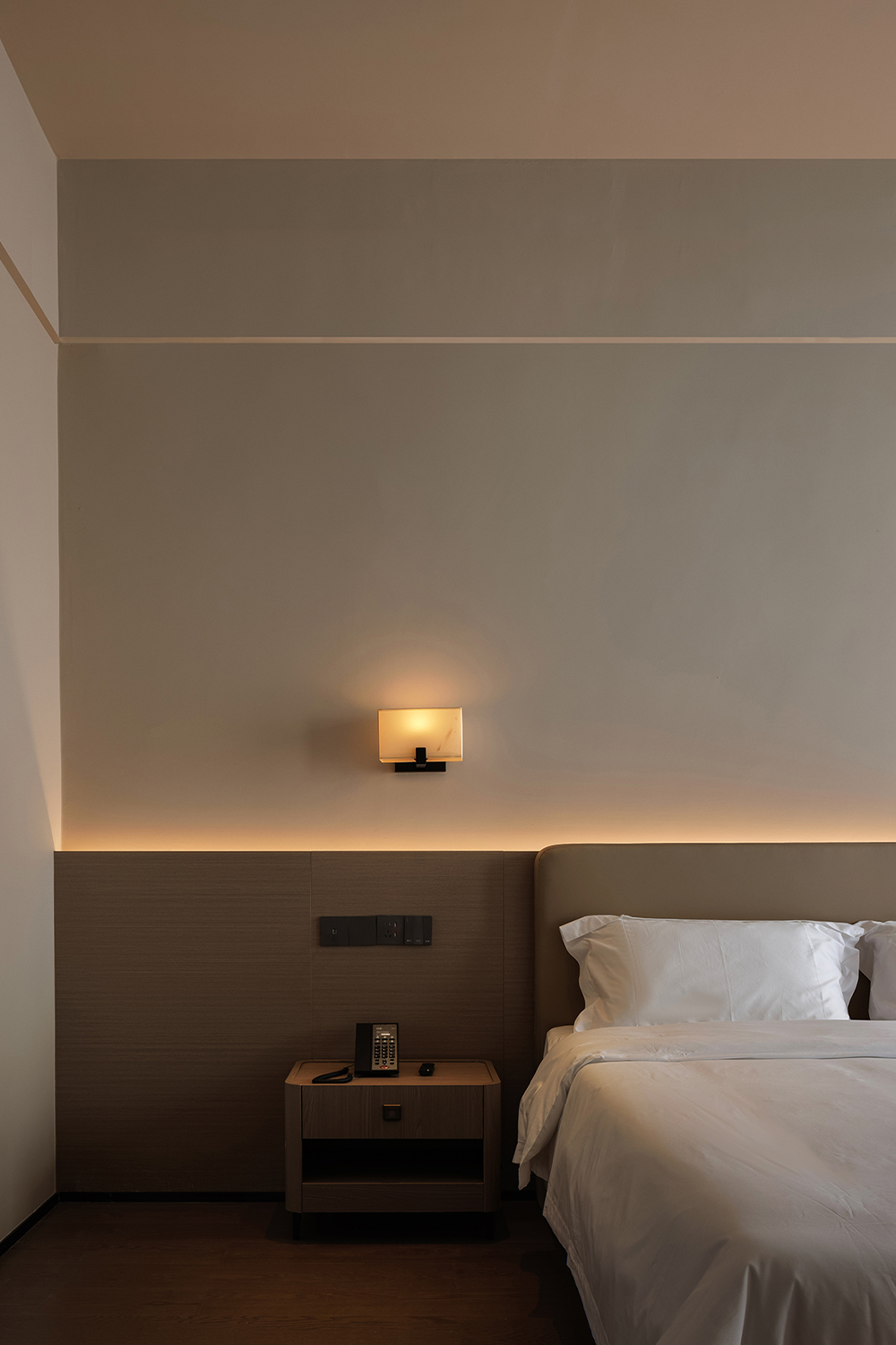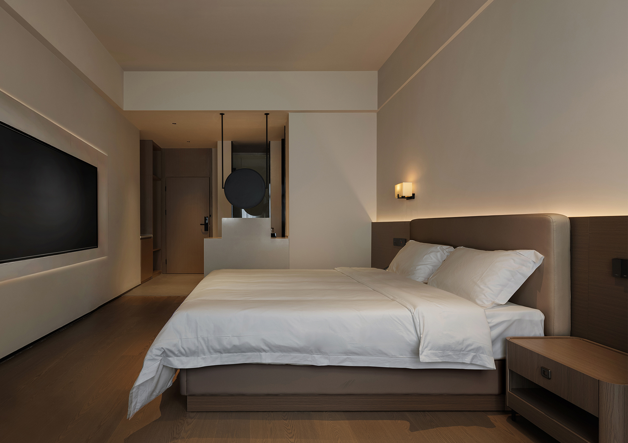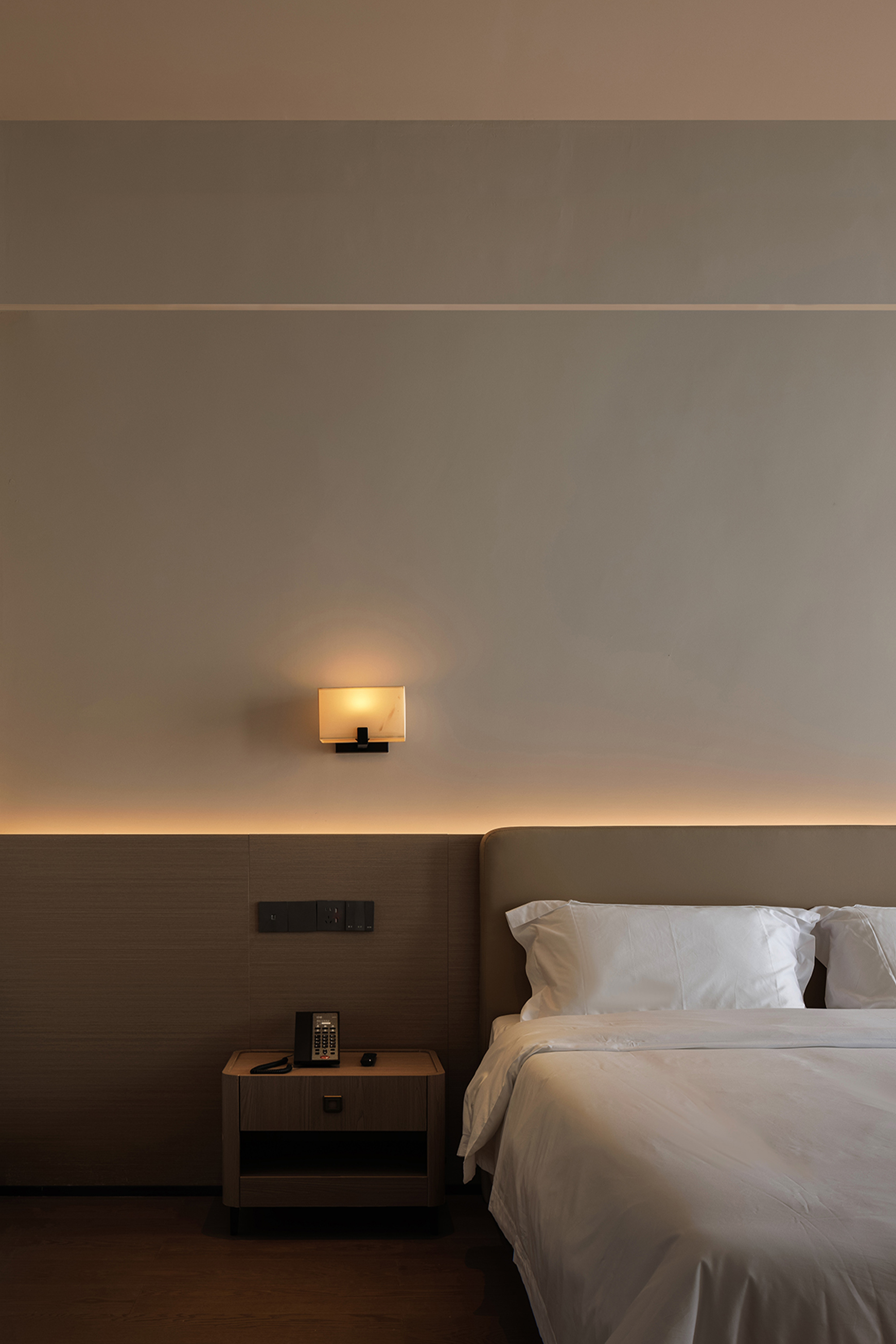 The elevator lobby continues the natural palette of the overall space, finely weaving together materiality, light and shadow, and function to redefine relaxation within an urban hotel. With minimalist lines and tender textures, it creates a space imbued with warmth. In the guest rooms, natural wood grain combines with neutral tones of light beige and warm gray, complemented by fabrics, leather, and other natural materials to form a softly layered environment. The transition between wall and floor is clean and seamless, while concealed lighting glows like dusk, gently softening the boundaries of the space.
