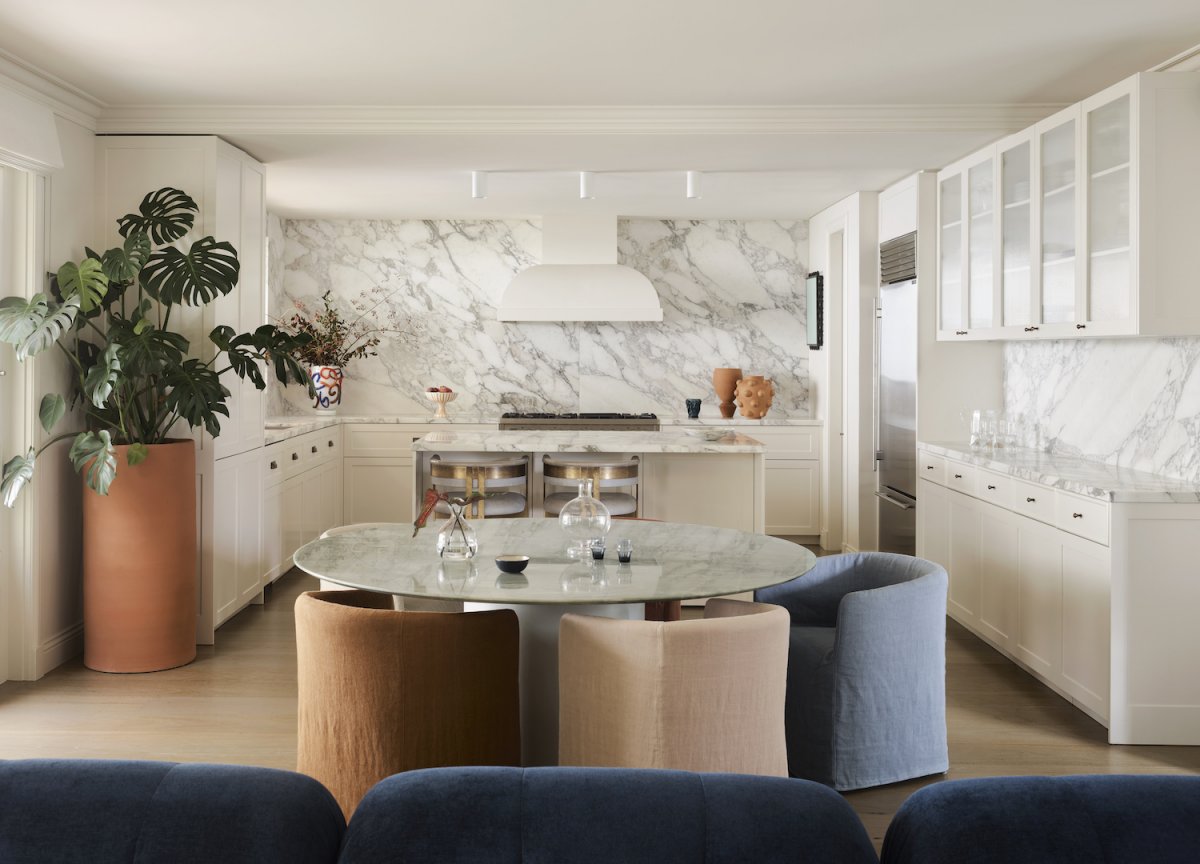 Taking a step inside, Tamsin Johnson has introduced a calming interior scheme. A navy blue Sofa sets a soft and curvaceous tone in the living space, together with the stone circular dining table and upholstered dining chairs. Classic white cabinetry and grey Carrara marble define the kitchen, with mid-century-inspired elements.