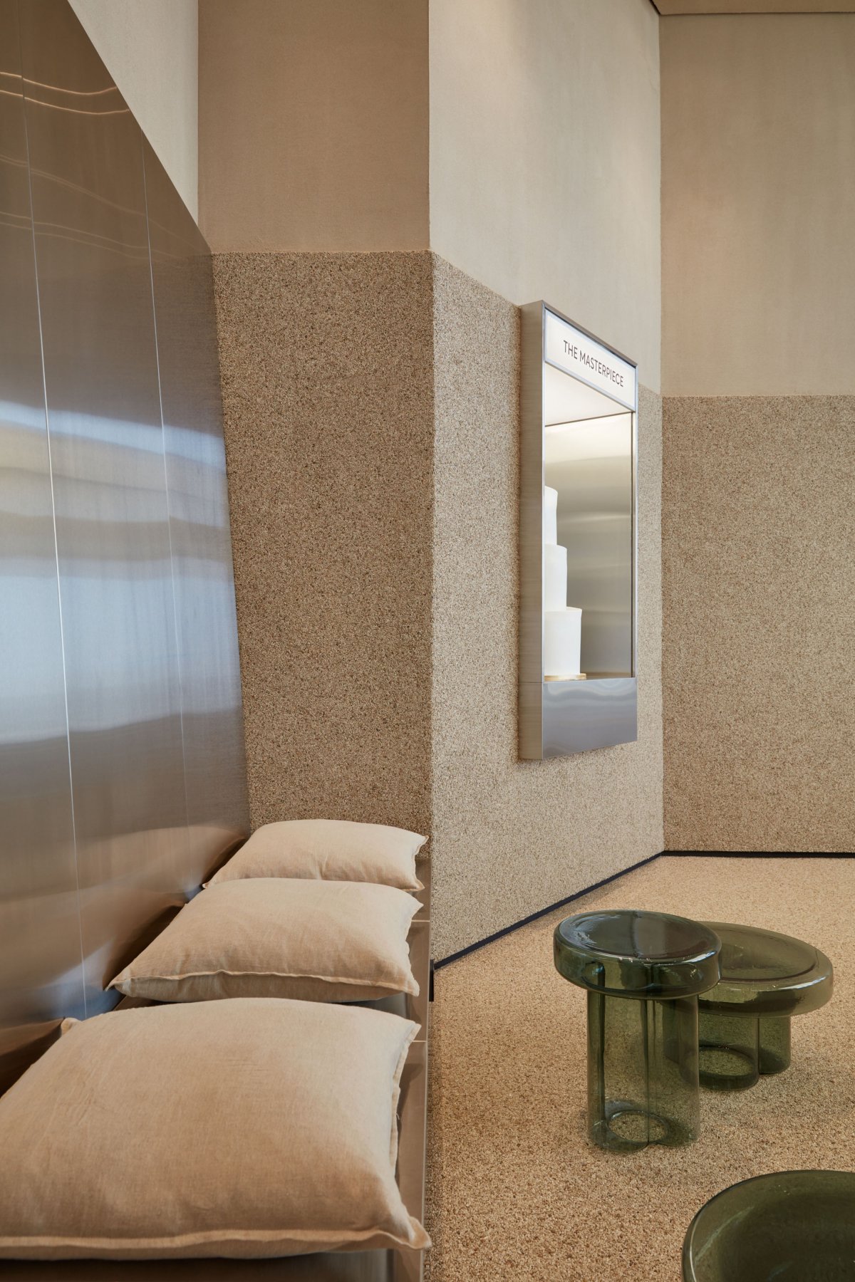 The final stage of the journey brings visitors to a gallery-like space, where the baked masterpieces are showcased in similar stainless steel display boxes. The space is designed to resemble the feel of a ‘factory’, an elegant, sharp, sleek and clean approach to an industrial choice of materials.