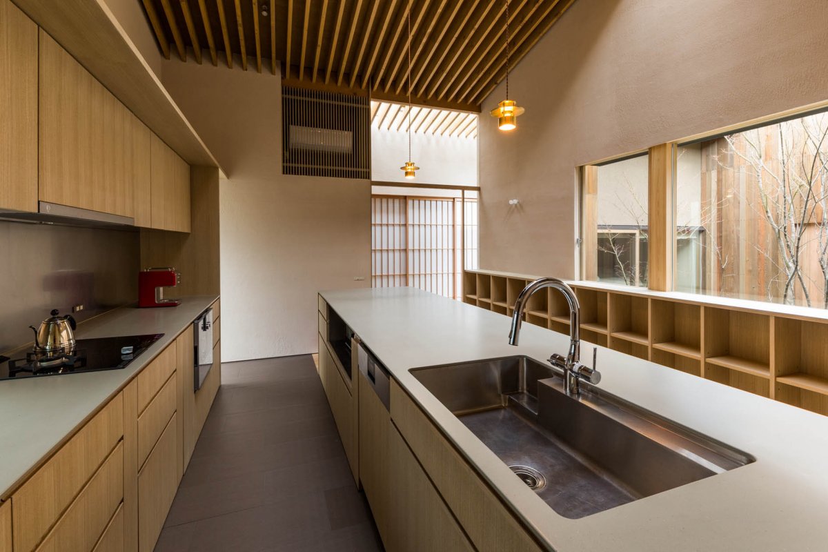 All the rooms except the children's room are located on the first floor so that the dining room, kitchen and master bedroom can be seen through the courtyard. Looking north from the dining room through the courtyard, you can see the planting of the next house on the bedroom of the one-story house.