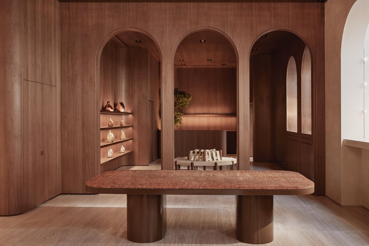 It is a world of travertine marble floors, walnut wood walls and other custom-made surfaces, innovative and uniquely commissioned furniture created from leather scraps, an extraordinary glass chamber containing an imposing robotic arm capable of designing and fabricating leather creations before the customer’s eyes. We are invited into a domain of noble materials, exalted further by a harmony of shape and form, where every detail is lived. The visitor is offered a vibrant wealth of stories to inhabit, materials to experience and sensations to explore.