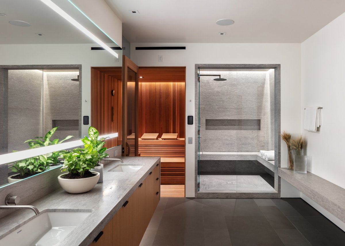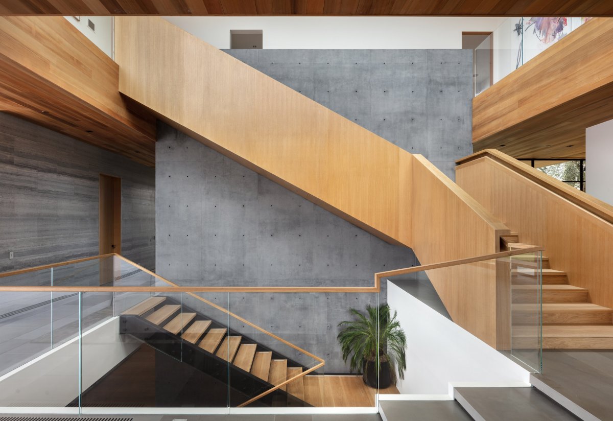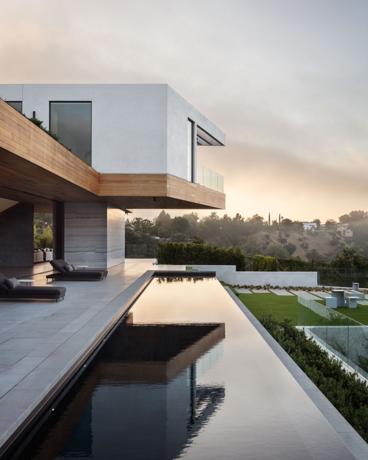 A mix of materials were used for the facades, including western red cedar, concrete and white stucco. Large stretches of glass usher in natural light while enabling the homeowners to take in the scenery.The front of the home has a long pool that . The rear yard features a patchwork of patios and gardens, along with an infinity-edge lap pool that stretches 84 feet (26 metres).The living room, kitchen and dining area occupy the centre of the dwelling, where numerous apertures dissolve the boundary between inside and out.