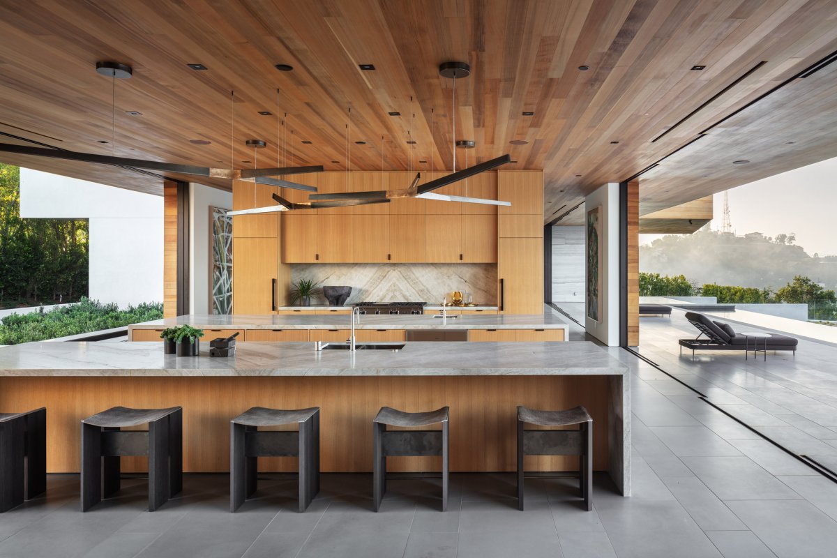 Rising three storeys, the Carla House sits atop a secluded ridge overlooking LA's hilly terrain and distant mountains.The iconic Hollywood sign is visible from the home, which is located in the coveted Trousdale Estates neighbourhood,