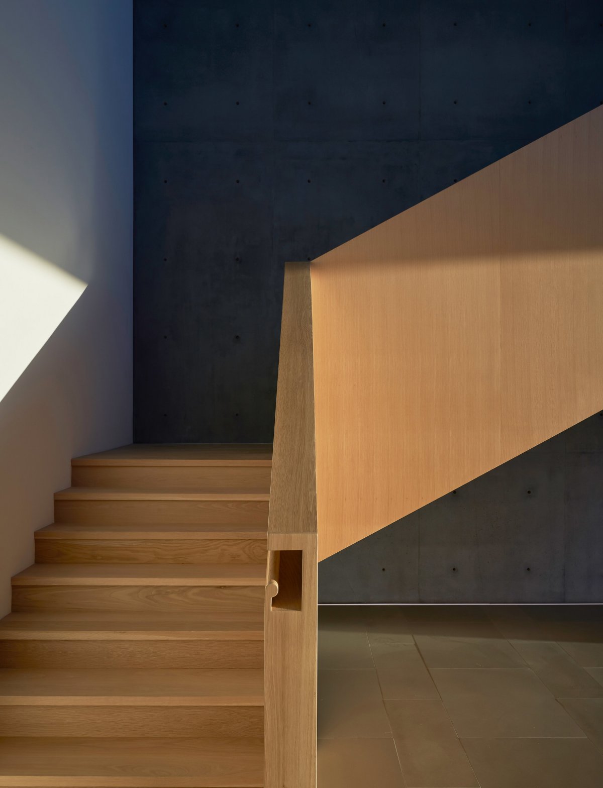 Walker Workshop Rather than creating a single, hulking mass, broke up the house into two wings that are slightly rotated to ensure optimal vistas. The wings are connected by a low-lying central volume with ample glazing.Finishes in the public zone and elsewhere include grey tile flooring, white walls and ceilings wrapped in honey-toned cedar.