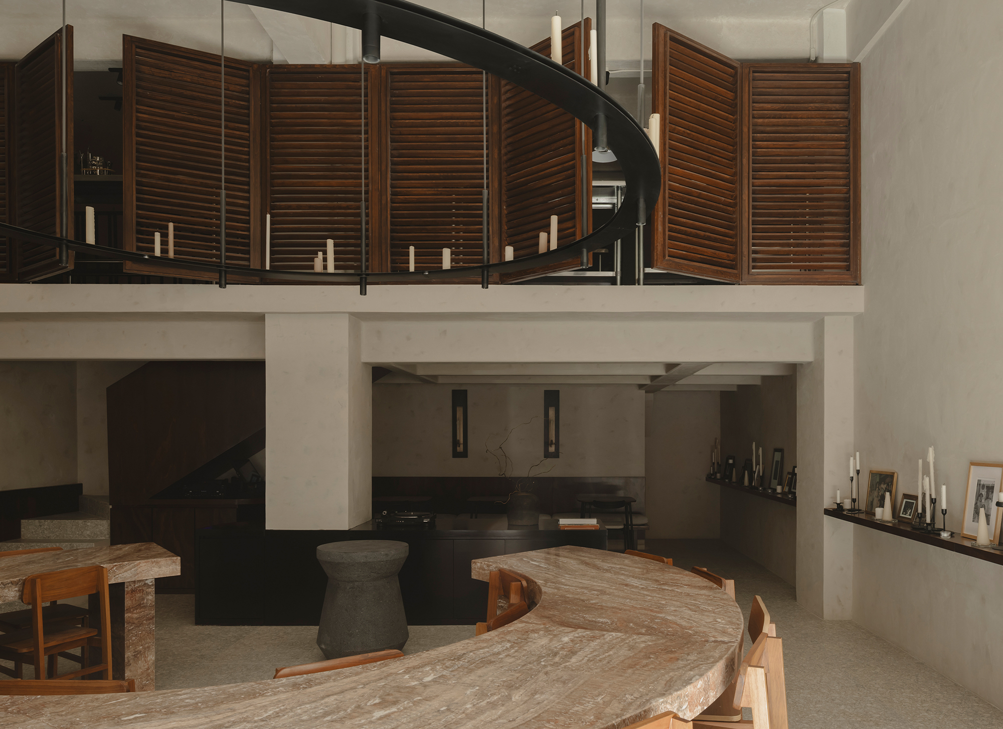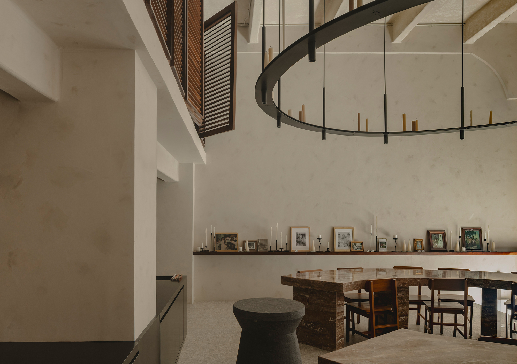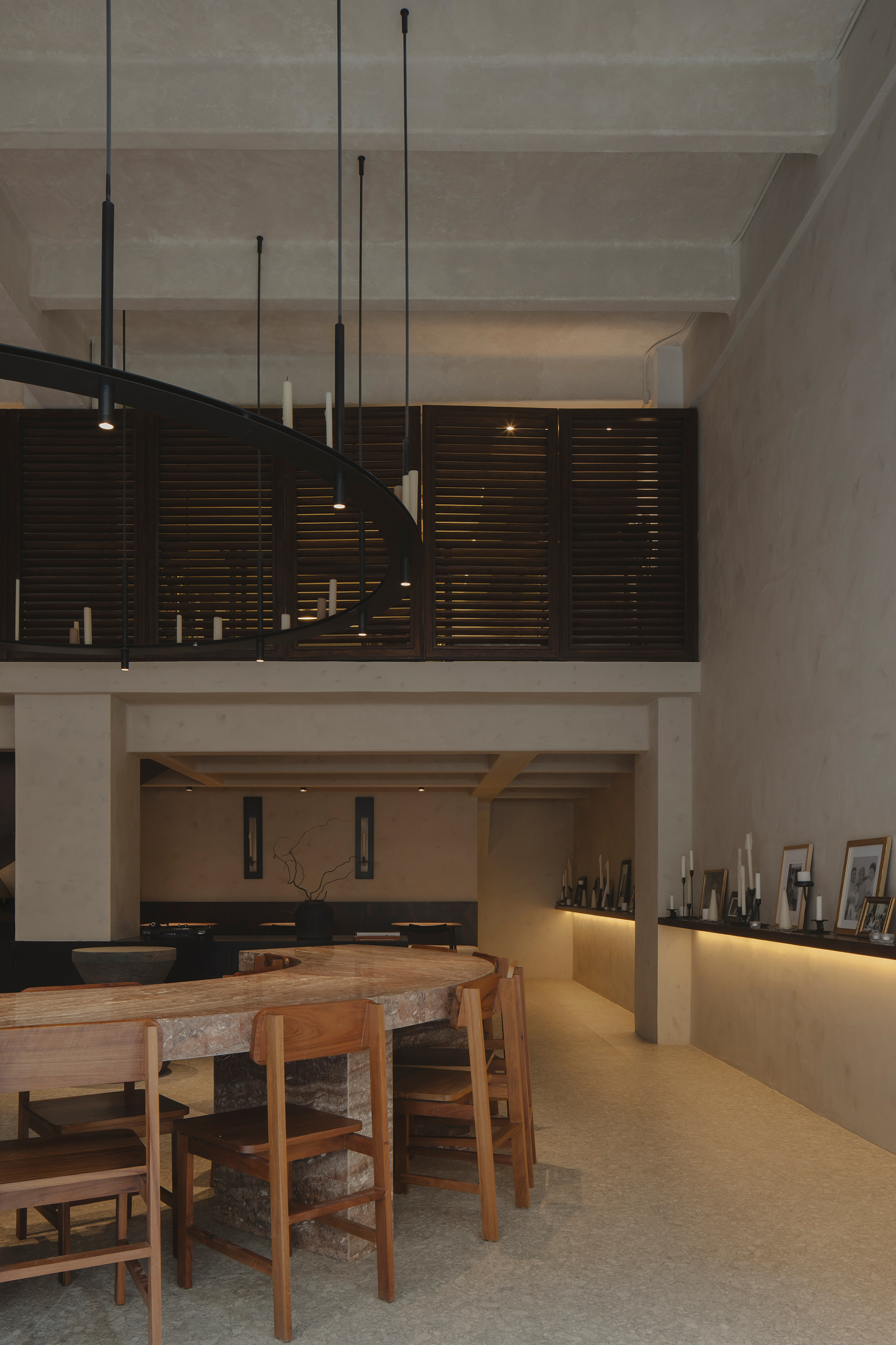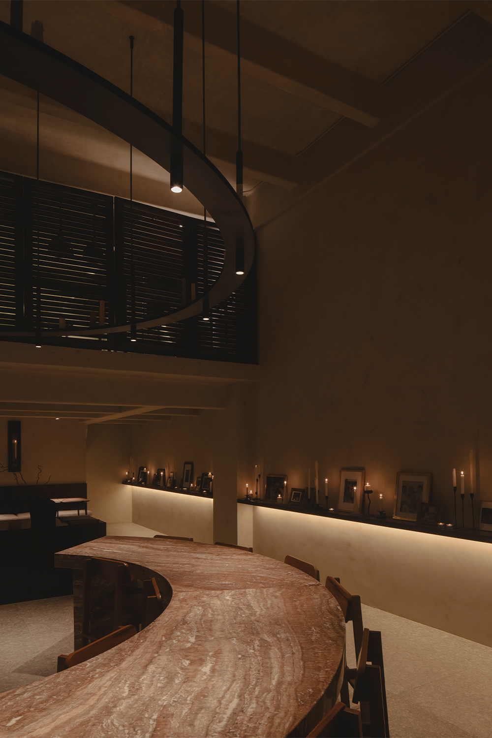 Architecture responds to that same idea. It’s not a neutral container, but a stage that holds and amplifies the act of sharing. At the center a big red stone table is the heart of the restaurant. Here glances, words, affections and presences converge, all in one gesture. The spatial organization is based on a single decision: free the ground floor for diners and elevate the kitchen so hosting and sharing is the core of the experience.