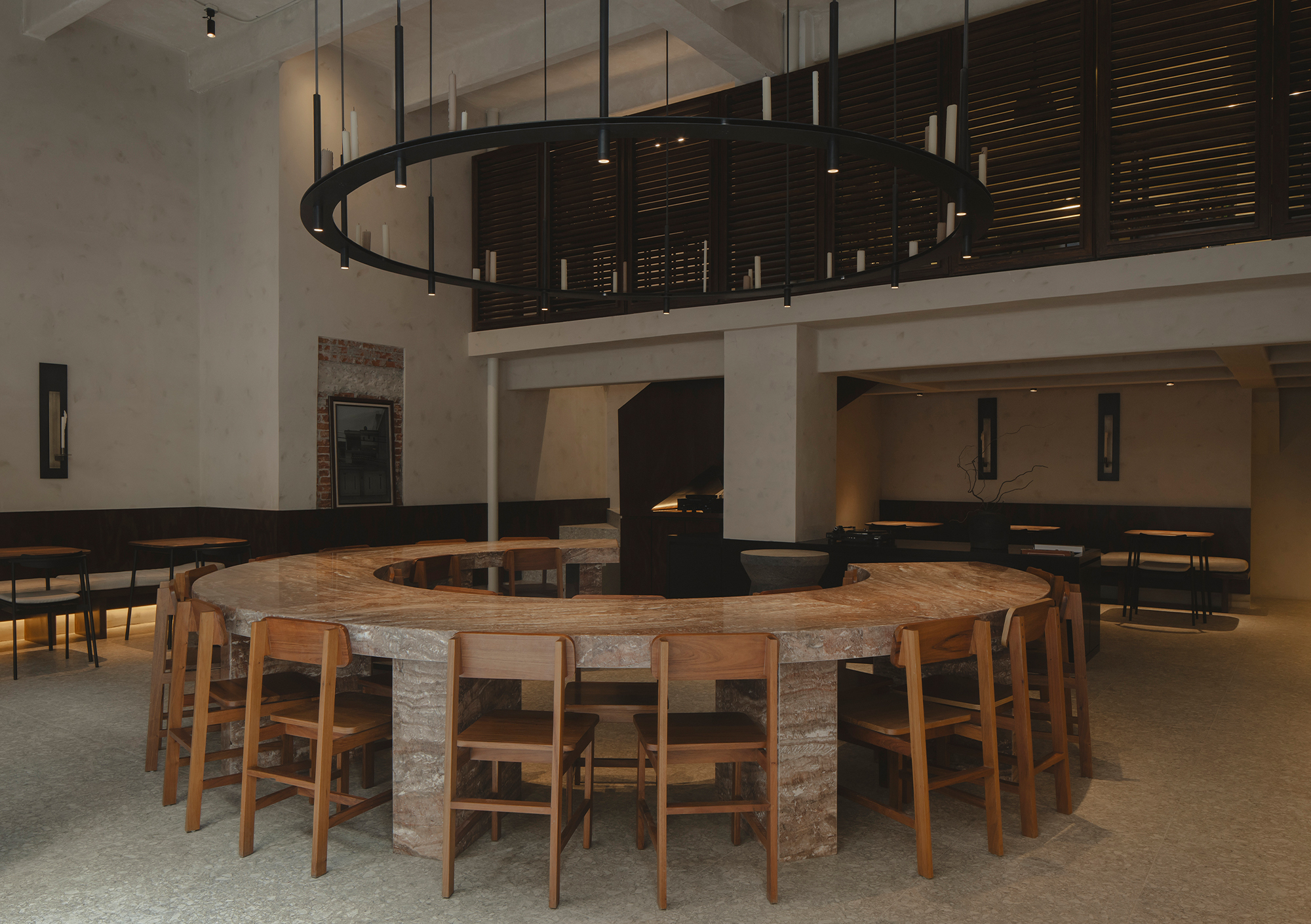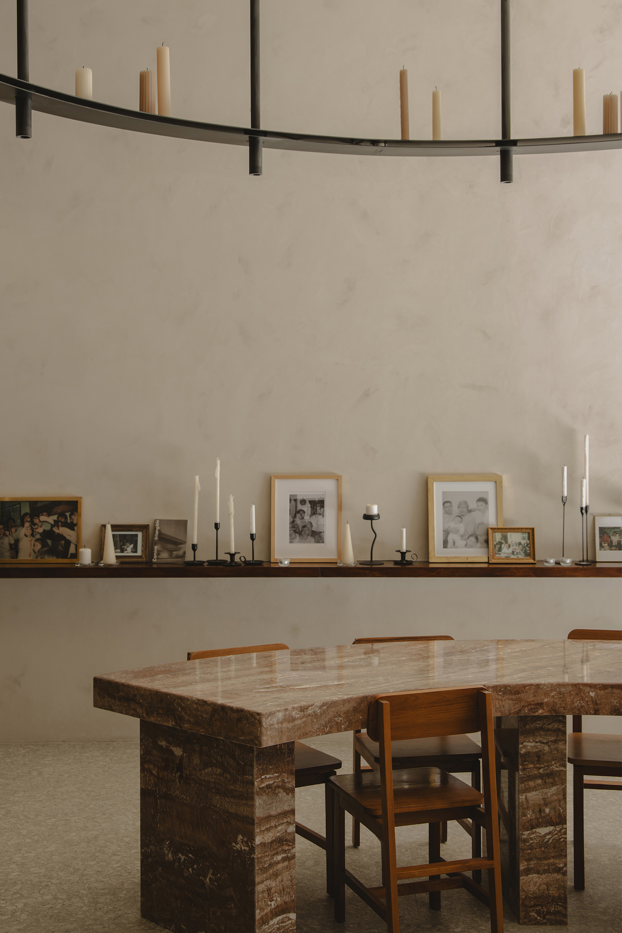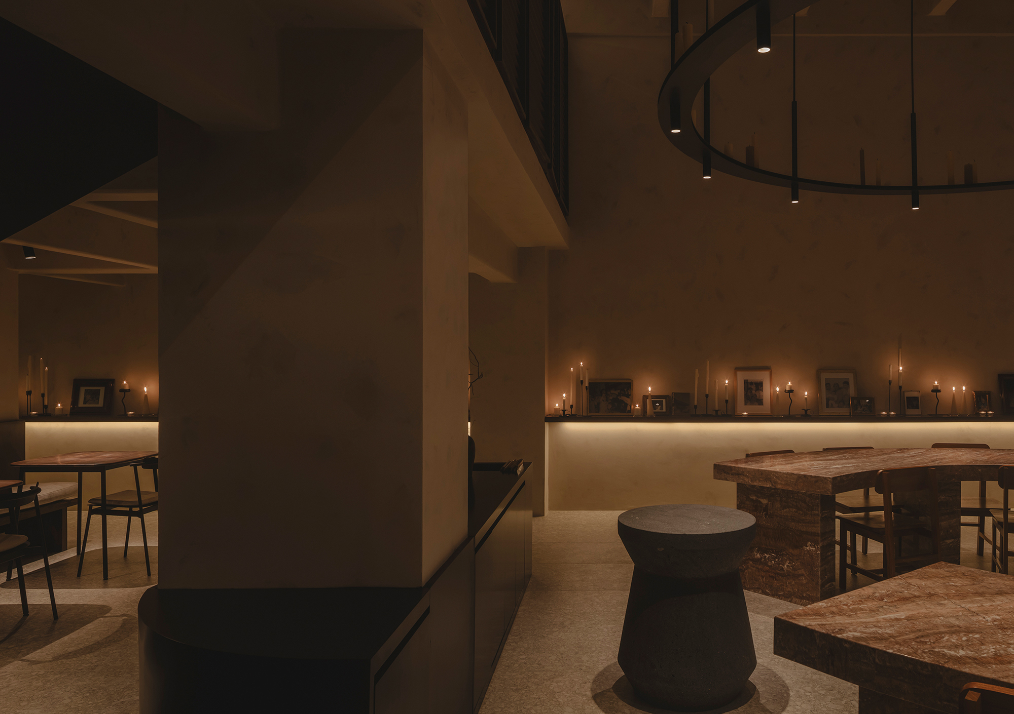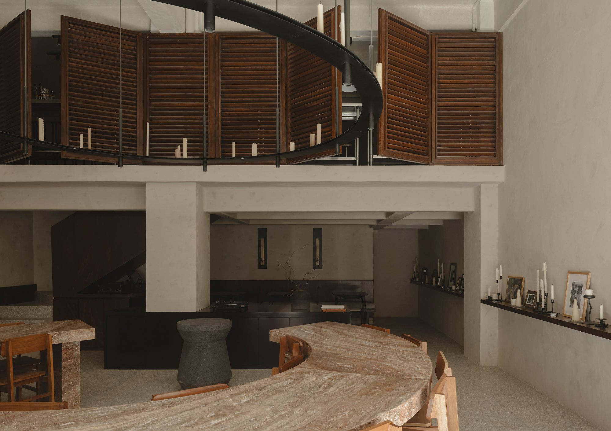 Architecture responds to that same idea. It’s not a neutral container, but a stage that holds and amplifies the act of sharing. At the center a big red stone table is the heart of the restaurant. Here glances, words, affections and presences converge, all in one gesture. The spatial organization is based on a single decision: free the ground floor for diners and elevate the kitchen so hosting and sharing is the core of the experience.