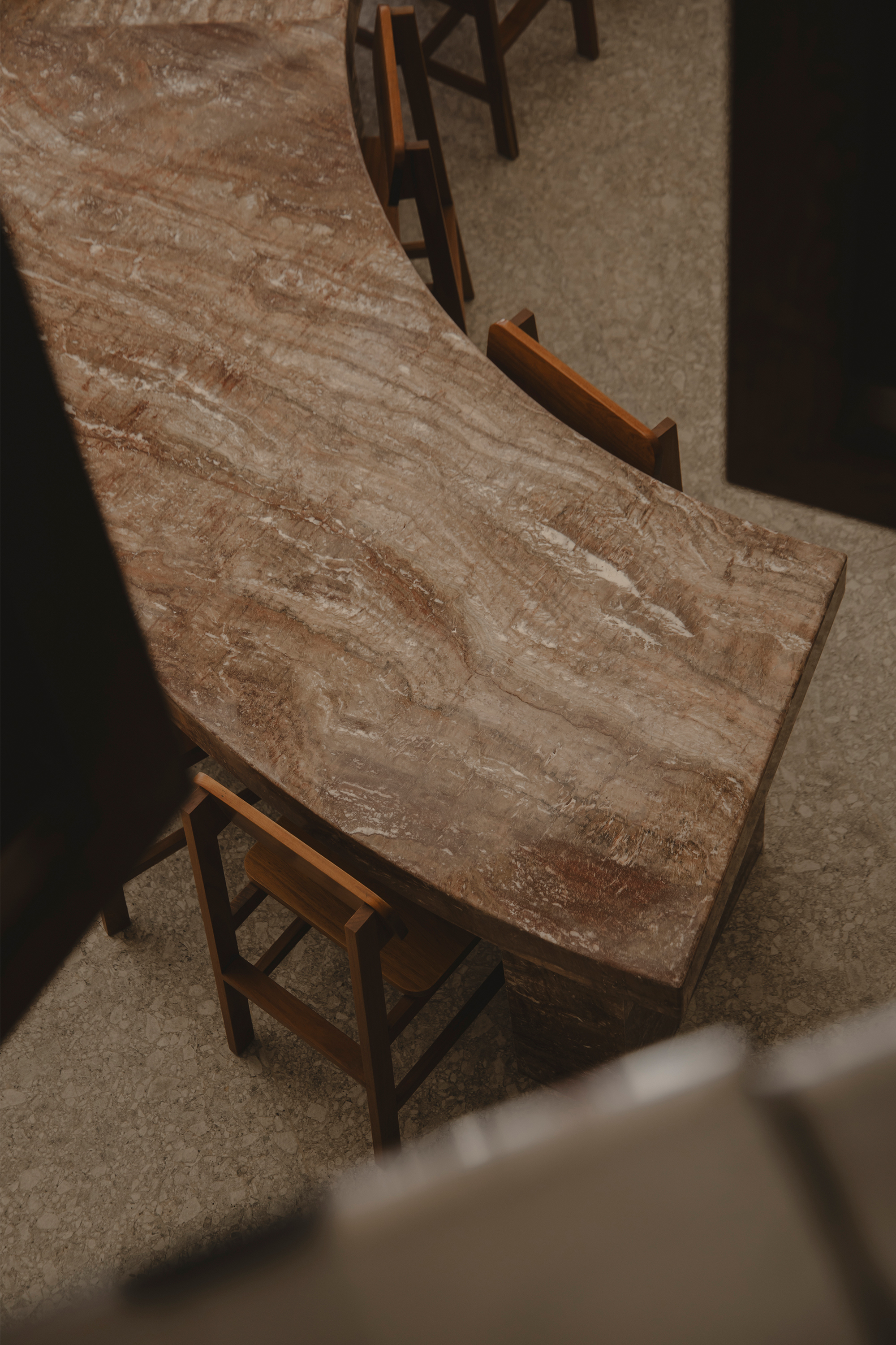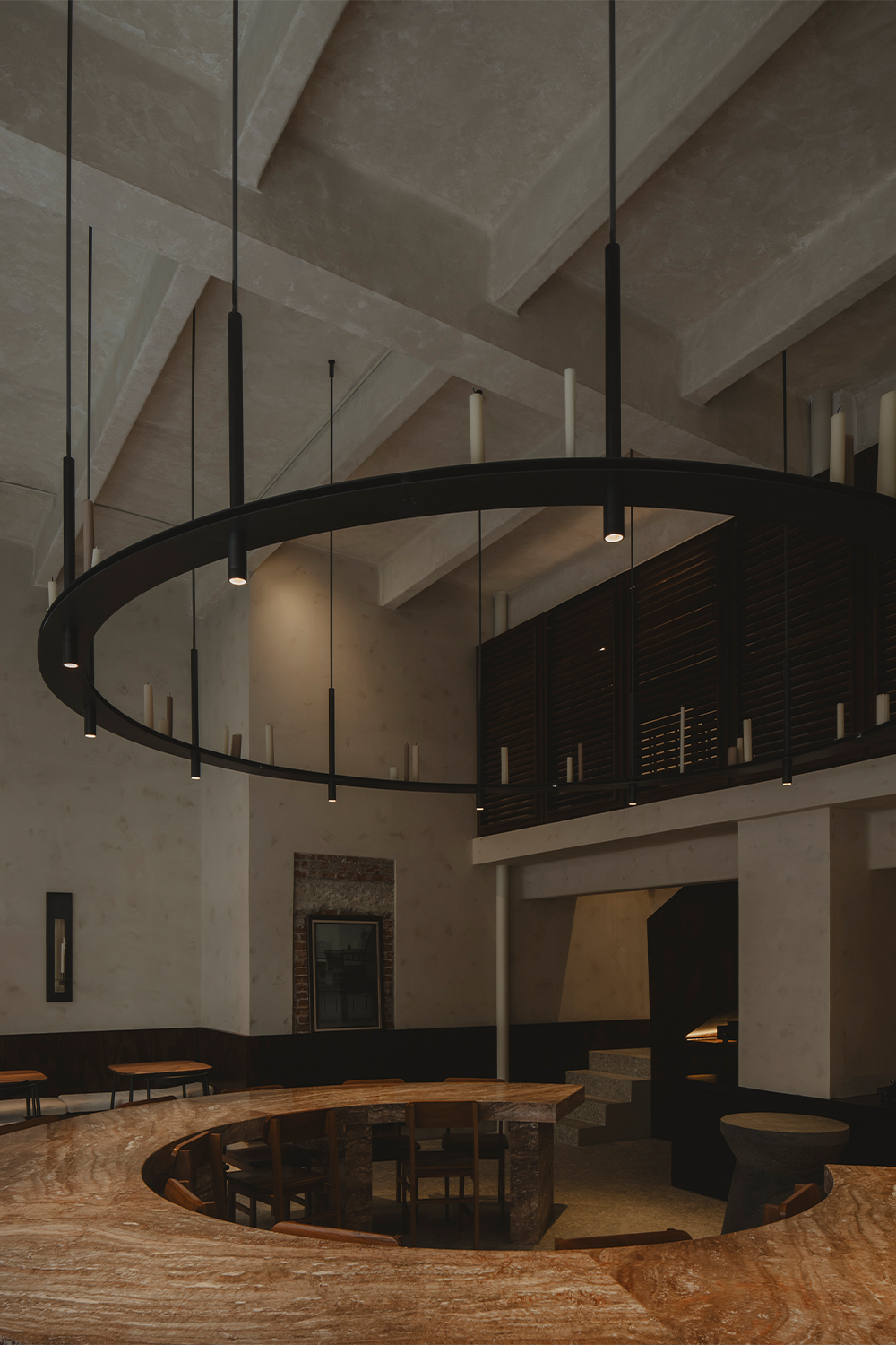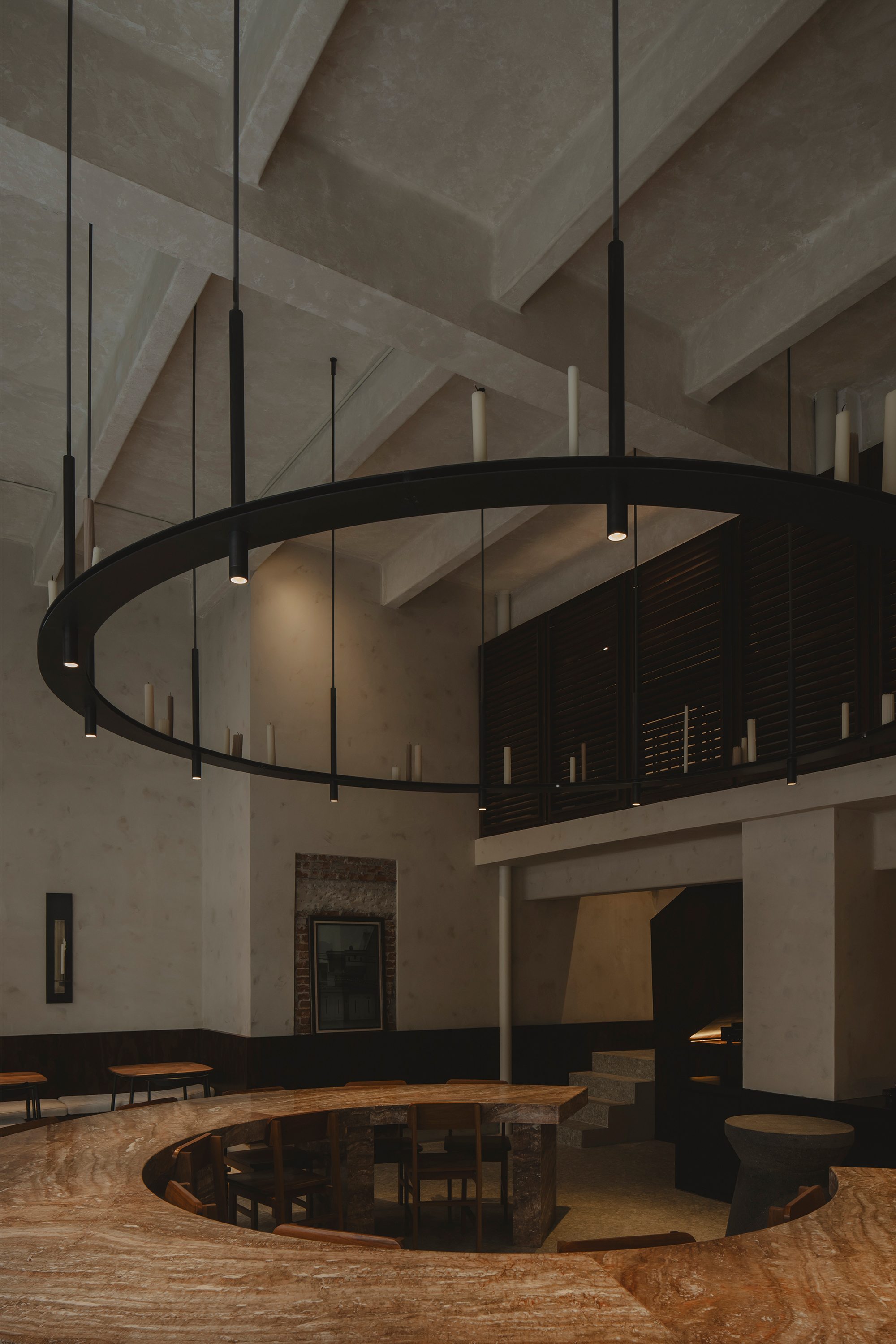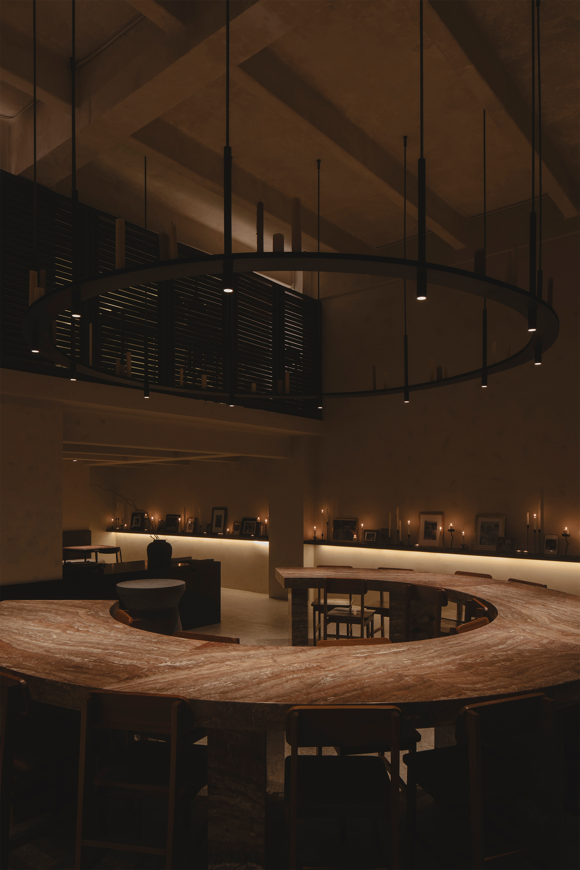 The central table is both sculptural and symbolic, it organizes the space. Around it a stone totem and a metal light structure reinforce the verticality, the ritual character of the project. Brass detailed walls and stone accent lighting follow the path and the whole. Furniture and tableware extend this idea. Designed and selected with the same criteria they expand the concept of containment and hospitality to every detail. Wood supports, stone grounds, light softens.