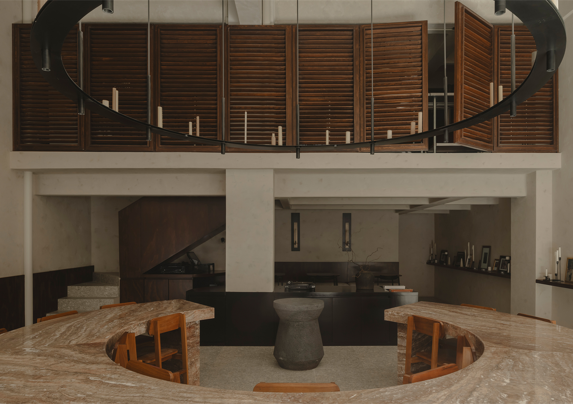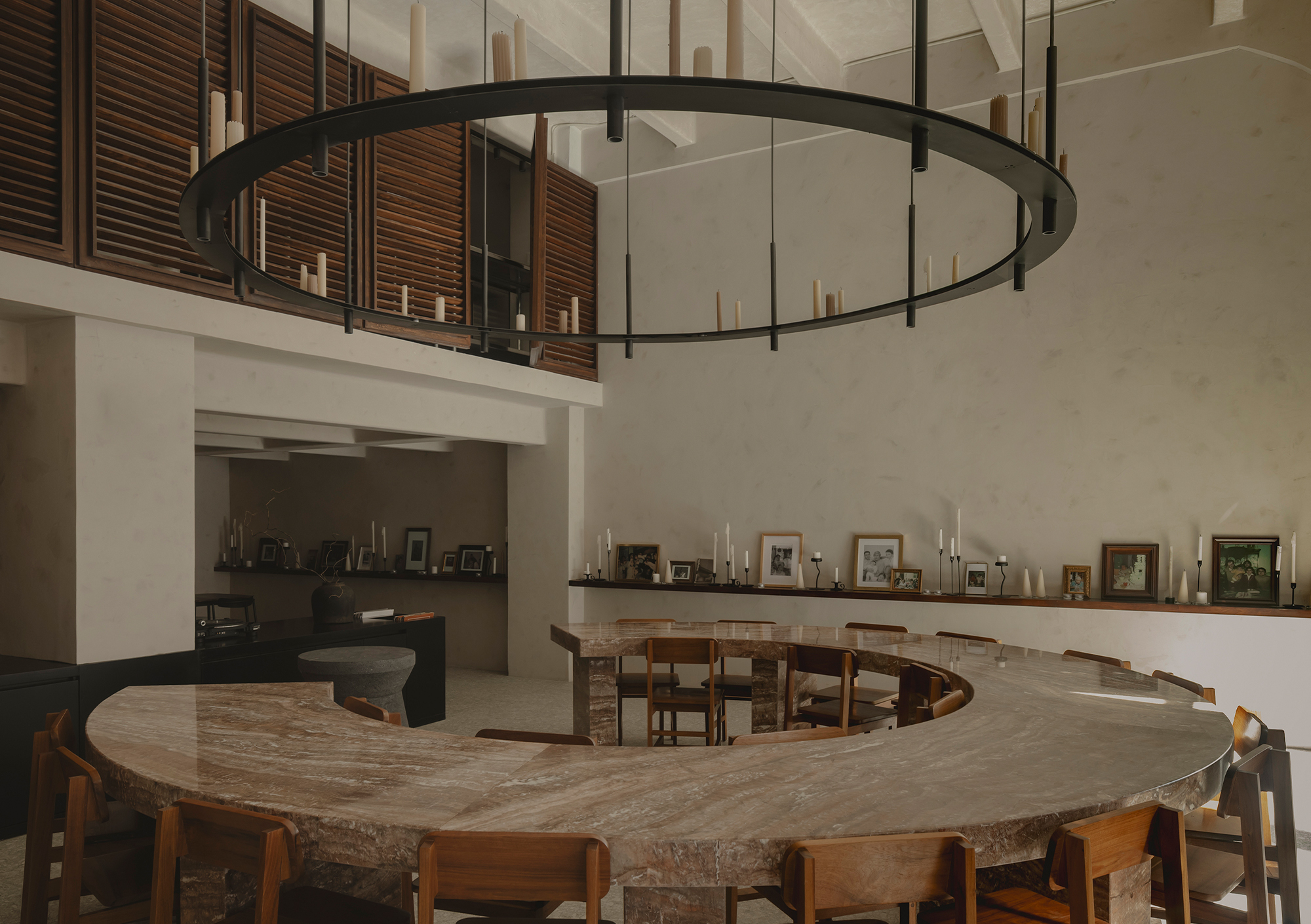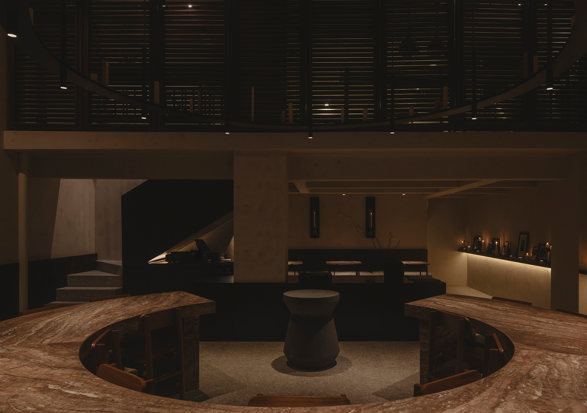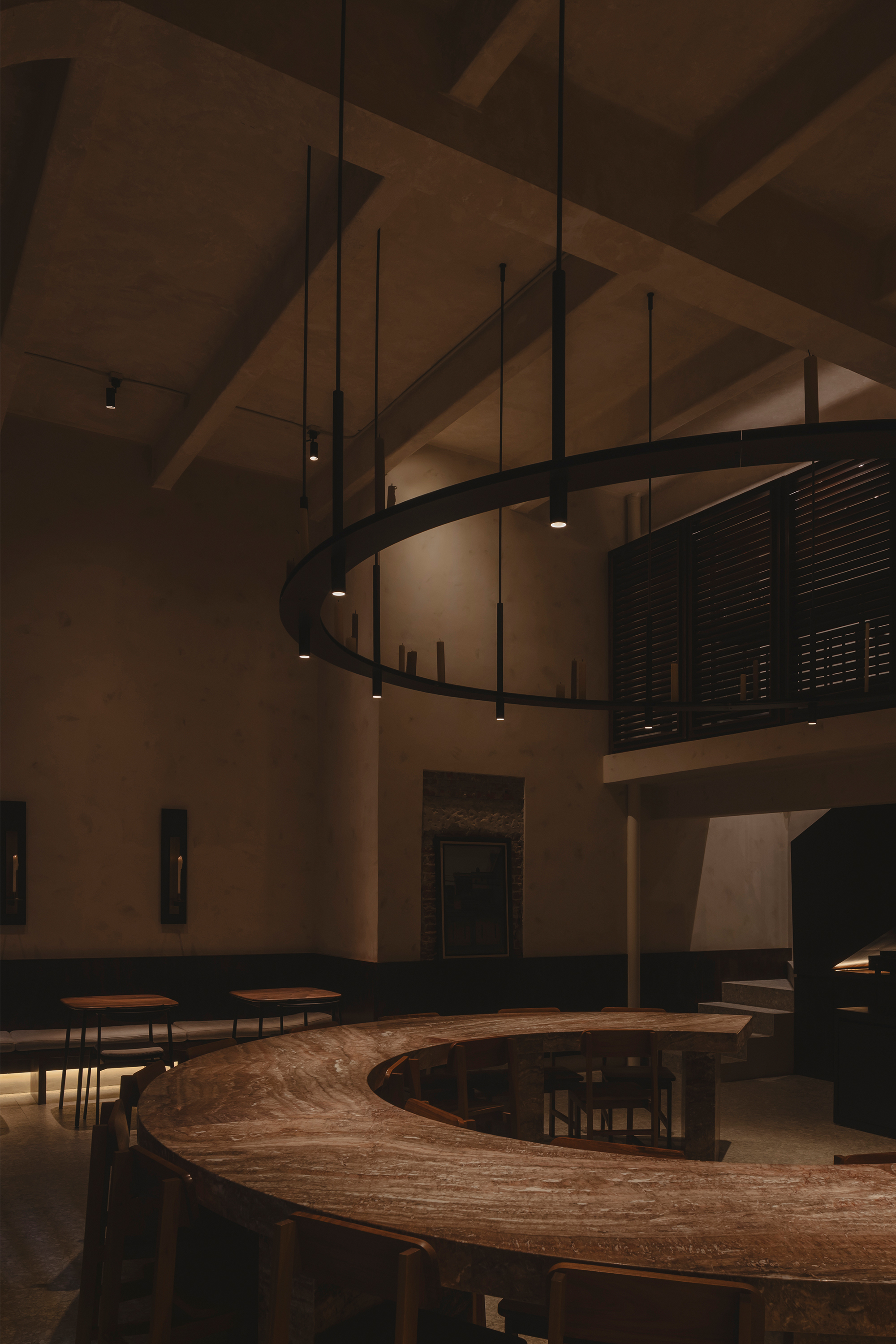 The central table is both sculptural and symbolic, it organizes the space. Around it a stone totem and a metal light structure reinforce the verticality, the ritual character of the project. Brass detailed walls and stone accent lighting follow the path and the whole. Furniture and tableware extend this idea. Designed and selected with the same criteria they expand the concept of containment and hospitality to every detail. Wood supports, stone grounds, light softens.