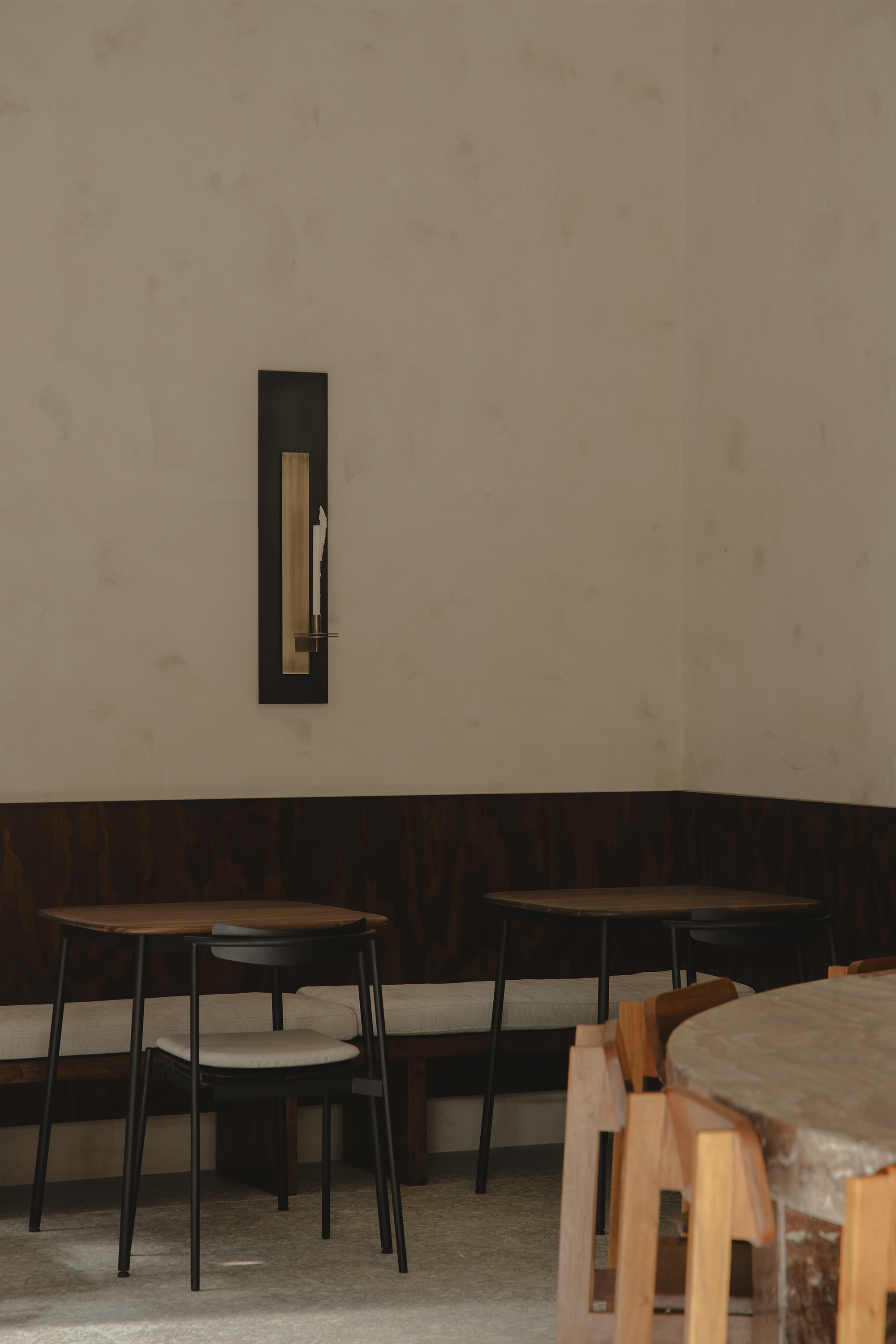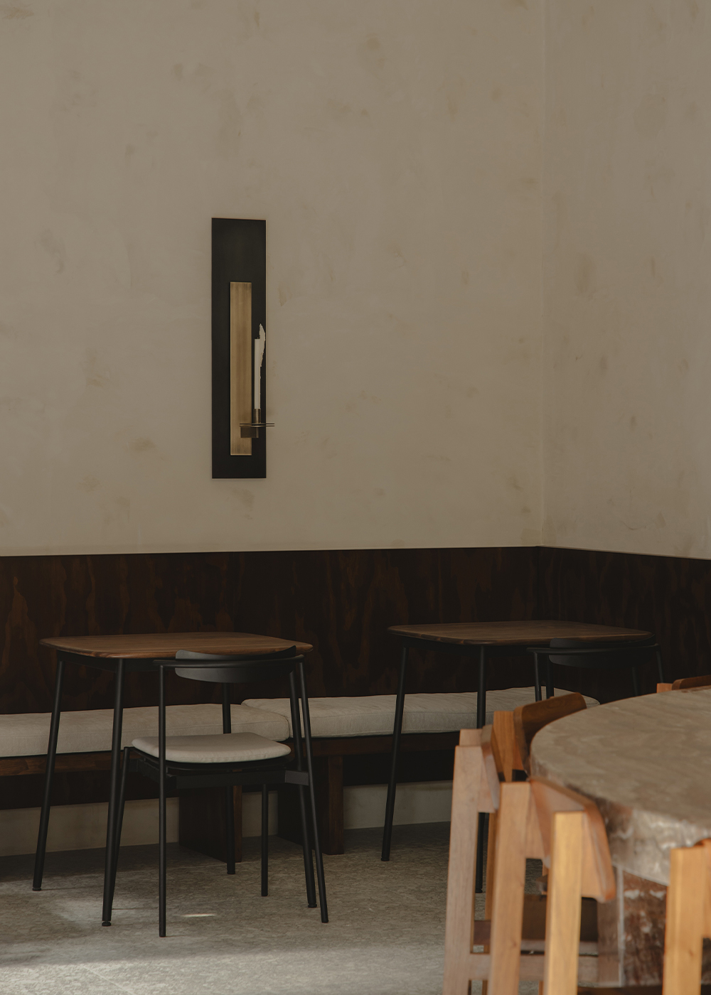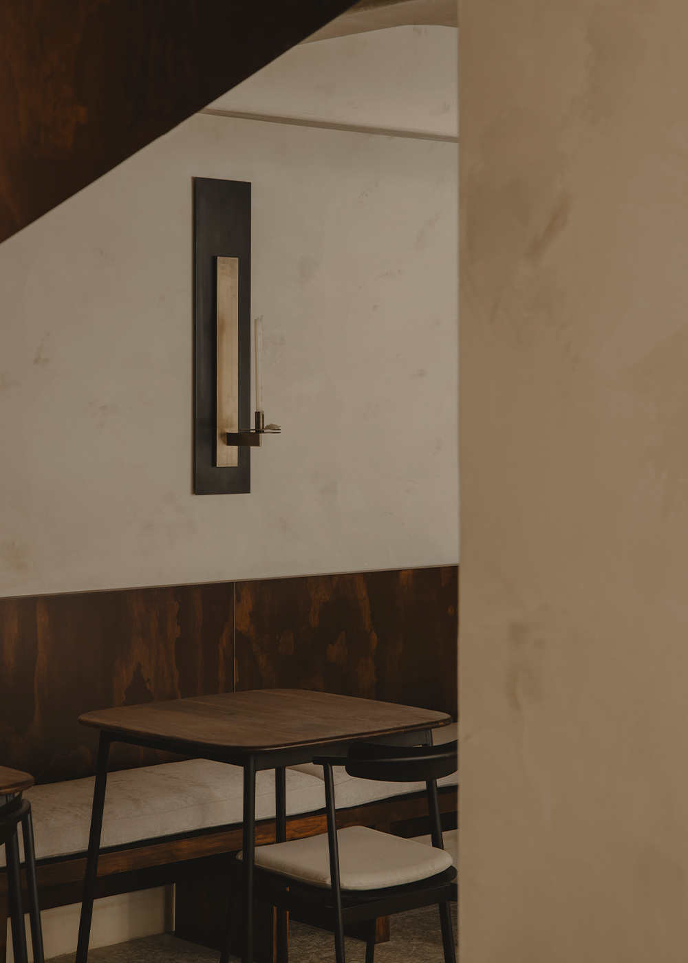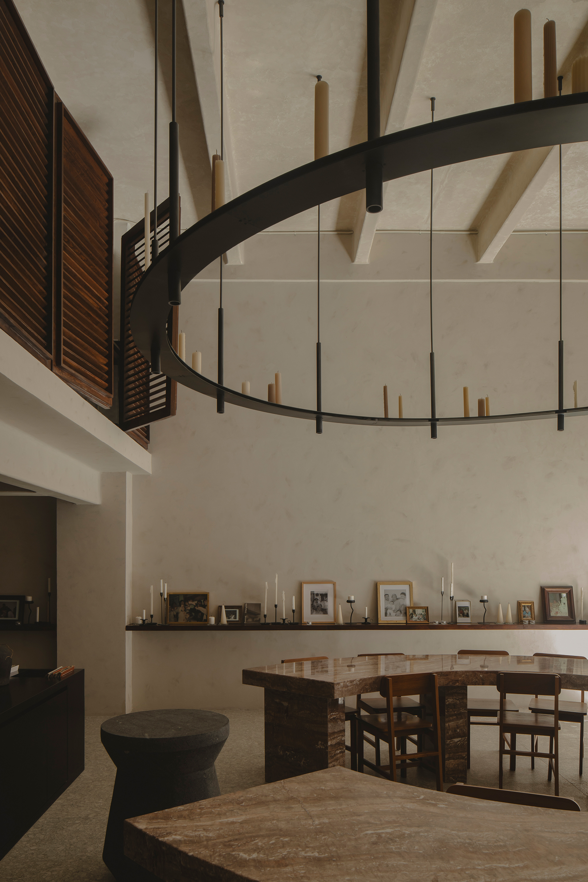 The central table is both sculptural and symbolic, it organizes the space. Around it a stone totem and a metal light structure reinforce the verticality, the ritual character of the project. Brass detailed walls and stone accent lighting follow the path and the whole. Furniture and tableware extend this idea. Designed and selected with the same criteria they expand the concept of containment and hospitality to every detail. Wood supports, stone grounds, light softens.