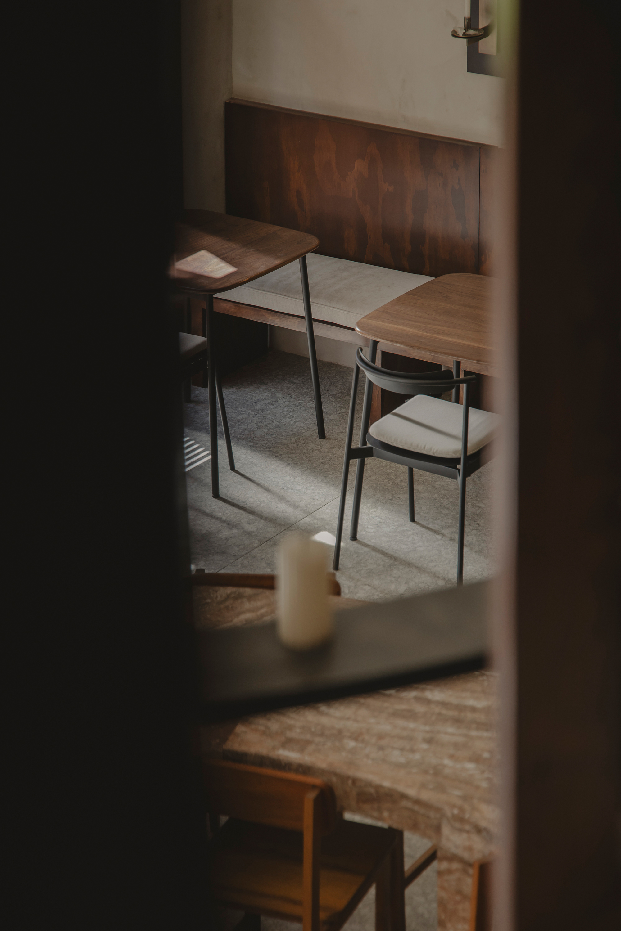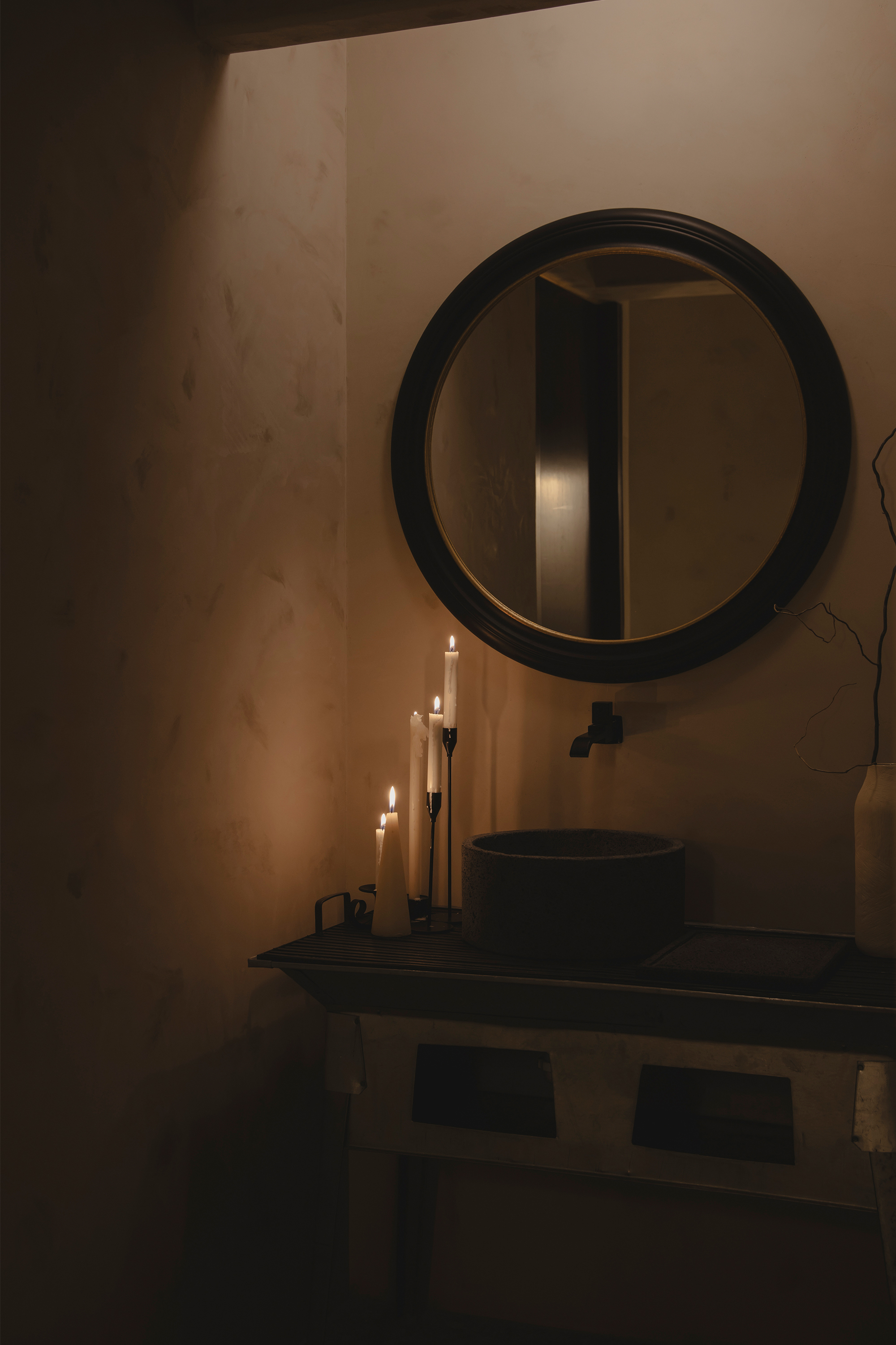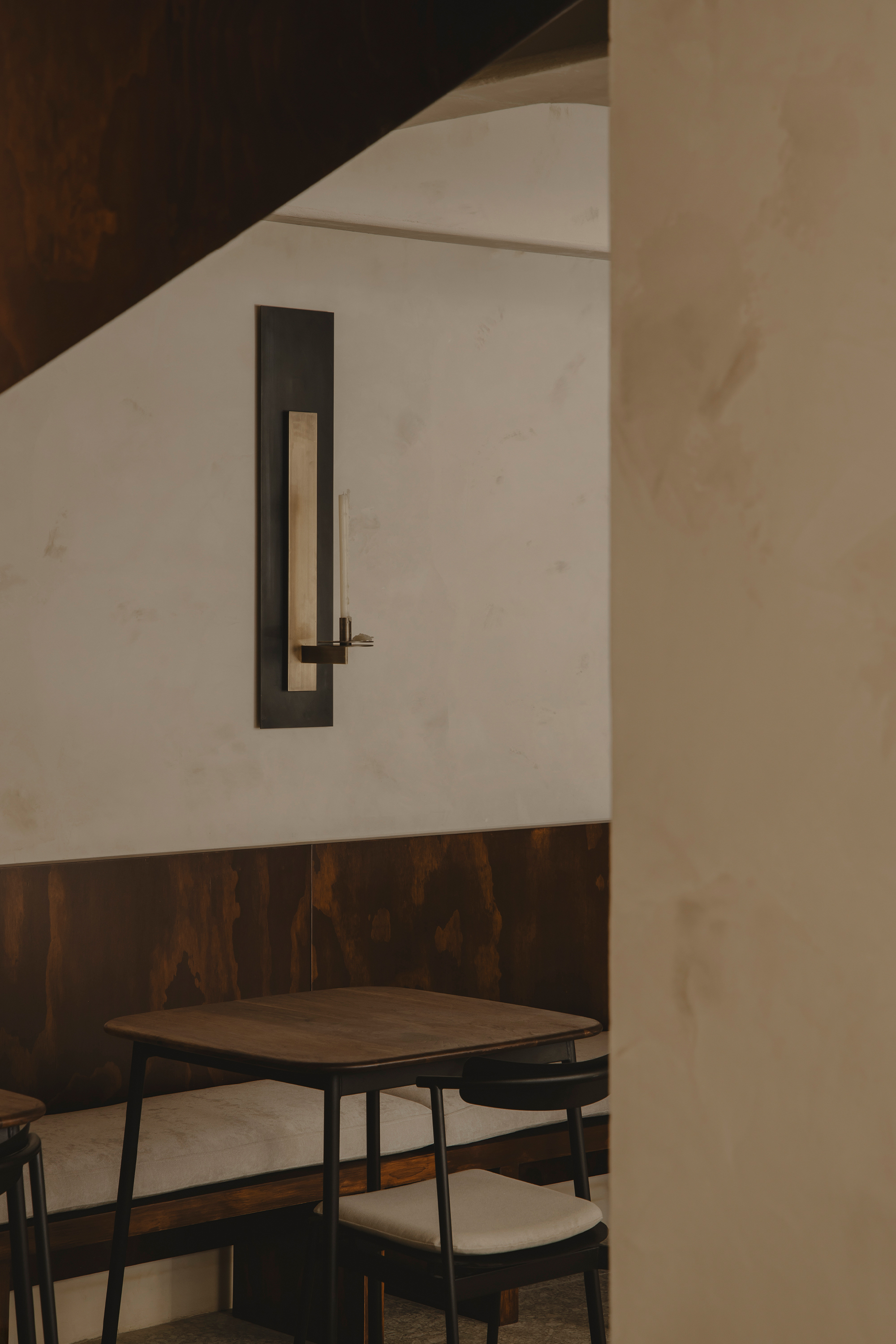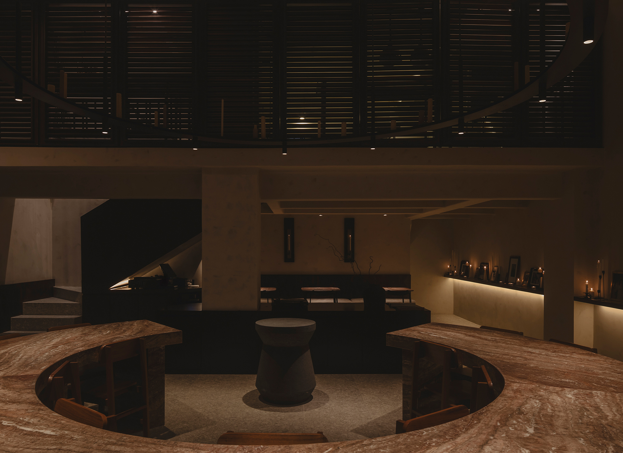 The central table is both sculptural and symbolic, it organizes the space. Around it a stone totem and a metal light structure reinforce the verticality, the ritual character of the project. Brass detailed walls and stone accent lighting follow the path and the whole. Furniture and tableware extend this idea. Designed and selected with the same criteria they expand the concept of containment and hospitality to every detail. Wood supports, stone grounds, light softens.