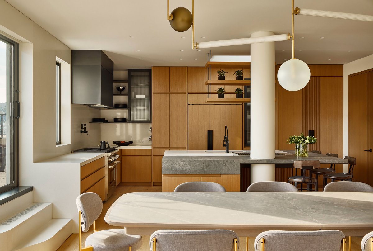 The apartment is encircled by a dramatic spiral staircase. "You feel very curious as you walk through it," says Kotchen. Every turn is a wonder moment. It is hard to believe that this apartment even exists. The second floor's kitchen is a painting made of light wood and concrete. Other bright spots in the home include a turquoise chair and cabinet in the second-floor area, and a teal sofa in the living room's central part.