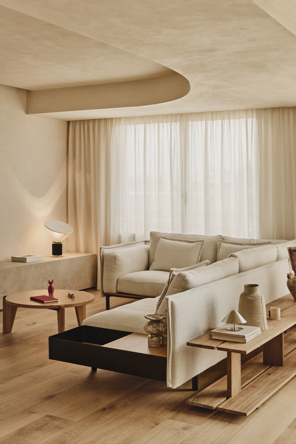 One of the most poetic gestures lies in the seamless transition between interior and exterior. A continuous bench connects both areas, blurring boundaries and embracing the privileged views of the city. On the terrace, Vitra furniture and Marset lighting extend the interior’s quiet sophistication outdoors. Handmade ceramic vases by Canoa Lab are scattered throughout the home, anchoring the design in Mediterranean artisanal culture. Natural linen curtains filter light with a soft, fluid texture, offering privacy without compromising brightness. Technical lighting by Arkos Light is integrated with precision, enhancing volumes and surfaces without disturbing the project’s visual harmony.