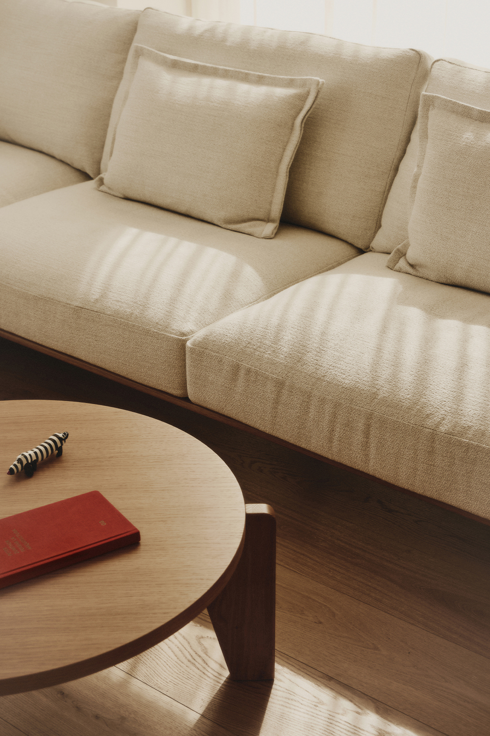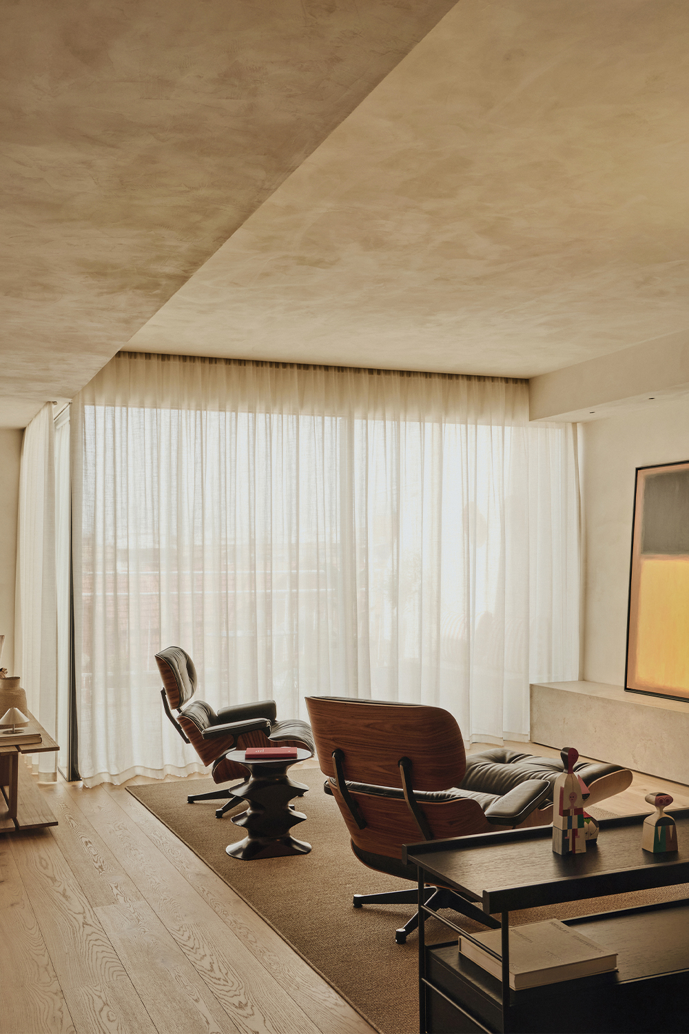 From the moment you step inside, the apartment unfolds as a manifesto of calm and coherence. Lime plaster covers walls and ceilings, bringing a subtle, natural texture that reinforces the feeling of refined shelter. Underfoot, continuous French oak flooring warms the space, while natural light — the project’s silent protagonist — gently washes over each surface. x.arquitectos s presents a neutral aesthetic language here, where noble materials are not mere ornamentation, but the very foundation of the spatial experience. The furnishings, carefully curated, balance iconic pieces of international design with artisanal objects rooted in local tradition. In the living room, a generously proportioned Joquer sofa is paired with a Jean Prouvé coffee table, while two Eames Lounge Chairs offer elegance and a clear invitation to rest. A soft-toned rug frames the area, visually anchoring the space without interrupting its flow.