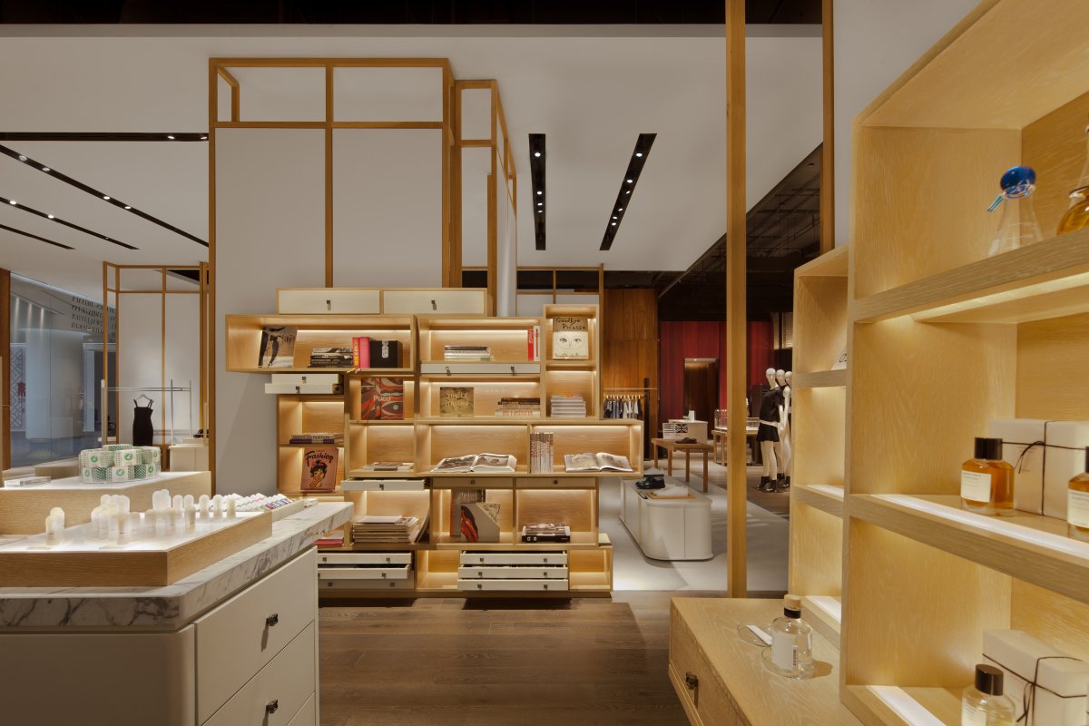 Playfully articulated, the menswear area is a balance between hard and soft, implied complexity and simplicity. Walls wrapped in canvas are complimented by overlapping graphic rugs in raw textures and natural materials like jute and straw. The relatively neutral environment is punctuated with pockets of richness as with Thai walnut-paneled walls which lead to the men’s fitting rooms.