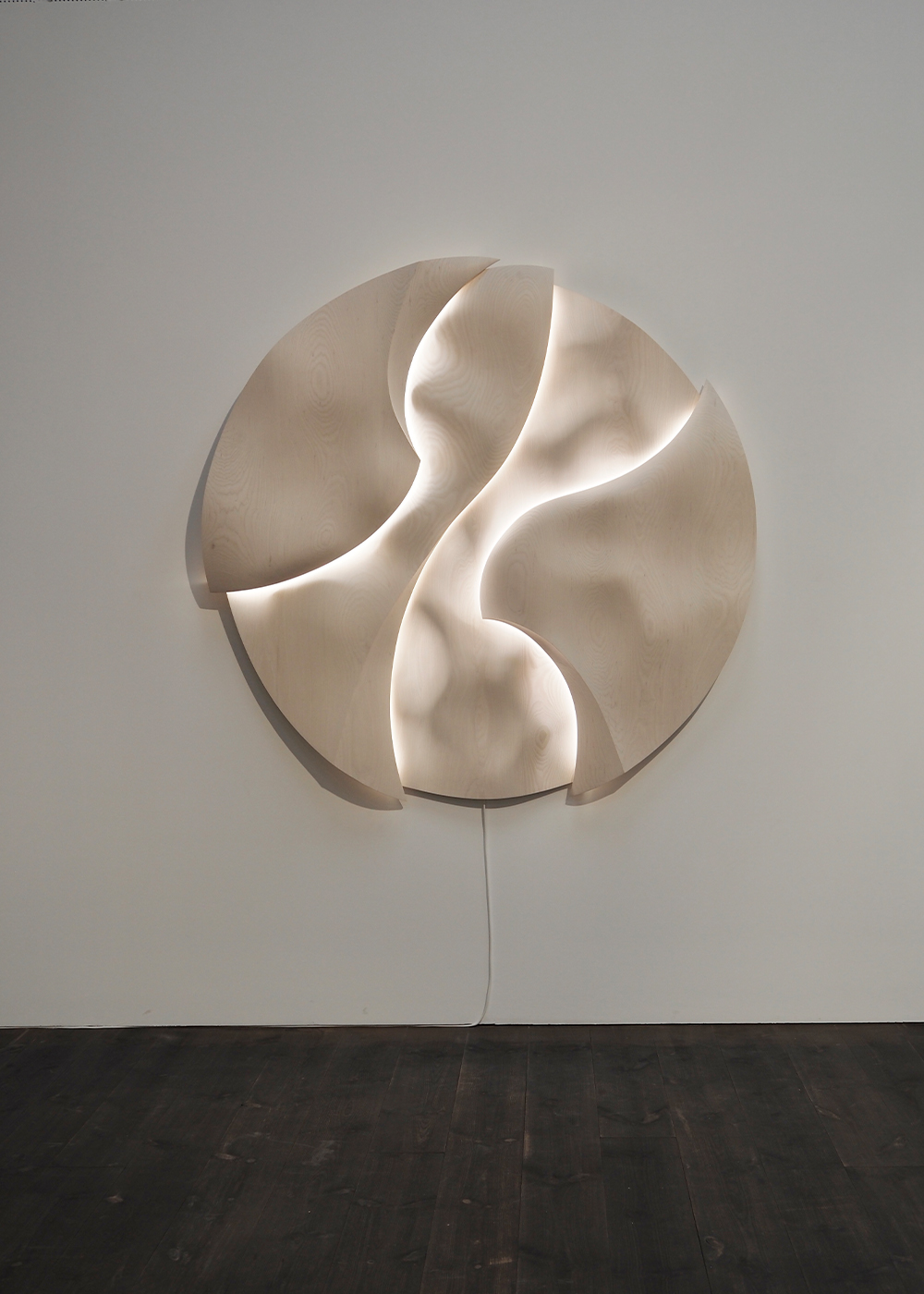 Following Mette's guidance, we first paused before "Måne" on the wall. This sculpture, resembling the moon, uses its warm wood grain and traces of handcraft to outline the unique contours and breath of each lunar phase. Soft light emanates subtly from within, flowing through the wooden texture like a lunar halo, a dialogue between the tangible and intangible, serene and profound.
