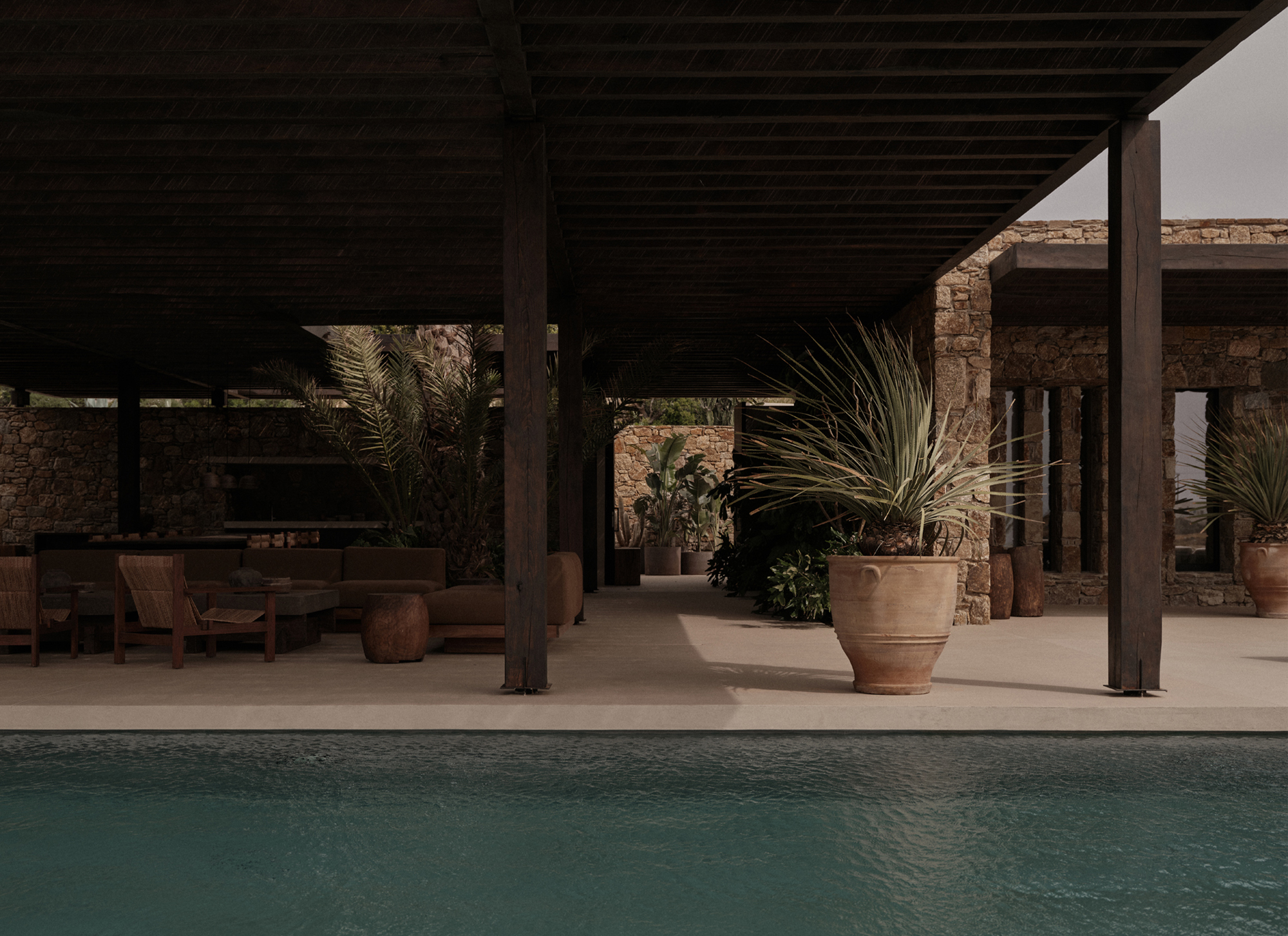 Michael guided us into the story of En Kyanó. The entrance reveals itself subtly—rough stone walls blending into the hillside, without clamor or declaration. As we moved into the courtyard, the vision opened generously—here lies the heart of the space, a corridor woven from lightweight modernist lattices and traditional Greek cane roofing, linking two wings. Horizontality stretches parallel to the coast, drawing the gaze toward the distant shoreline. Sunlight filters through the canopy, falling gently upon the ground and furnishings, dappled and shifting like shimmer on the sea.