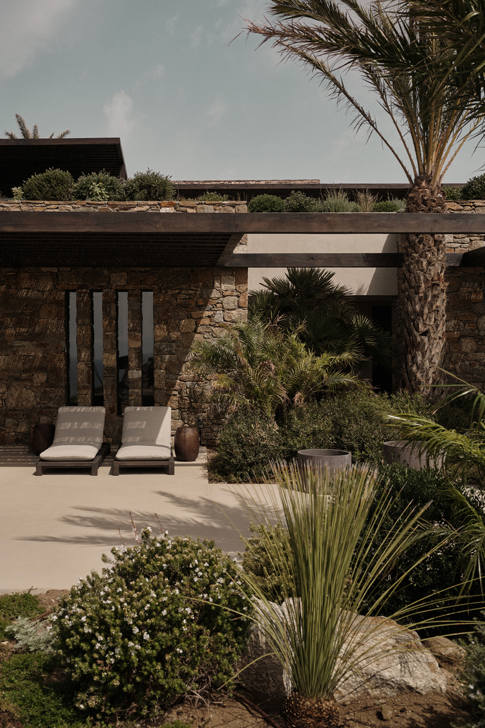 En Kyanó—its name comes from a singular shade of blue in the Greek language. It rests quietly along the sun-drenched slopes of Mykonos’ southwest coast, revealing itself unhurriedly—through rough stone, softened plaster, and the slow, liquid drift of light.