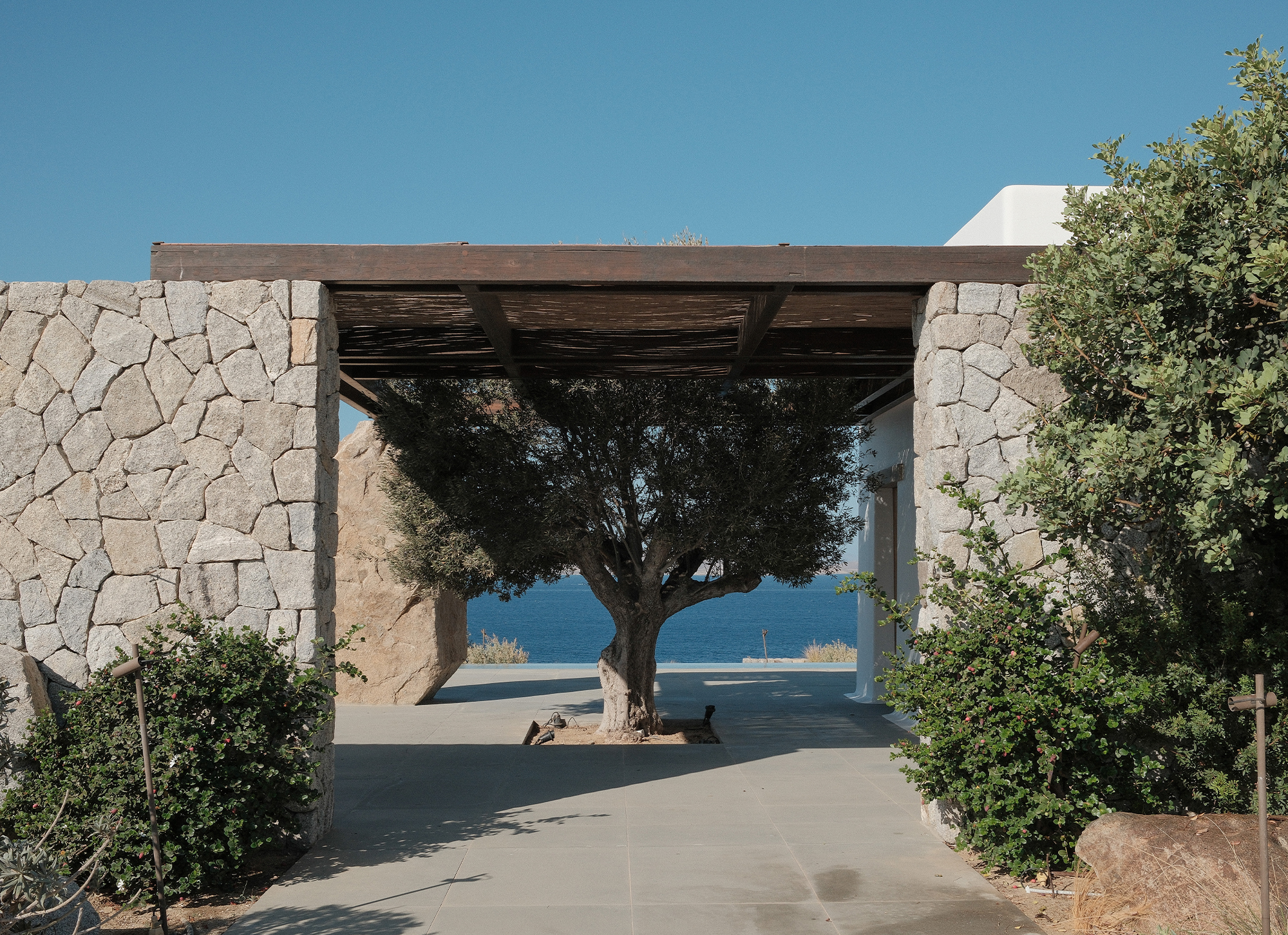 Two pure white volumes lie on the ridge like calm sculptures, and their simple geometric lines form a delicate tension with the jagged rocks. This architectural language is not a simple replication of minimalism, but a poetic translation of the traditional Greek "cave house". When the shadow of the chestnut pergola casts precise diamond-shaped light spots at noon, and when the branches and leaves of the olive tree sway on the lime wall to create a Byzantinian-style gold foil effect, we suddenly understand what it means to "capture light with stones".