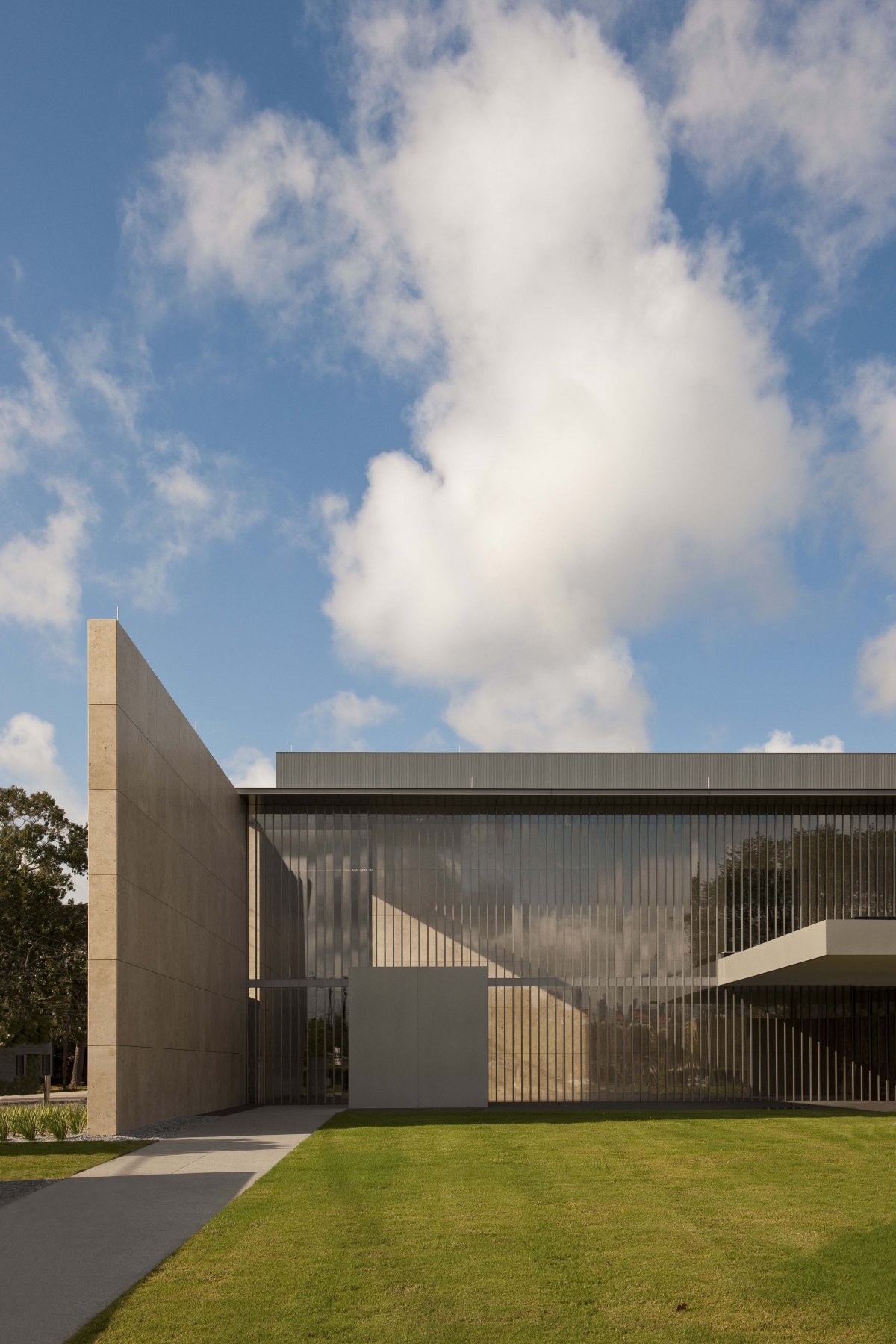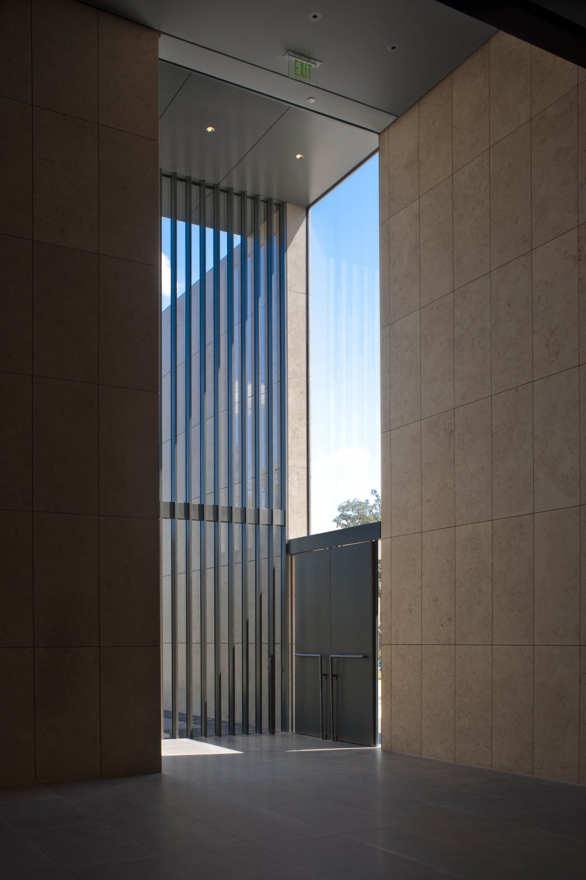Visitors to the center will be welcomed by a landscape that adheres to a thoughtfully executed minimalist ethic. The Front Yard includes a simple plane of ground cover and heritage oaks that frame views to the main entry and serves as a venue for special events. At the rear of the building, a grove of bald cypress forms a vertical hedge that holds the views to the second level Stone Garden.
