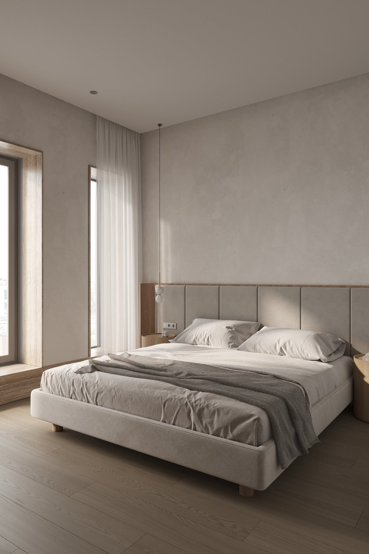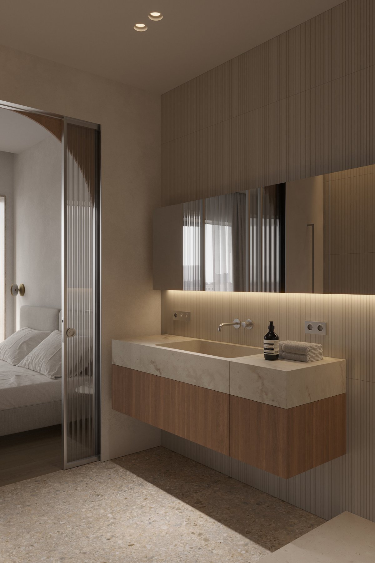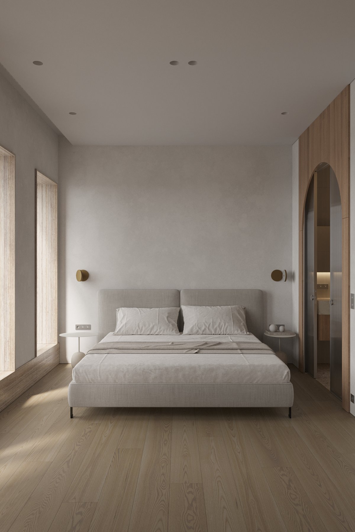 A darker passageway leads into a bedroom filled with natural light, which uses materials that are consistent with the overall space, helping to enhance consistency. The windows are framed by textured tiles that enrich the levels and act as a detail within the bedroom, accenting the space.