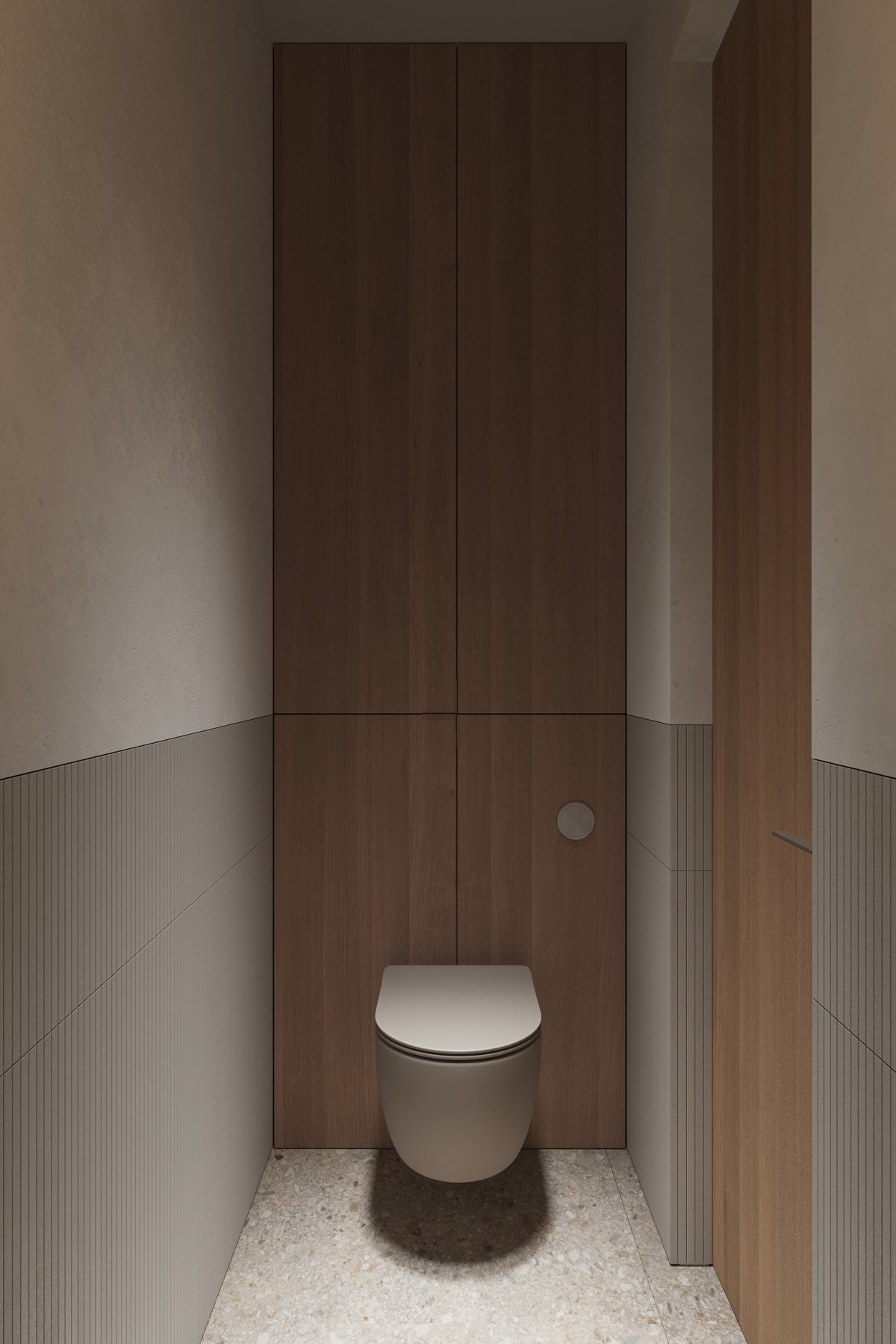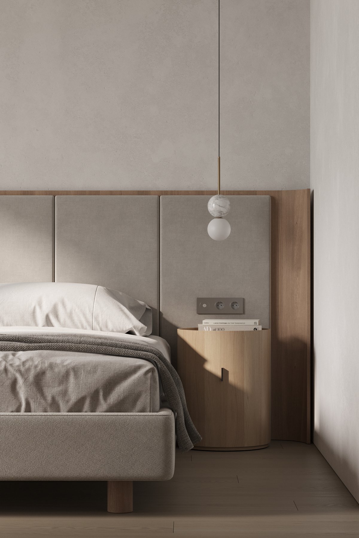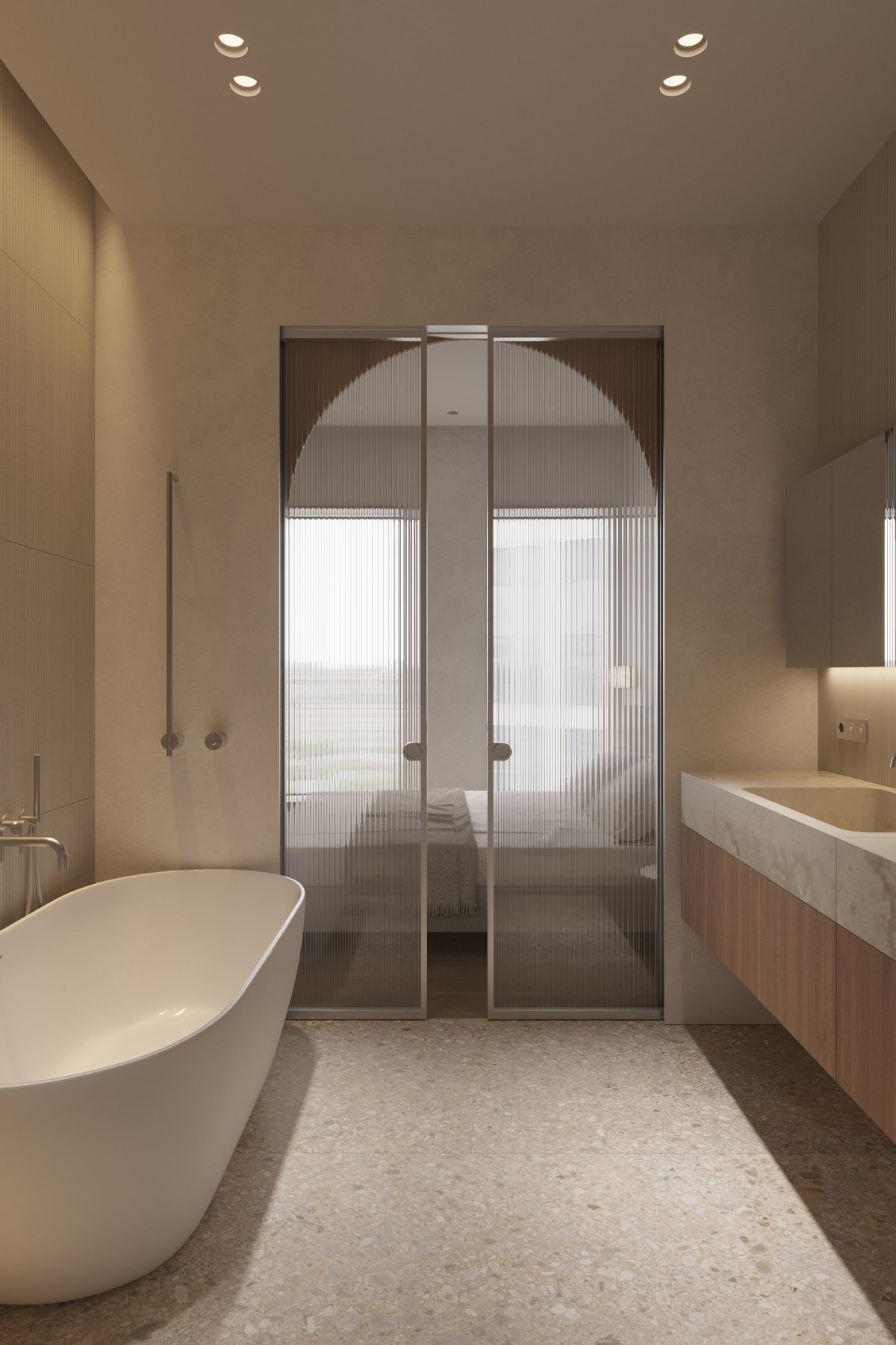 A darker passageway leads into a bedroom filled with natural light, which uses materials that are consistent with the overall space, helping to enhance consistency. The windows are framed by textured tiles that enrich the levels and act as a detail within the bedroom, accenting the space.