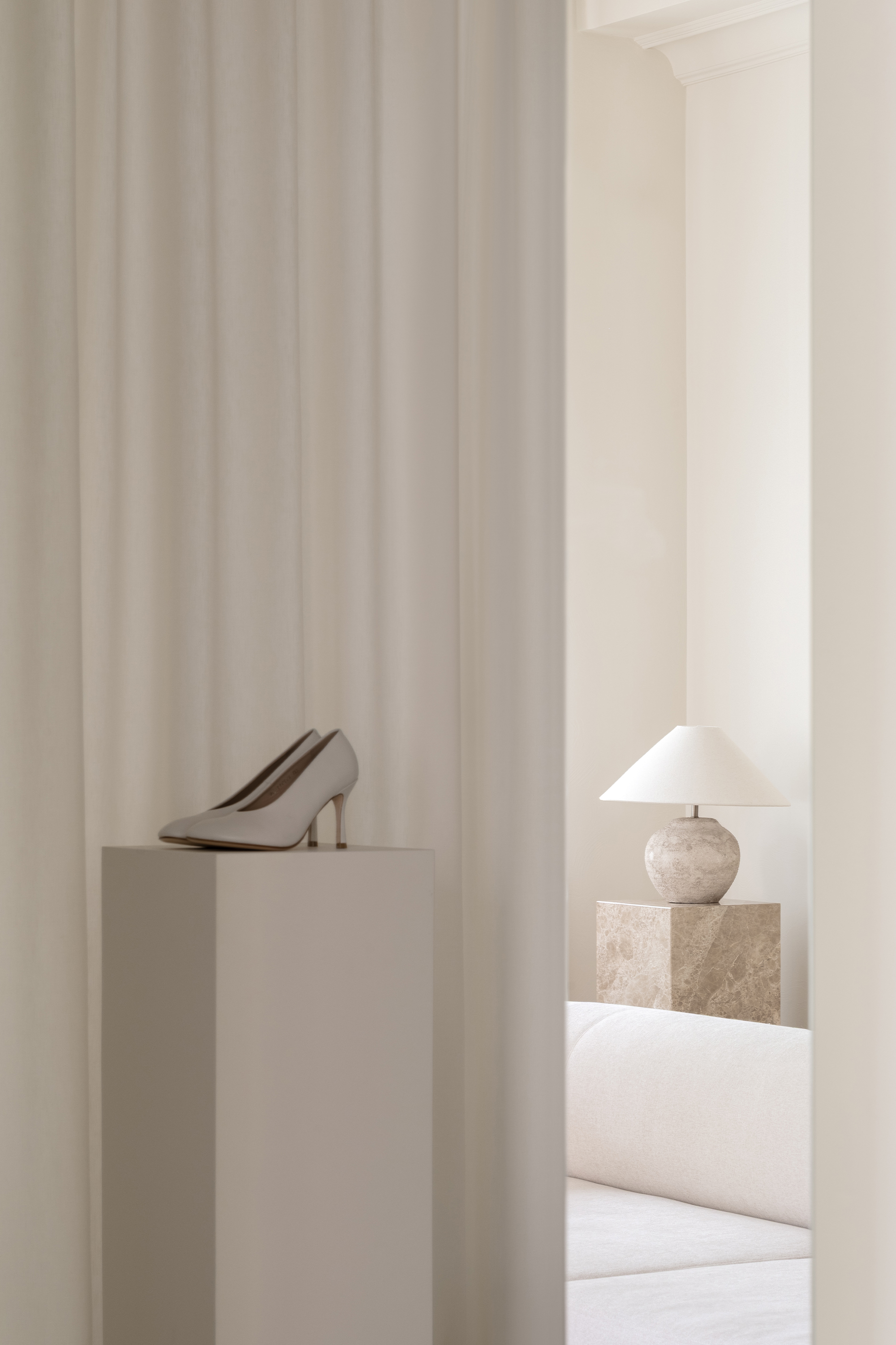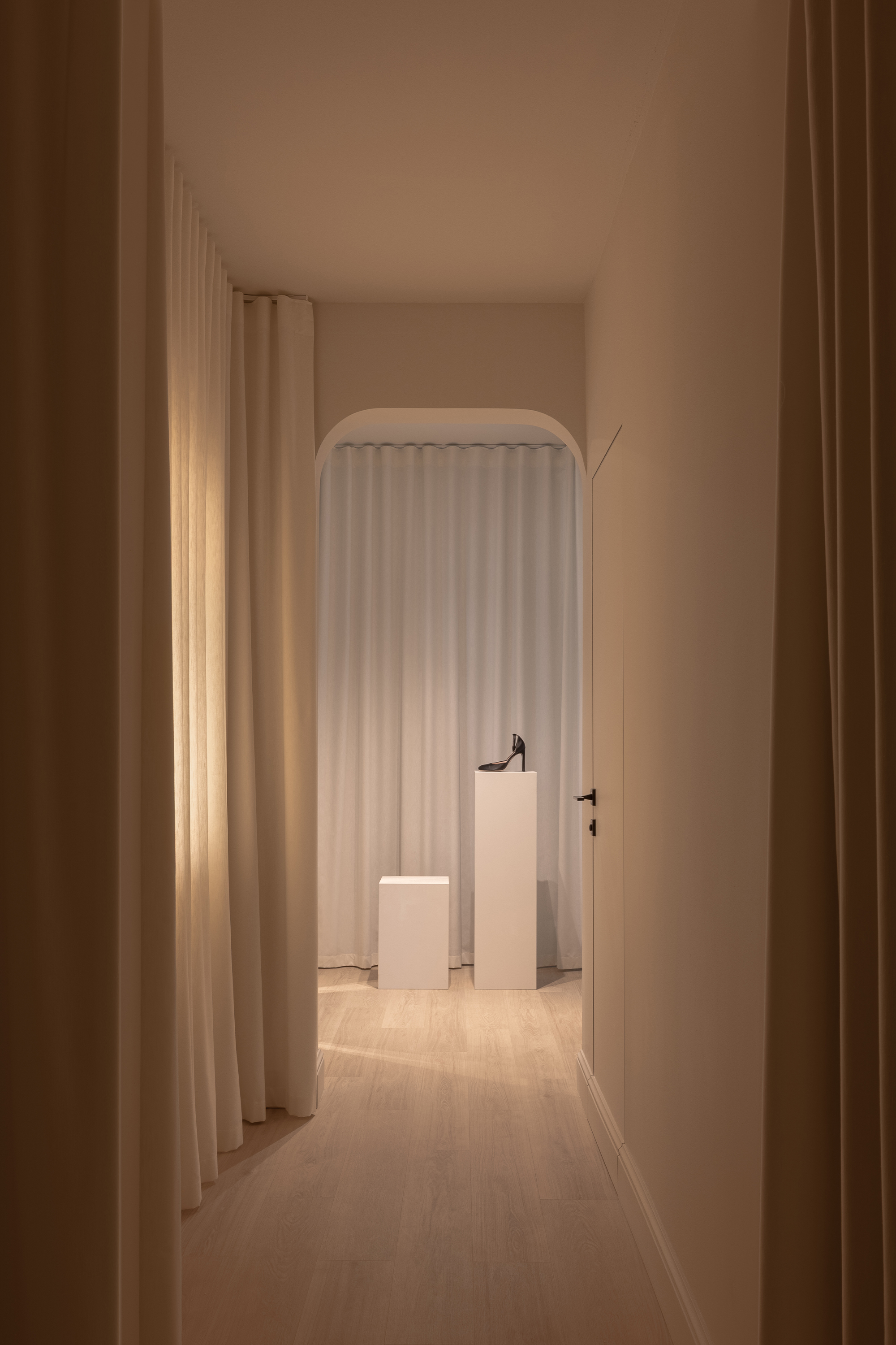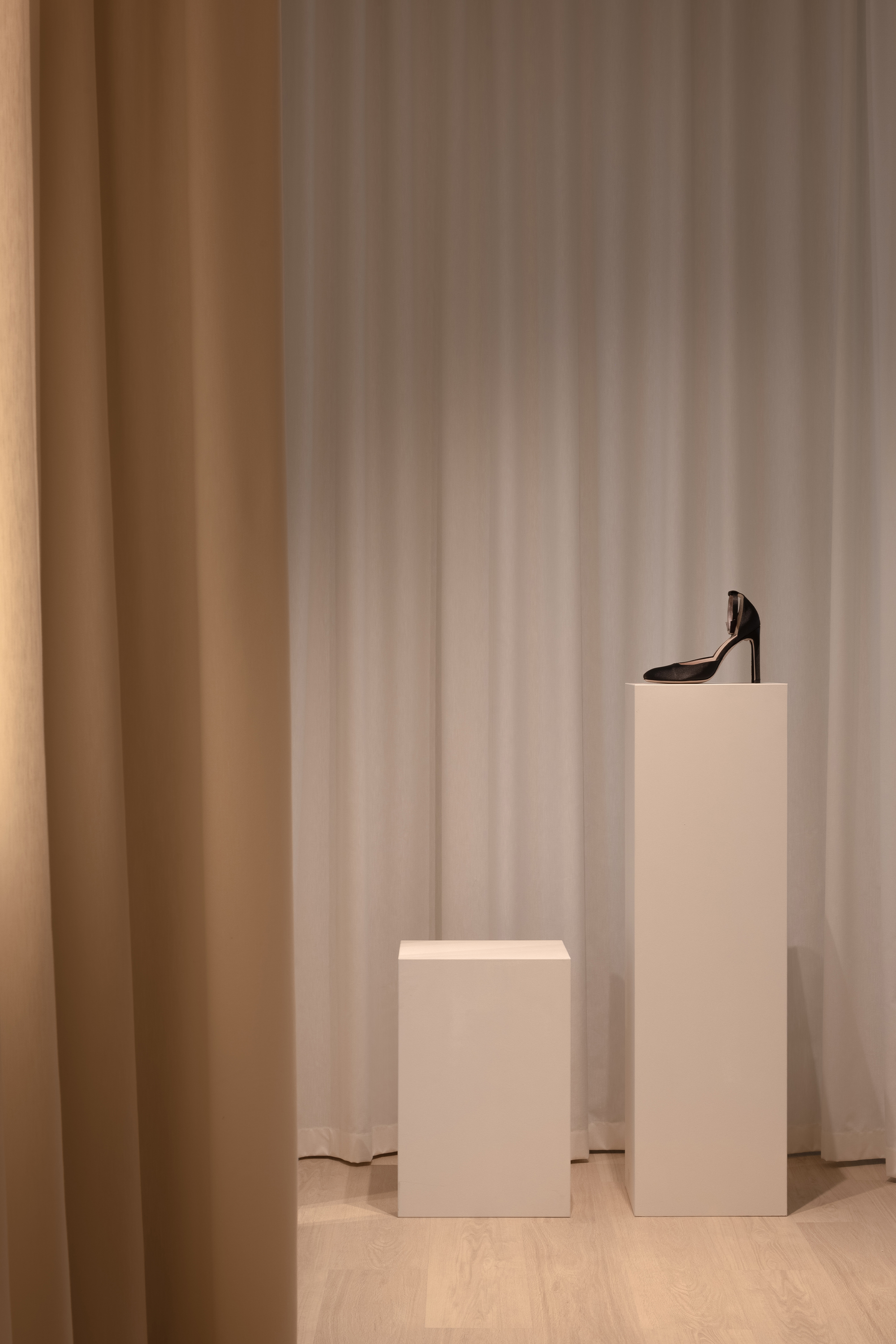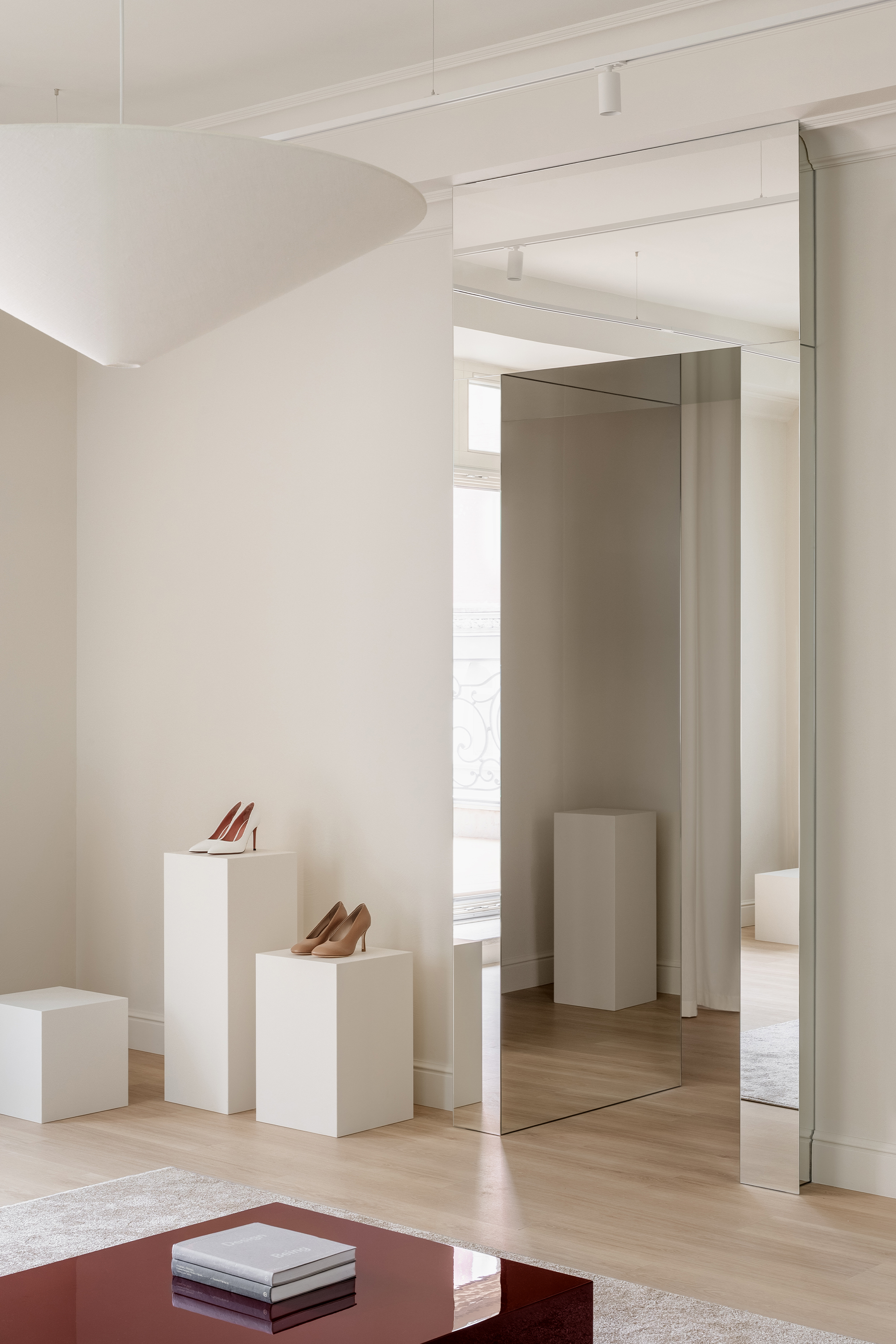 The guiding concept of the boutique is not to showcase shoes as commercial products, but to present them as refined art objects within a cultivated domestic setting. Rather than referencing antiques or traditional symbols of status, horizontal surfaces are dedicated entirely to the brand’s creations, allowing footwear to take center stage as the true markers of taste and sophistication.