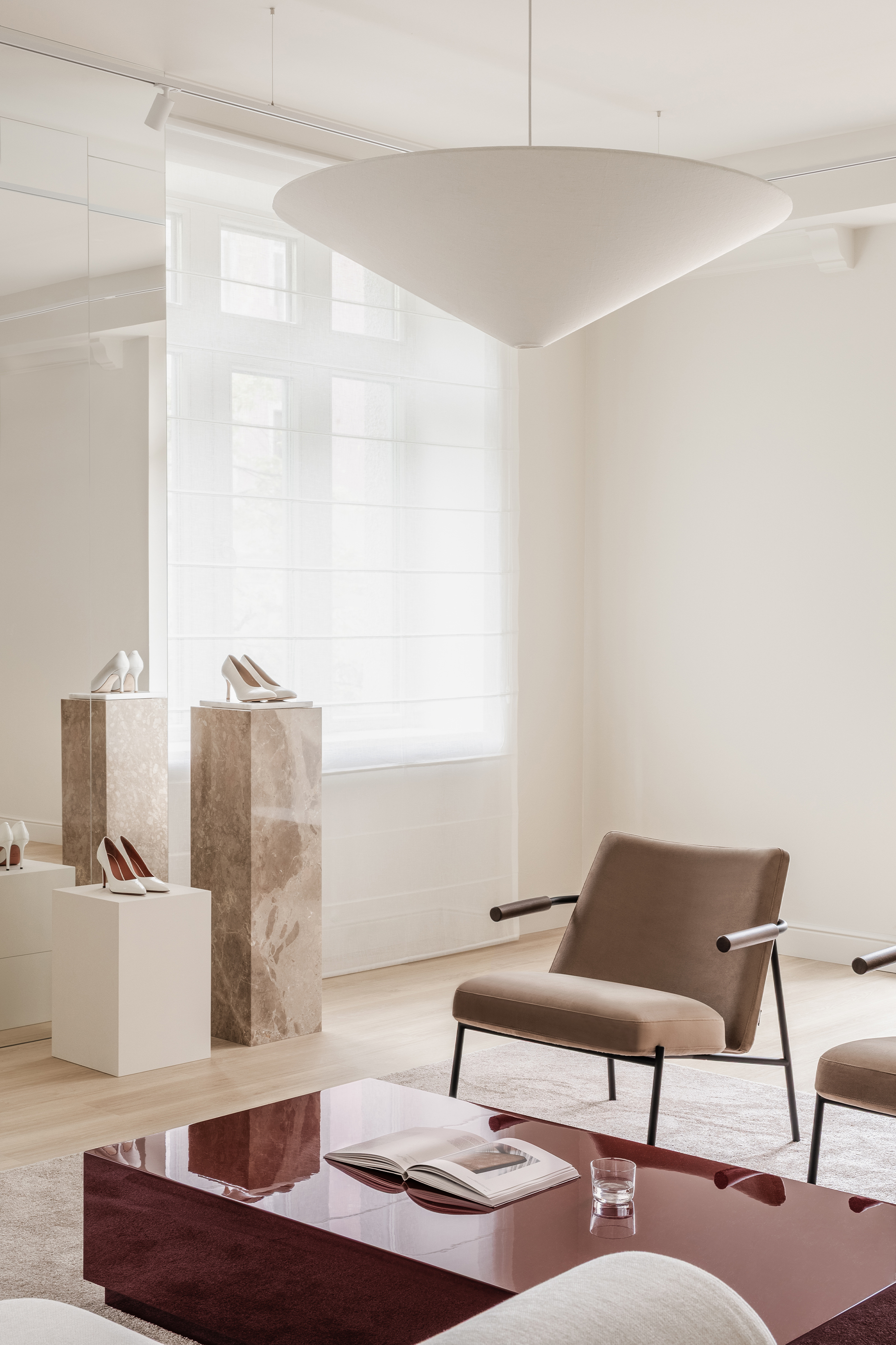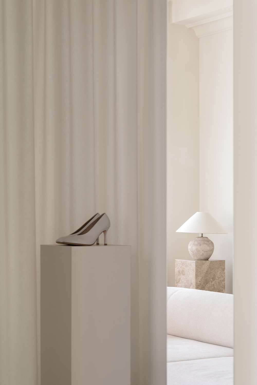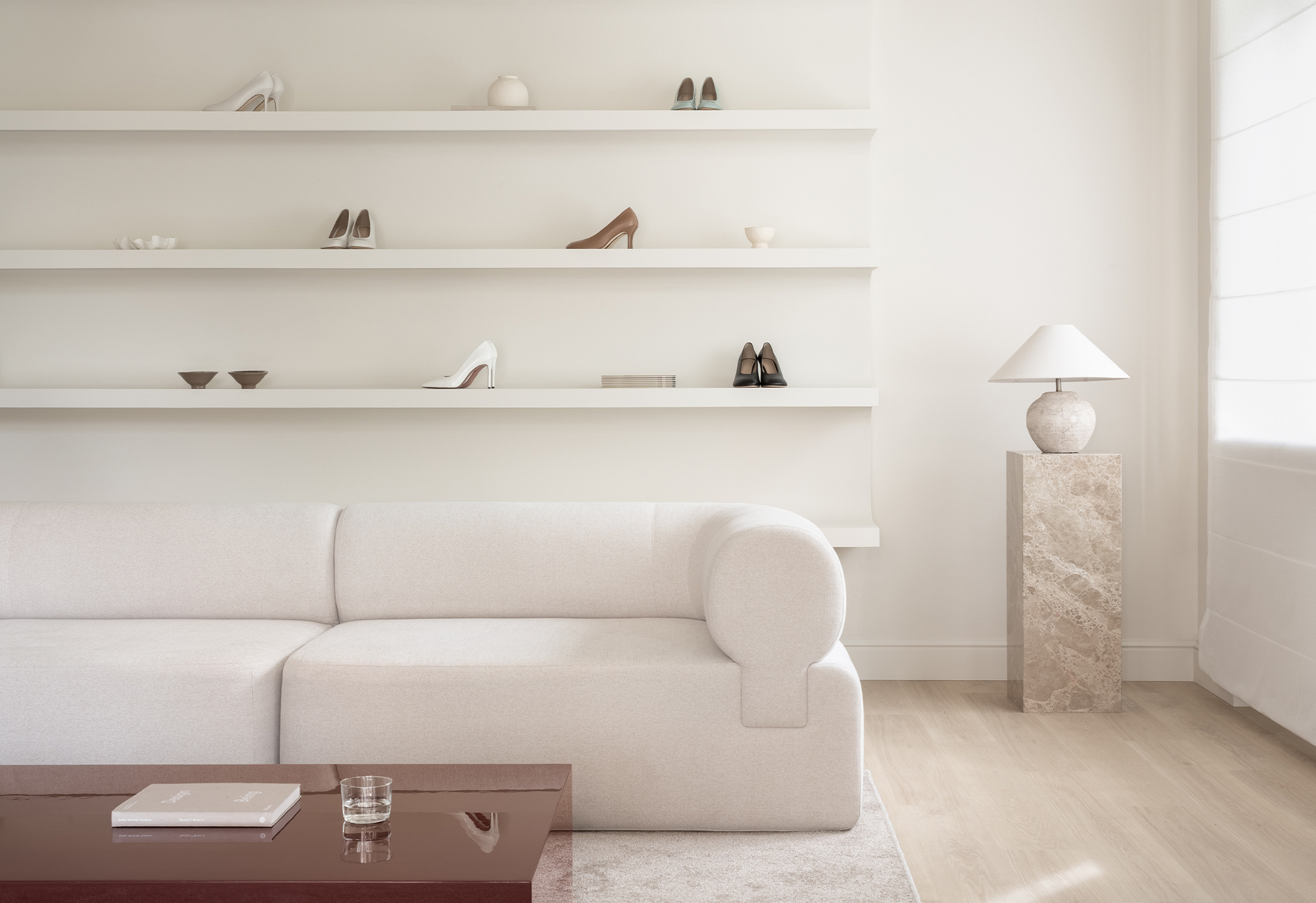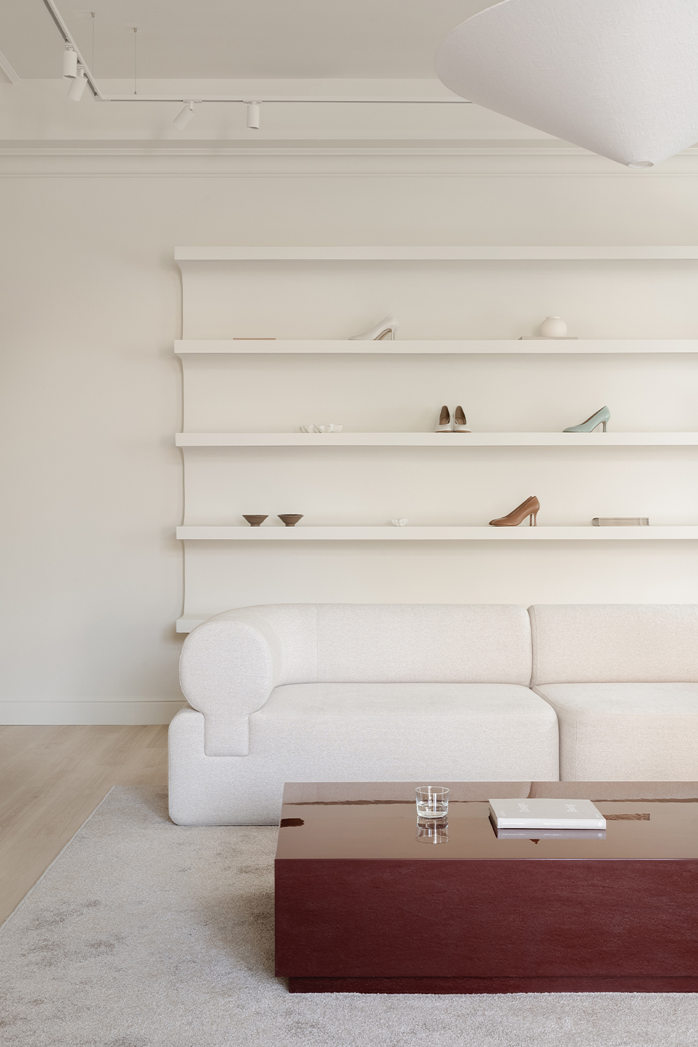 The guiding concept of the boutique is not to showcase shoes as commercial products, but to present them as refined art objects within a cultivated domestic setting. Rather than referencing antiques or traditional symbols of status, horizontal surfaces are dedicated entirely to the brand’s creations, allowing footwear to take center stage as the true markers of taste and sophistication.