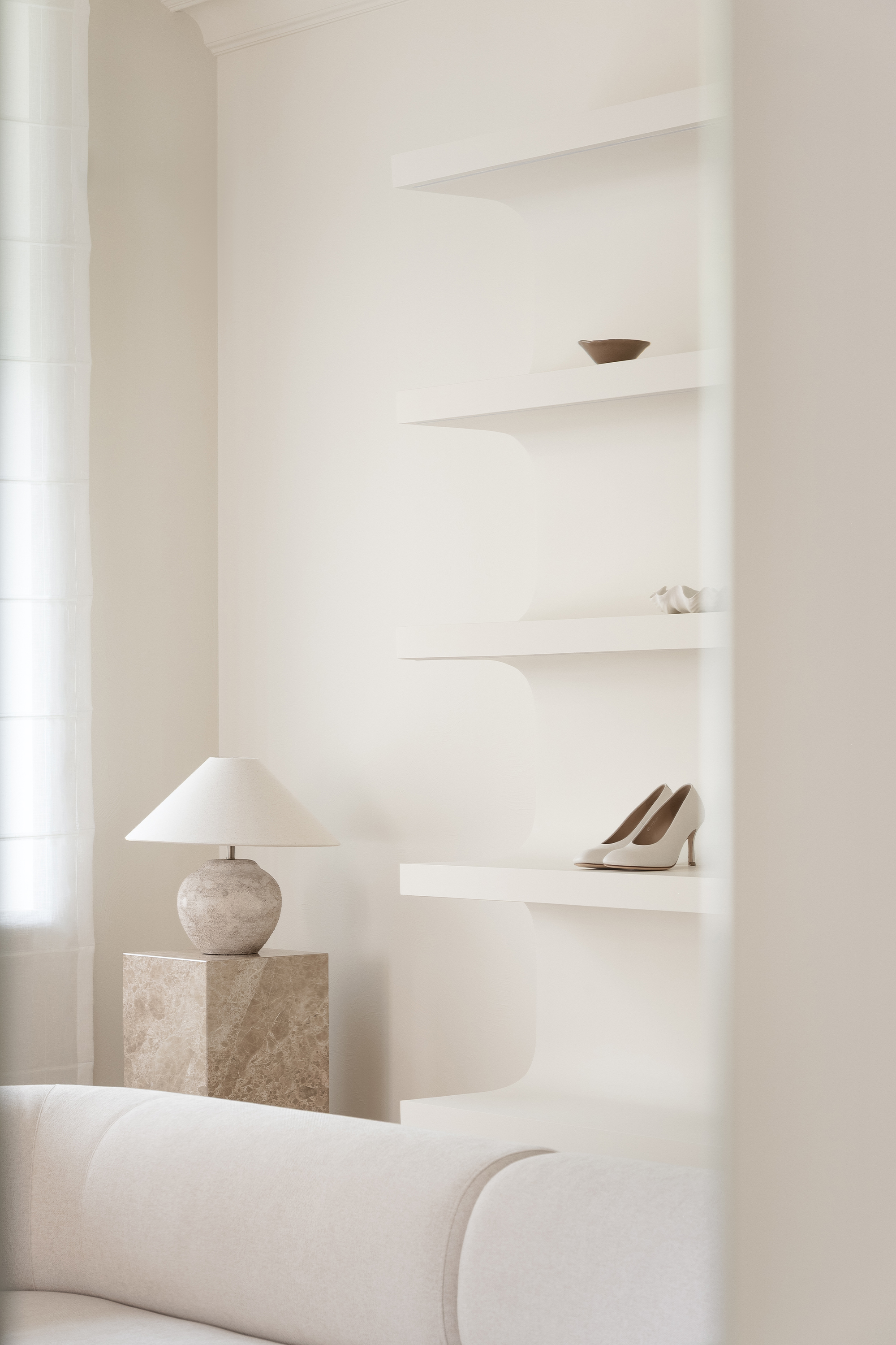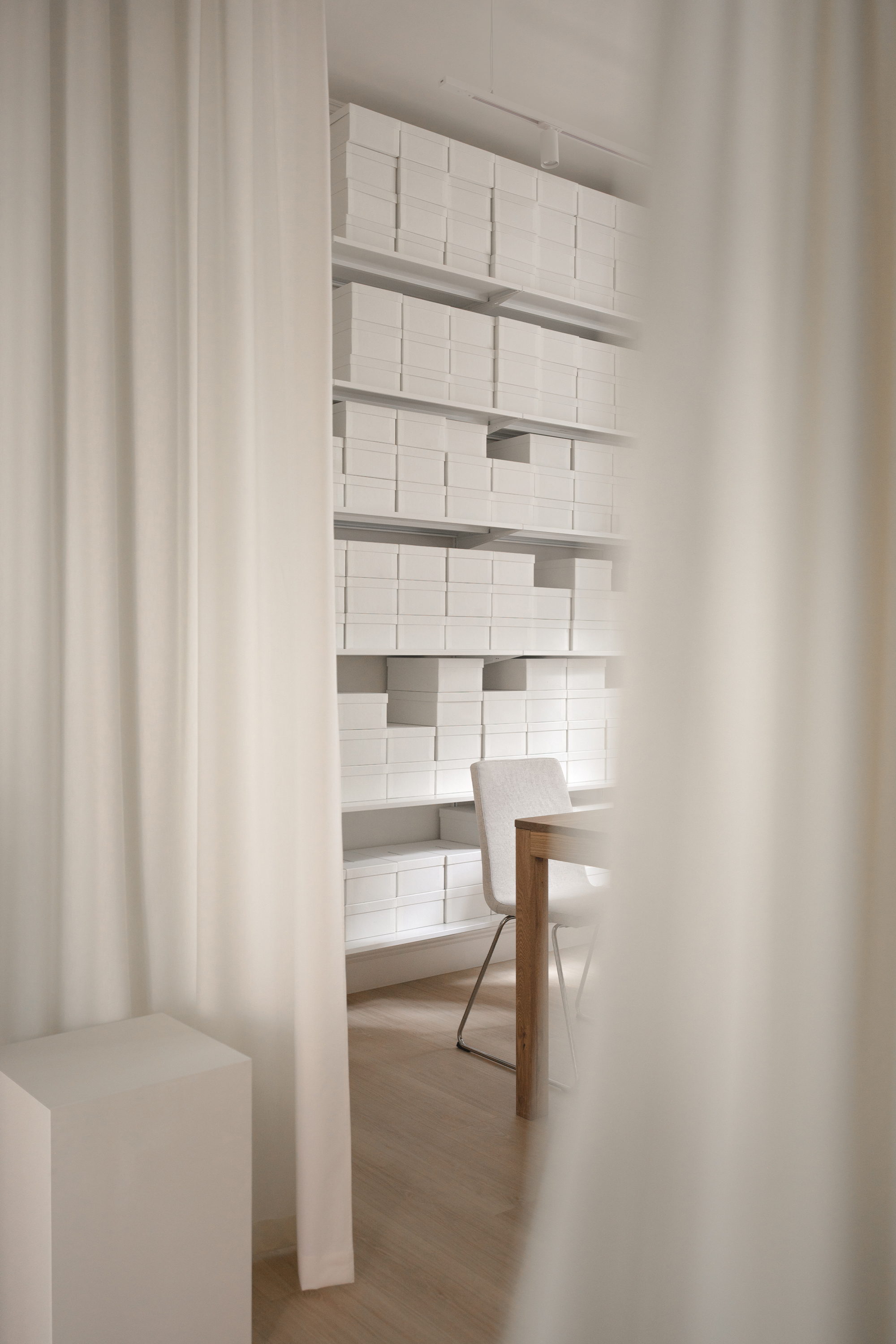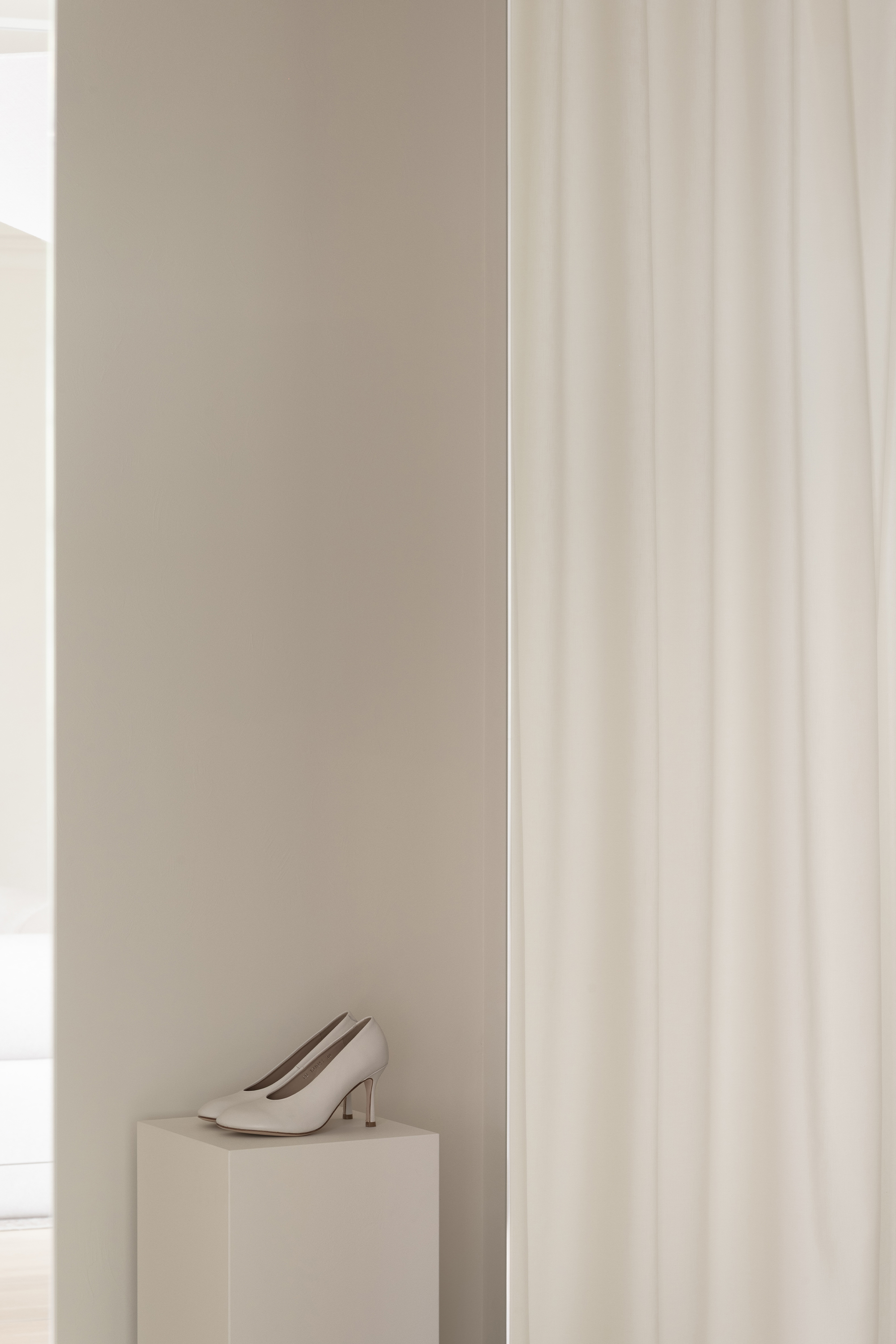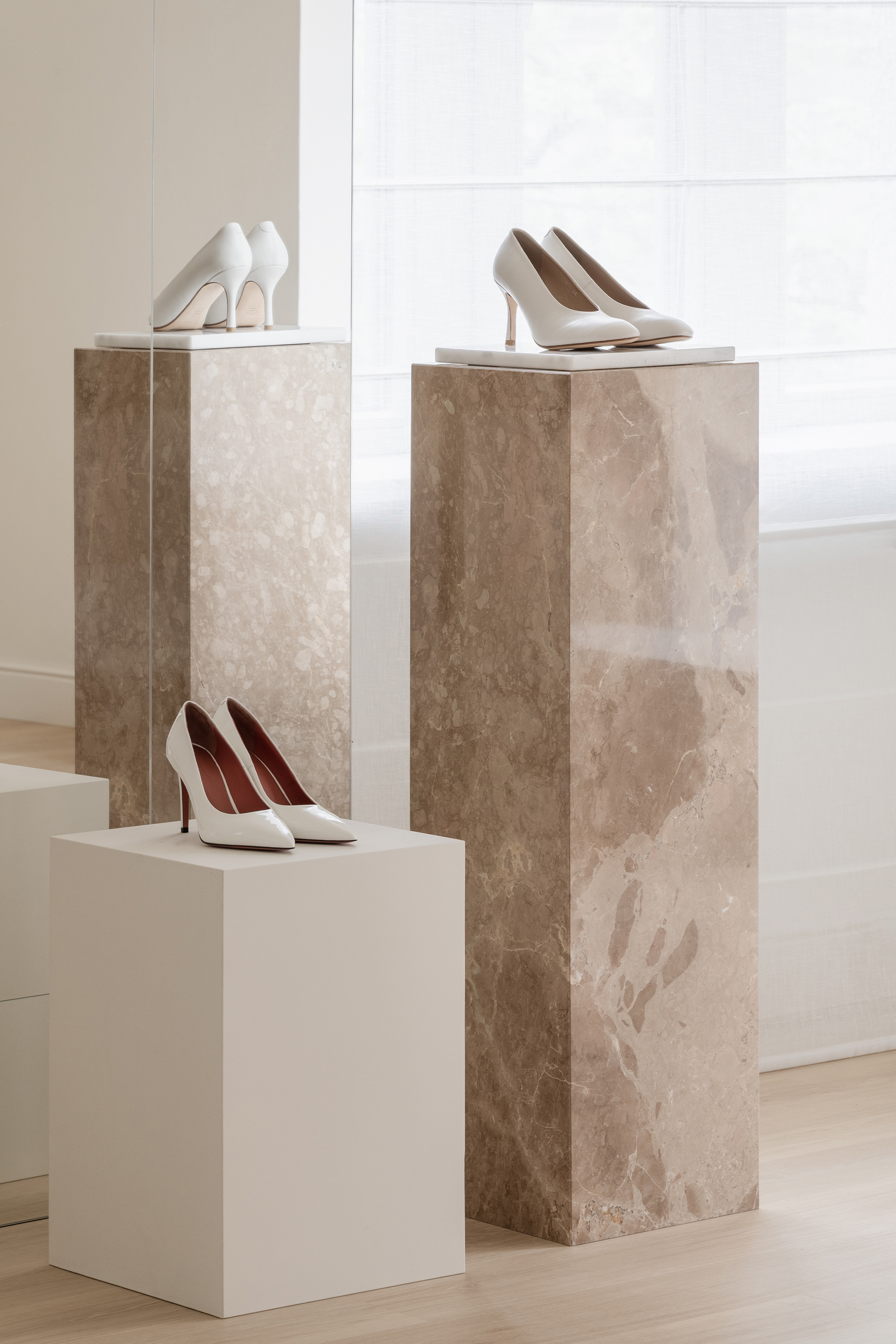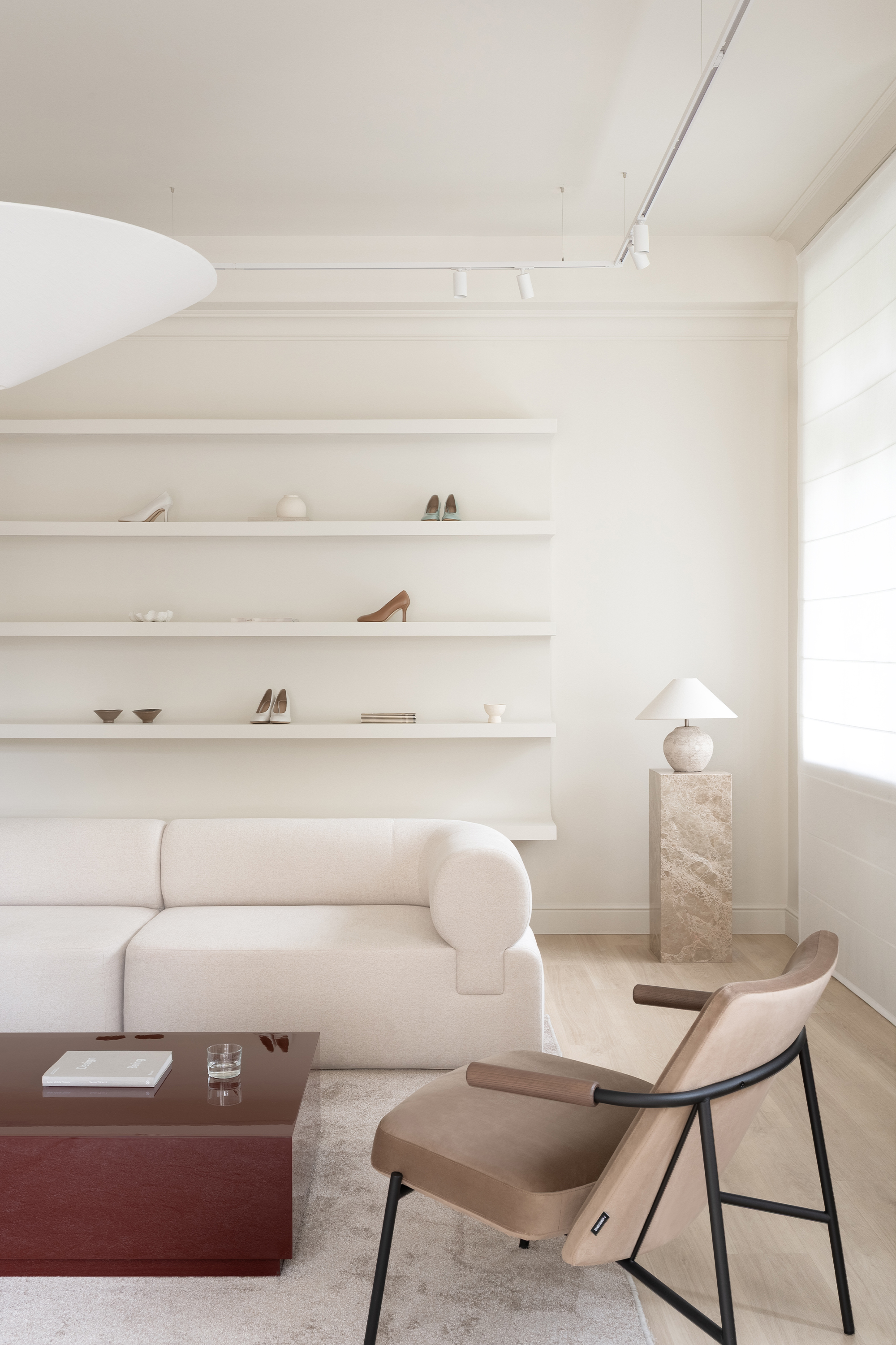 The guiding concept of the boutique is not to showcase shoes as commercial products, but to present them as refined art objects within a cultivated domestic setting. Rather than referencing antiques or traditional symbols of status, horizontal surfaces are dedicated entirely to the brand’s creations, allowing footwear to take center stage as the true markers of taste and sophistication.