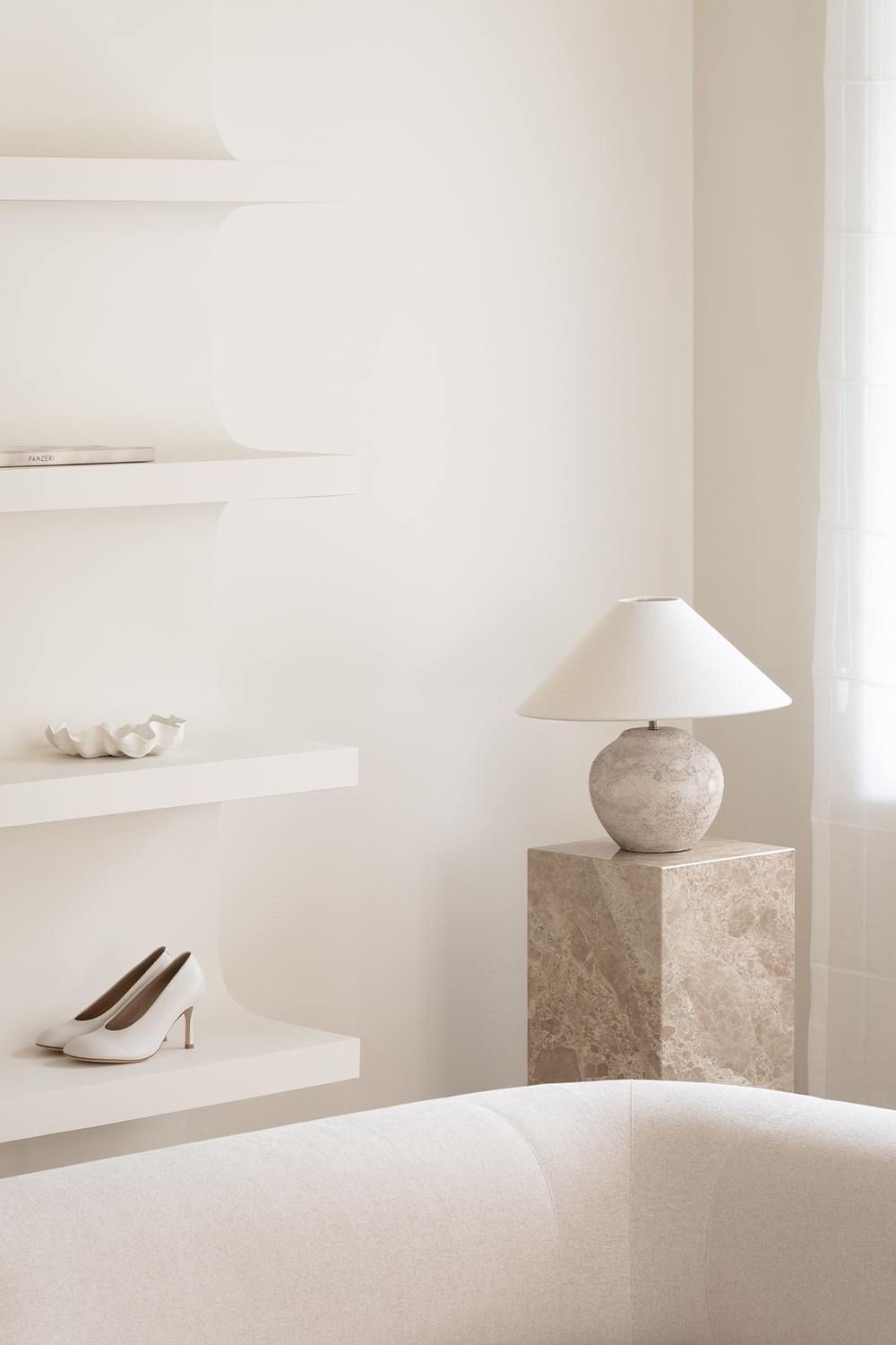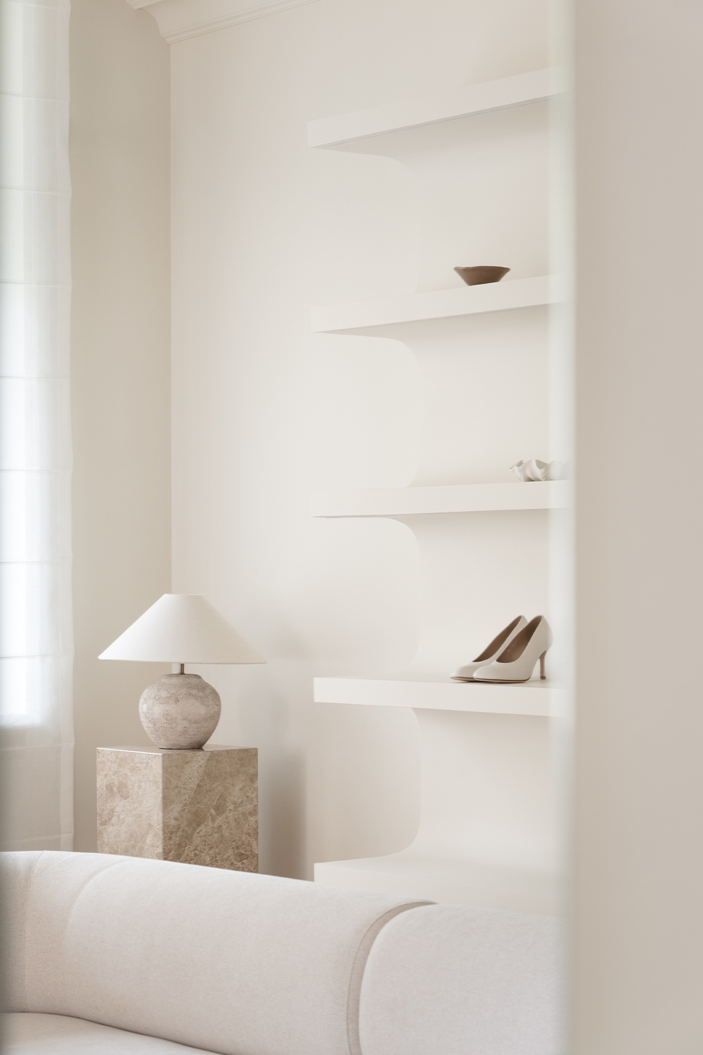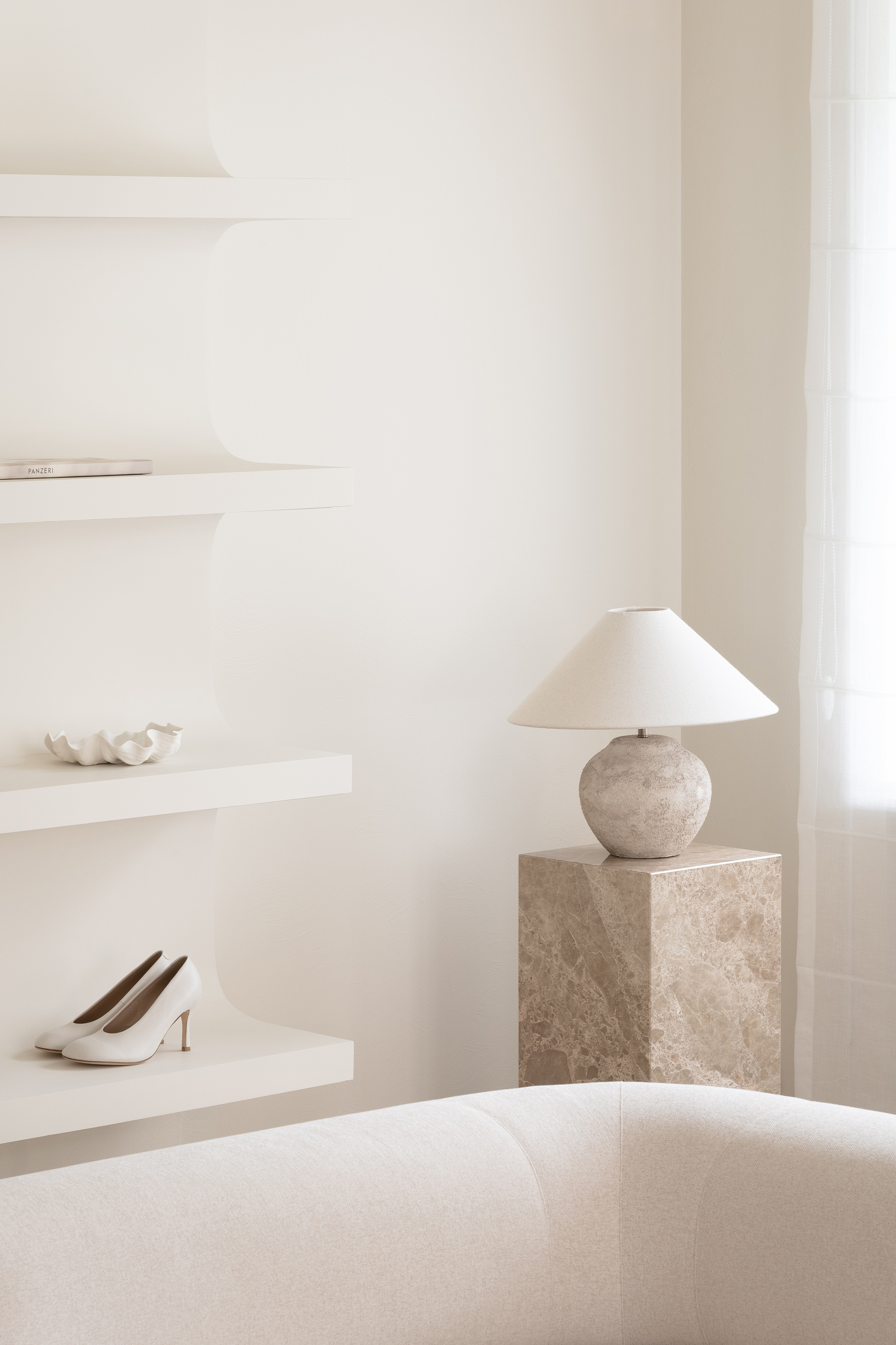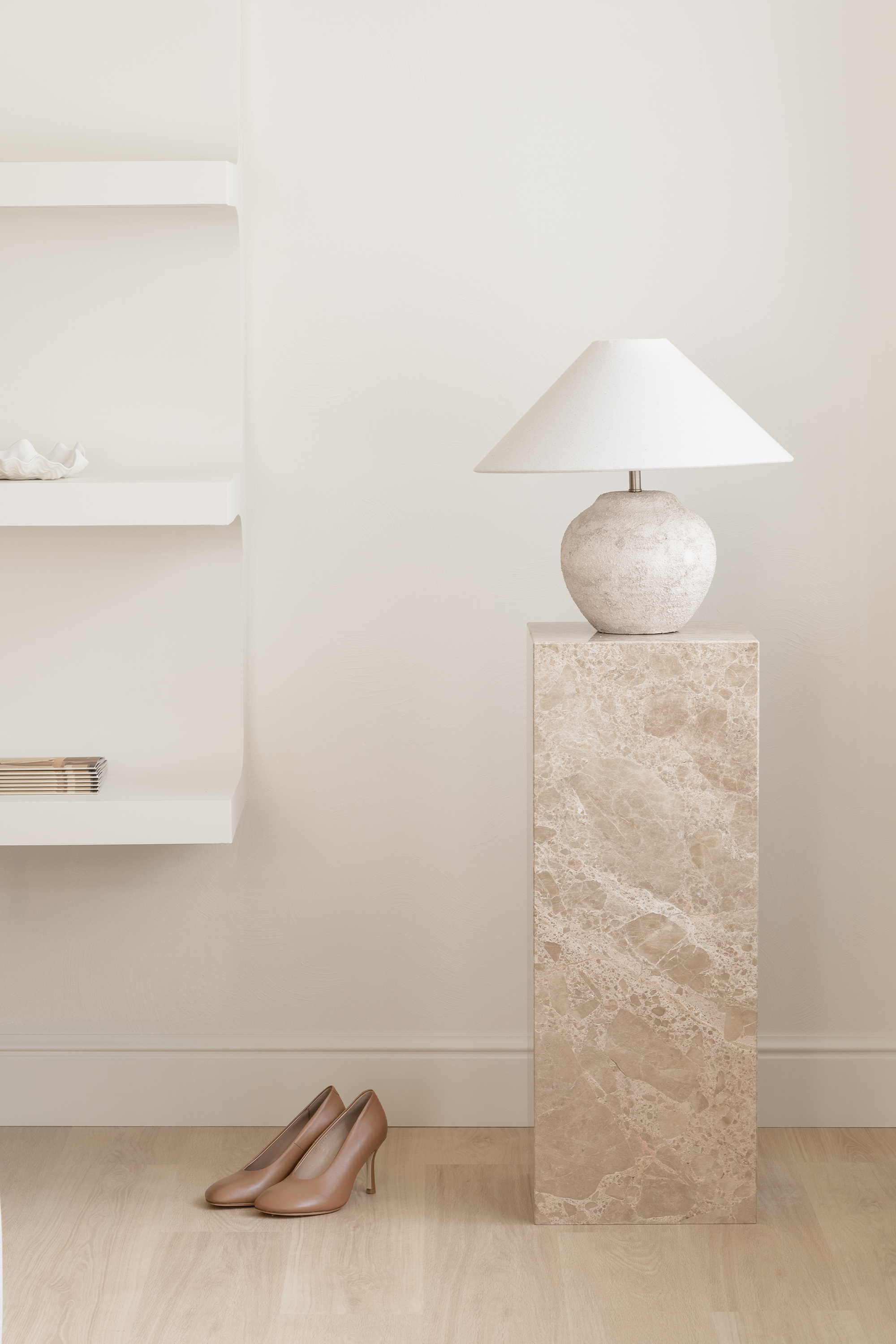 The guiding concept of the boutique is not to showcase shoes as commercial products, but to present them as refined art objects within a cultivated domestic setting. Rather than referencing antiques or traditional symbols of status, horizontal surfaces are dedicated entirely to the brand’s creations, allowing footwear to take center stage as the true markers of taste and sophistication.