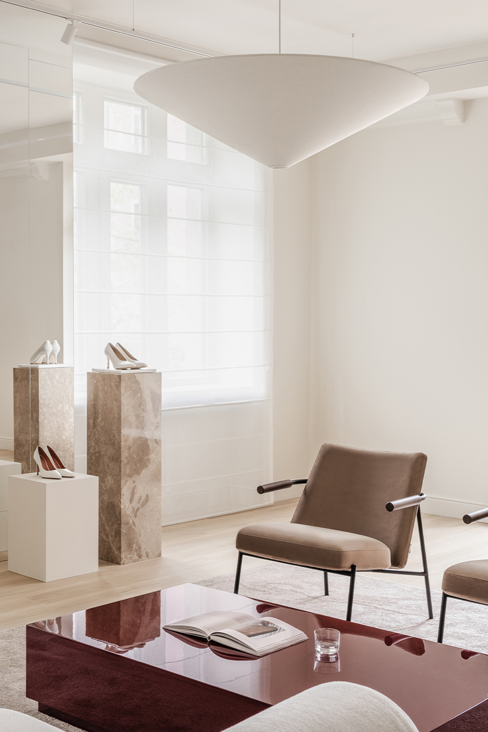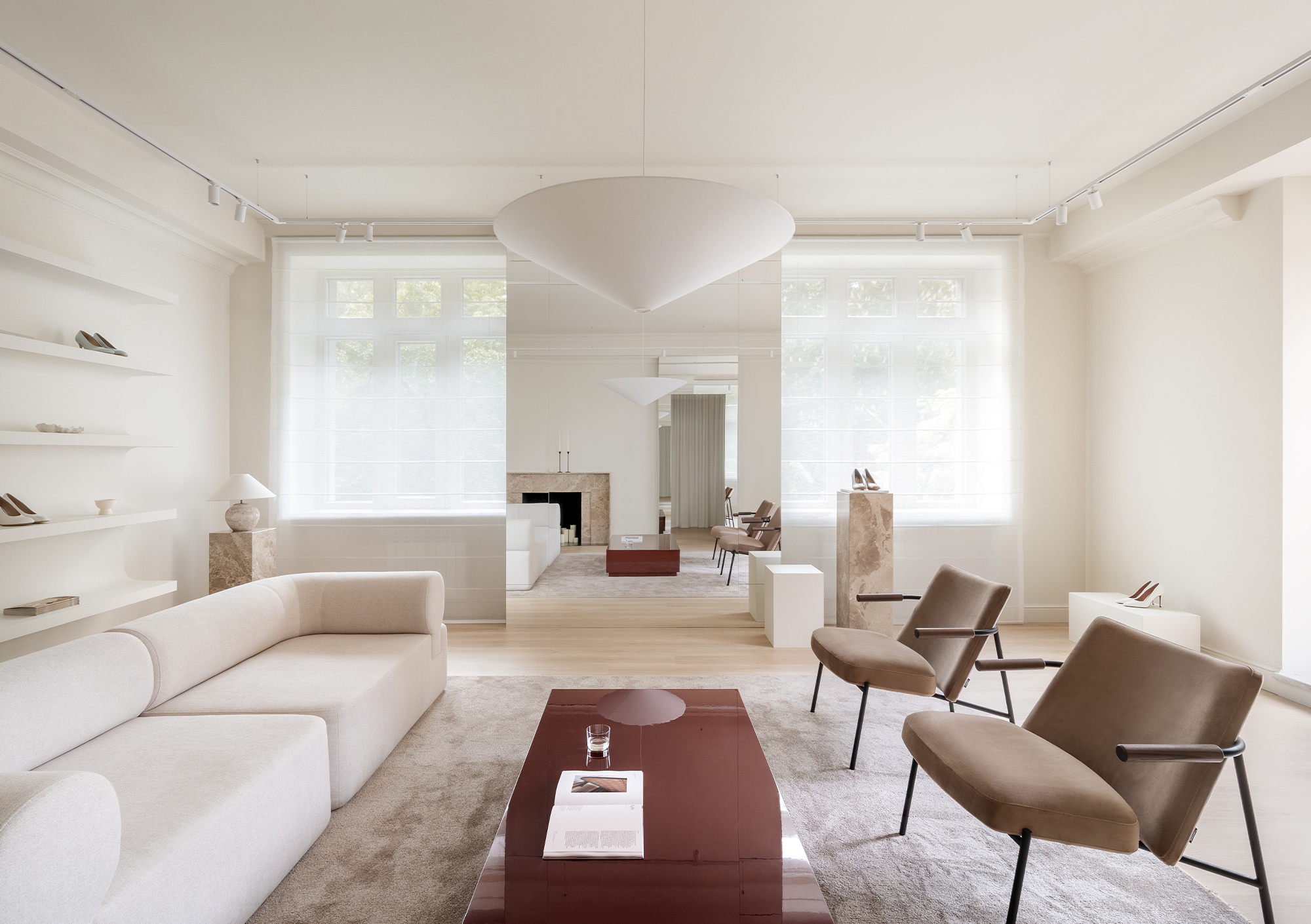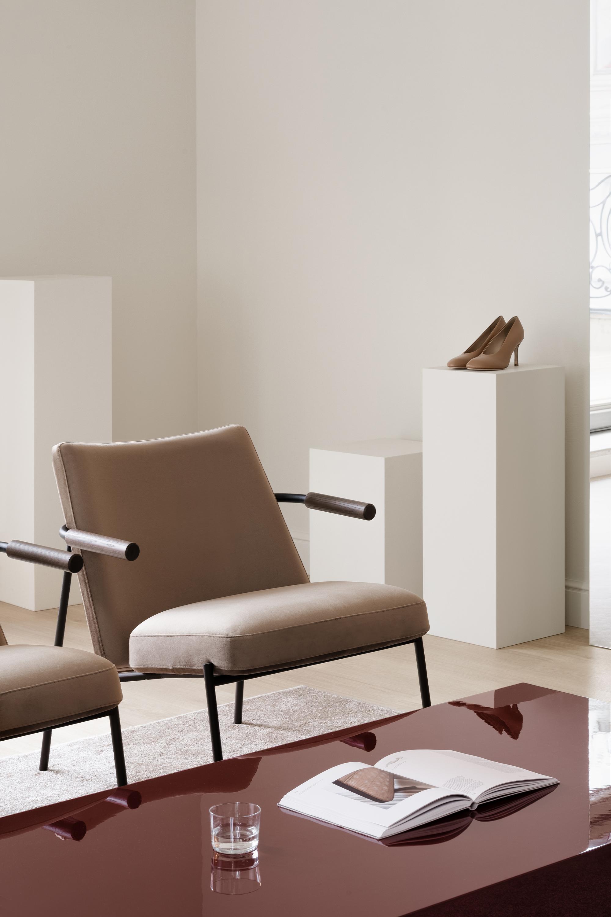 Material choices balance tactility and elegance: matte wood and textiles bring warmth, while polished marble and the glossy statement coffee table inject sophistication and dynamism. The latter, produced after several rounds of lacquering and sanding to achieve a flawless finish, became so central that its deep hue was later adopted into the brand’s visual identity.