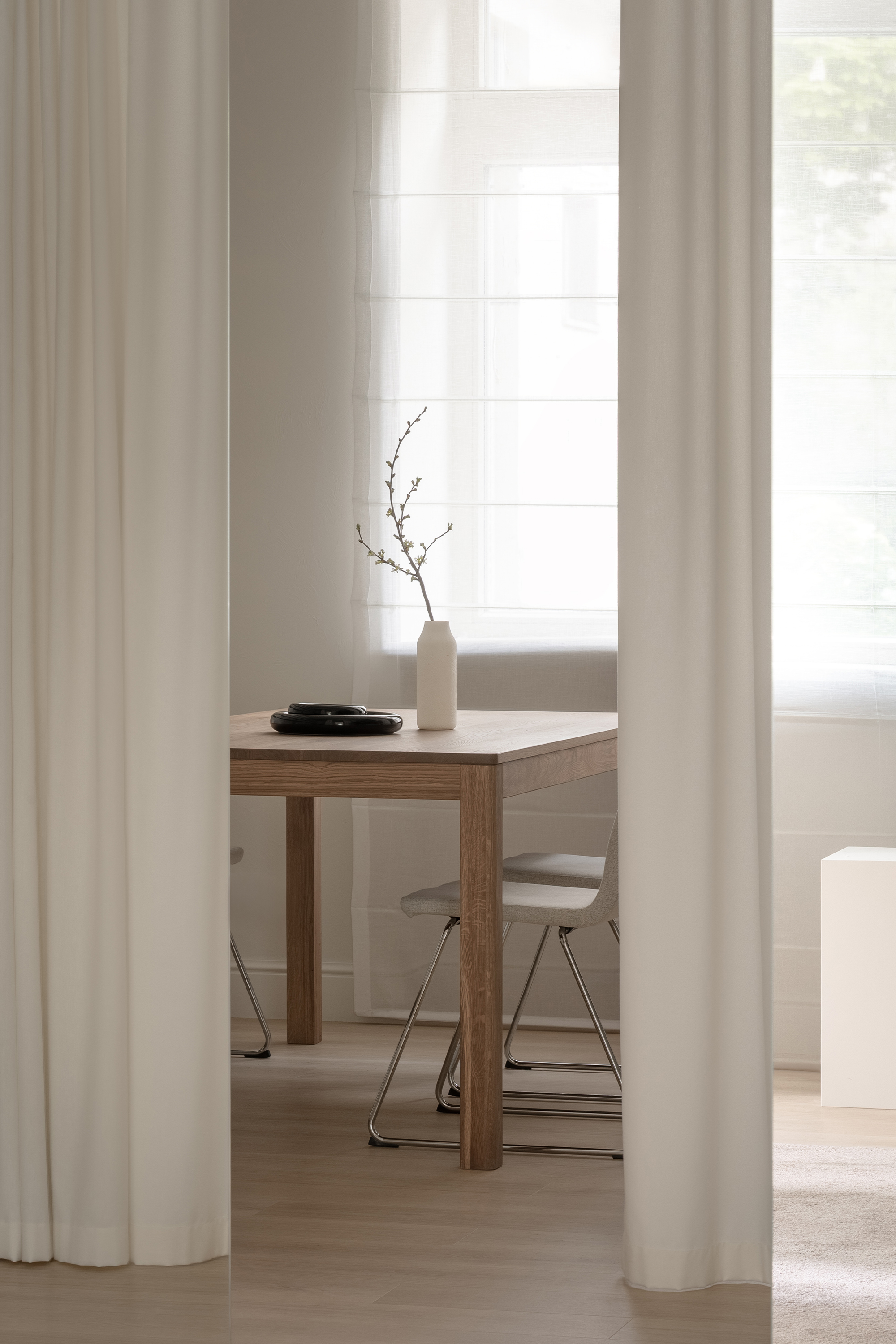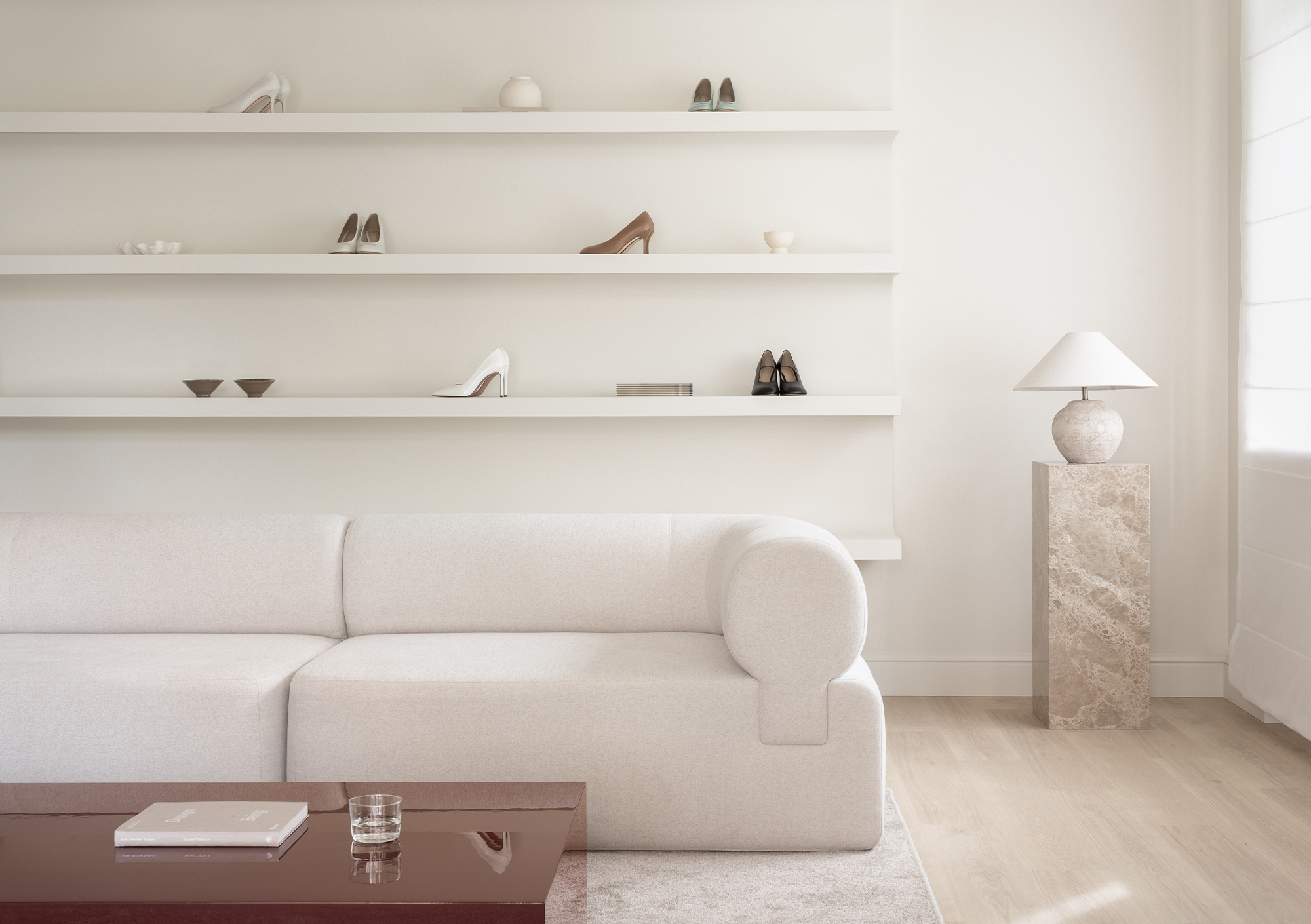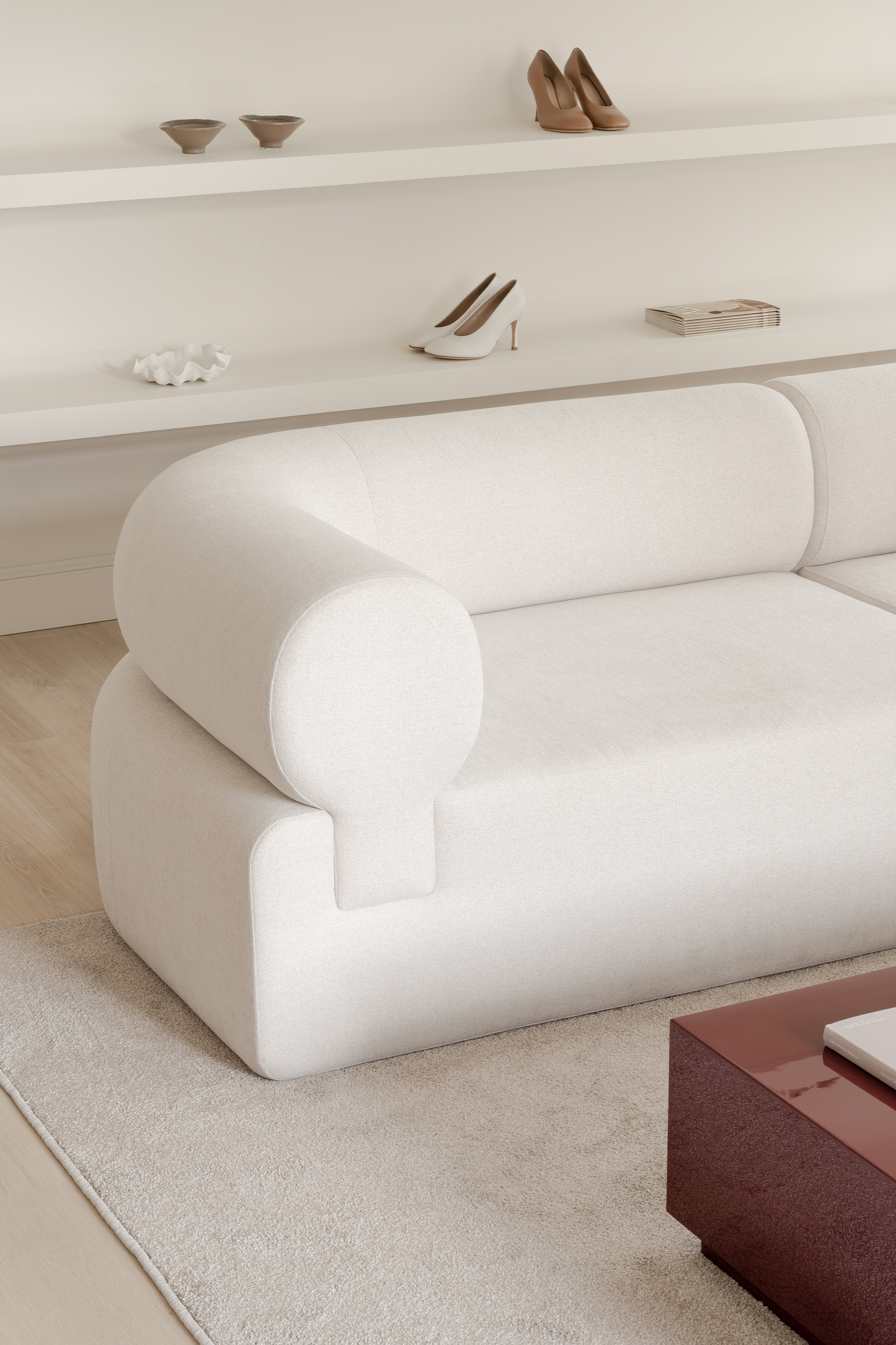 Material choices balance tactility and elegance: matte wood and textiles bring warmth, while polished marble and the glossy statement coffee table inject sophistication and dynamism. The latter, produced after several rounds of lacquering and sanding to achieve a flawless finish, became so central that its deep hue was later adopted into the brand’s visual identity.