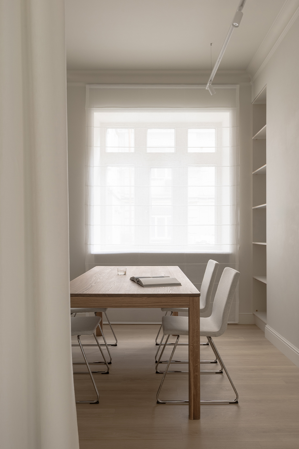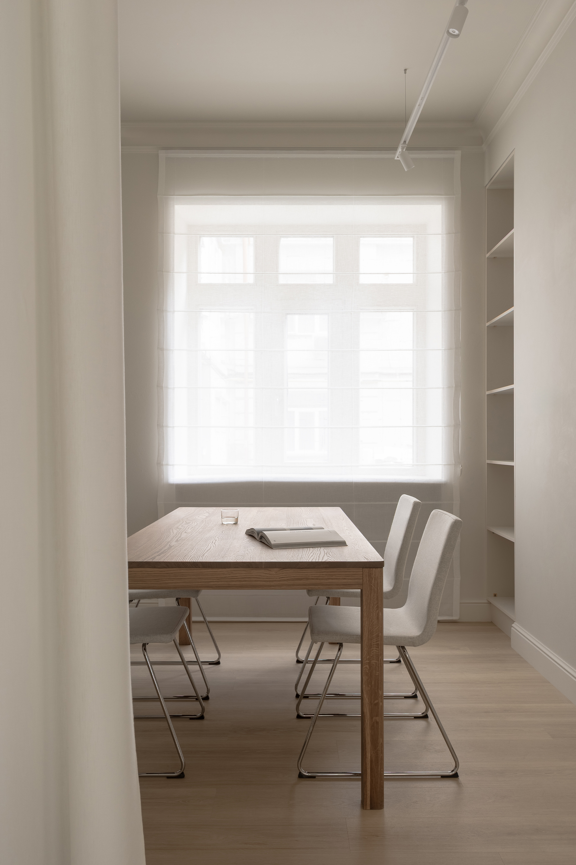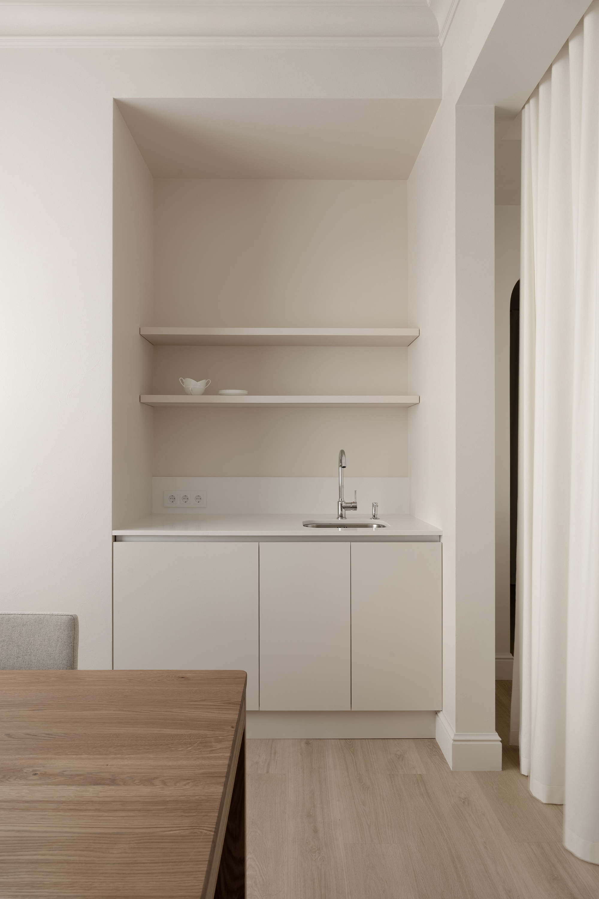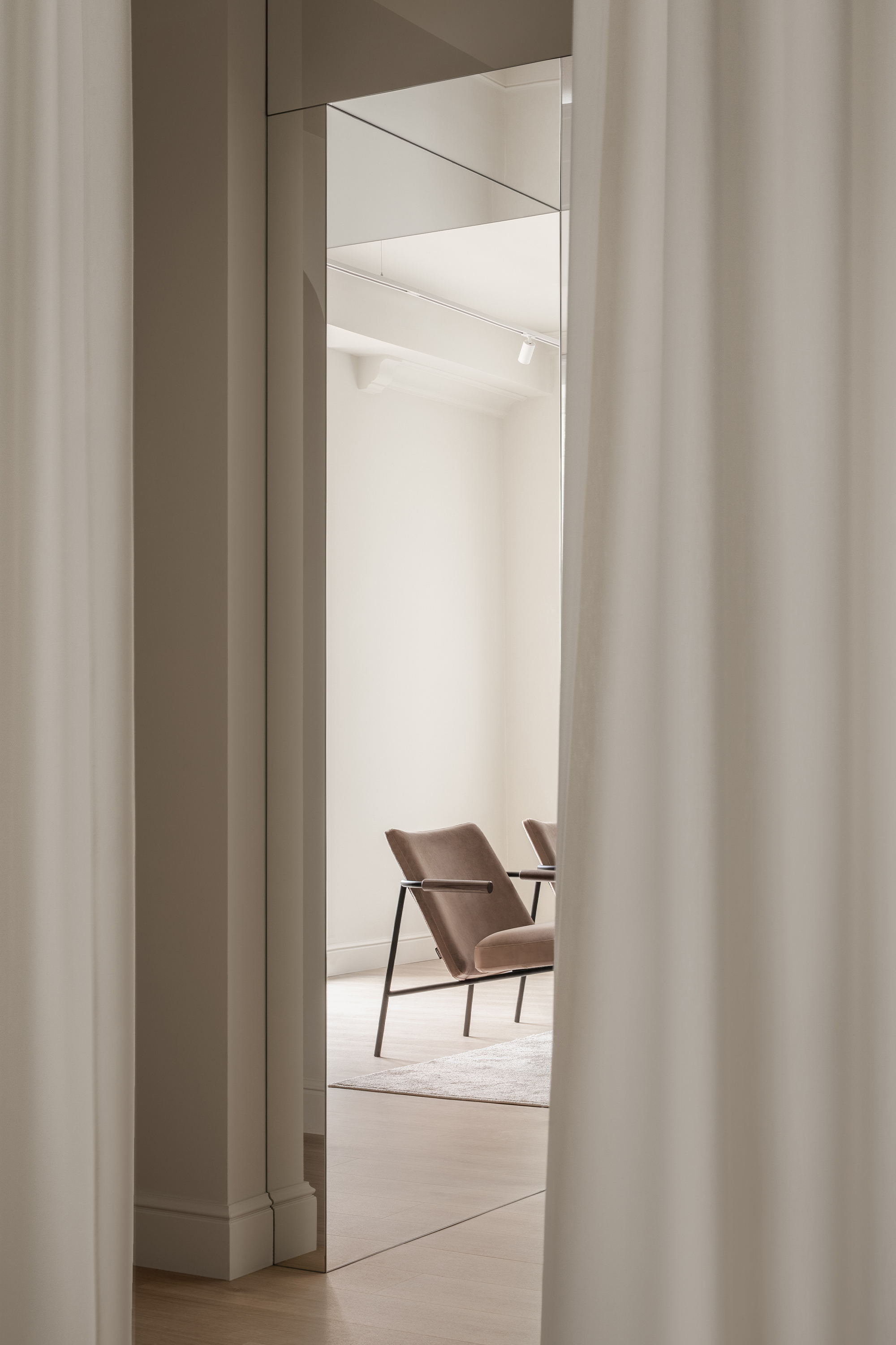 Lighting plays a central role in defining atmosphere and flexibility. Multiple scenarios were planned: the NO11 pendant lamp by Litvinenko Design anchors the seating area, while table lamps and candlelight in the faux fireplace create intimacy. Discreet shelf and mirror backlighting highlights the footwear and adds depth. In the corridor, soft light filtering through draped textiles introduces rhythm and drama.